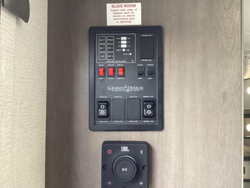 Includes power tongue jack, power awning with LED lights, pass-through storage, USB ports, JBL speakers, motion-sensor lighting, and utility center access. -