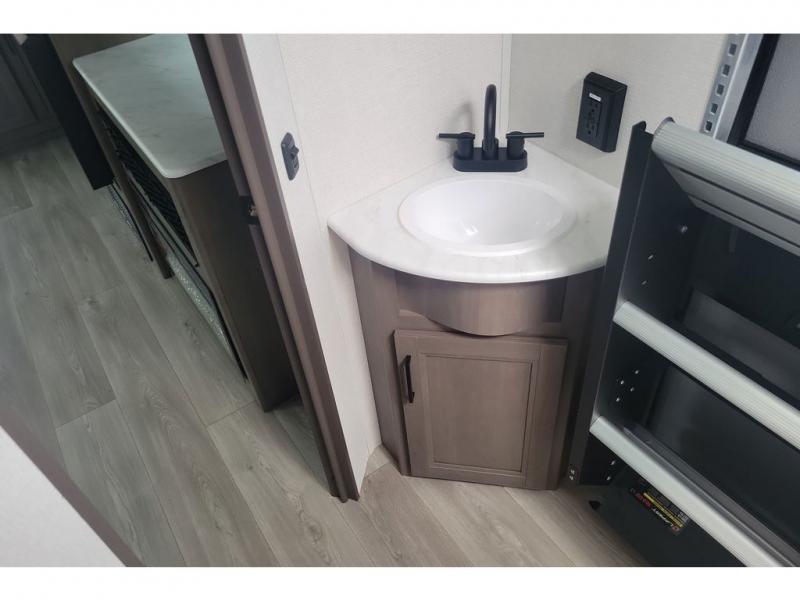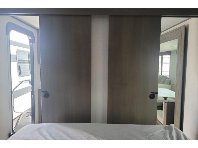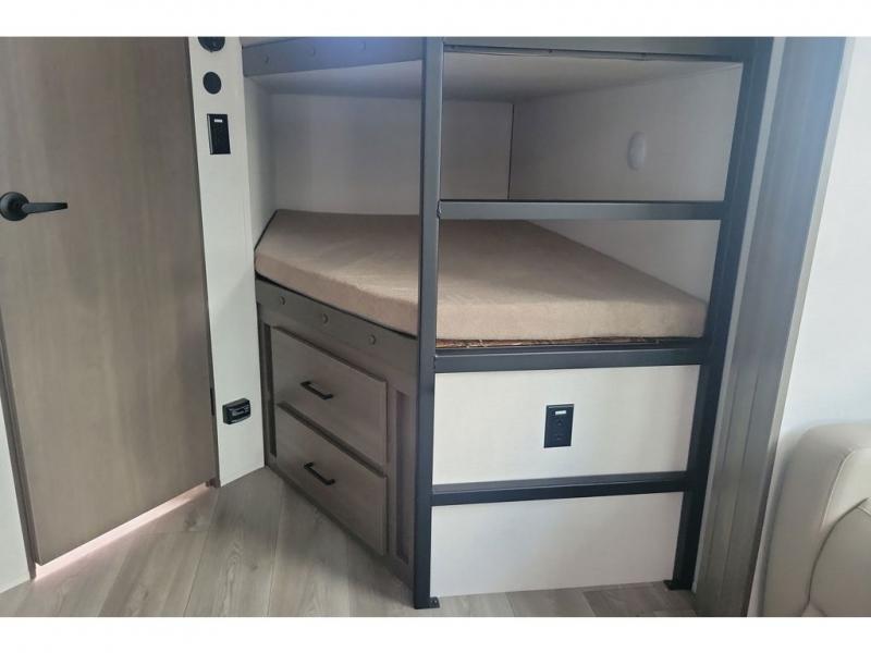 Get ready to take your travels to new heights with our incredible luxury travel trailer! The front bedroom has a queen bed, wardrobe, and overhead cabinets for all your favorite belongings, the perfect place to relax and recharge after a long day of adventure. The living room/kitchen combined area is equipped with a U-shaped dinette, three-burner cooktop, microwave, refrigerator, pantry, and 62” theater seating. Perfect for cooking up your favorite meals, entertaining friends and family, or simply relaxing and enjoying the comforts of home. The full bathroom is spacious and complete with a linen closet for added convenience. And with double-sized bunk beds featuring curtains and under-bunk storage, the kids will have their cozy retreat. But the adventure doesn't stop there! Outside, you'll find an exterior griddle with a 1.7 refrigerator, perfect for cooking up a storm in the great outdoors. And with a massive 19’ awning, you'll have plenty of shade and protection from the elements, plus, with two entry/exit doors and pass-through storage, you'll have easy access to the trailer and all your gear.
