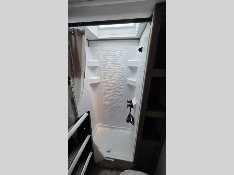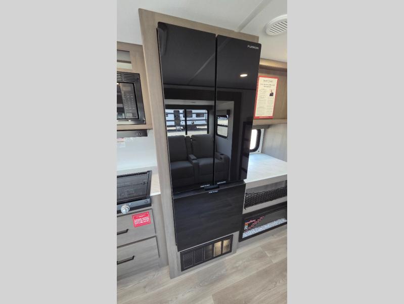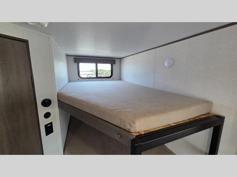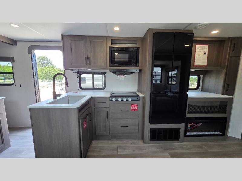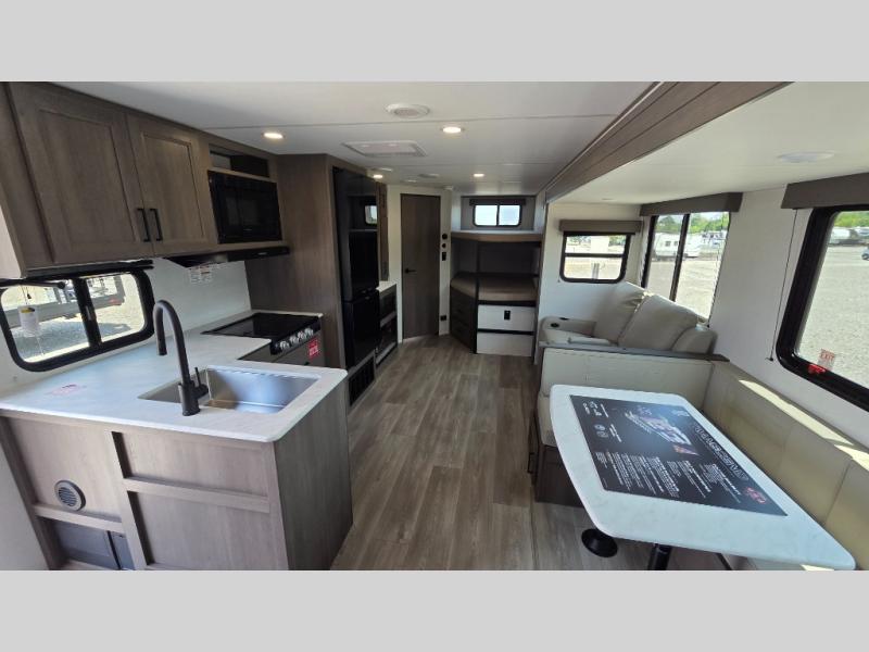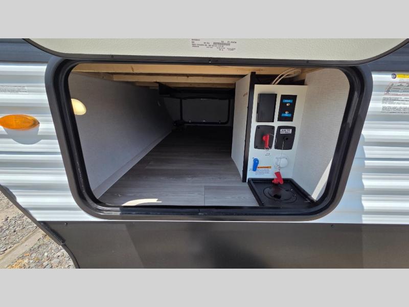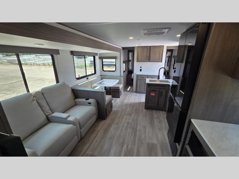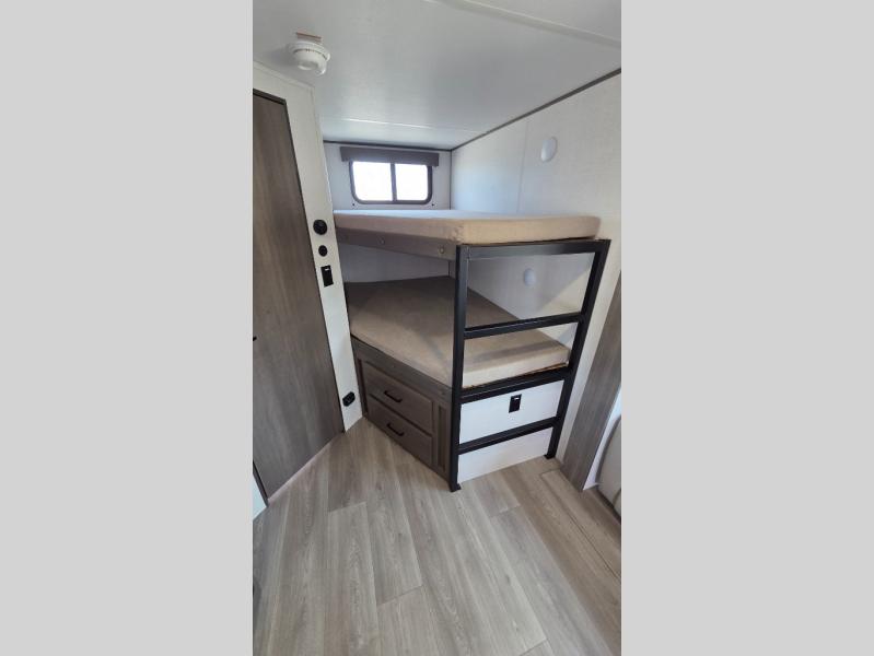 Get ready to take your travels to new heights with our incredible luxury travel trailer! The front bedroom has a queen bed, wardrobe, and overhead cabinets for all your favorite belongings, the perfect place to relax and recharge after a long day of adventure. The living room/kitchen combined area is equipped with a U-shaped dinette, three-burner cooktop, microwave, refrigerator, pantry, and 62” theater seating. Perfect for cooking up your favorite meals, entertaining friends and family, or simply relaxing and enjoying the comforts of home. The full bathroom is spacious and complete with a linen closet for added convenience. And with double-sized bunk beds featuring curtains and under-bunk storage, the kids will have their cozy retreat. But the adventure doesn't stop there! Outside, you'll find an exterior griddle with a 1.7 refrigerator, perfect for cooking up a storm in the great outdoors. And with a massive 19’ awning, you'll have plenty of shade and protection from the elements, plus, with two entry/exit doors and pass-through storage, you'll have easy access to the trailer and all your gear.
