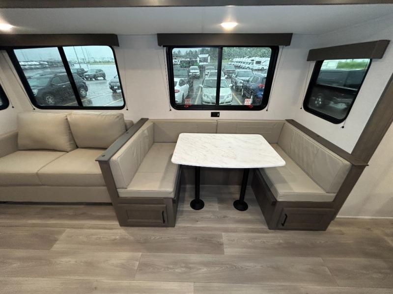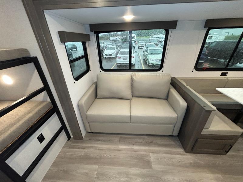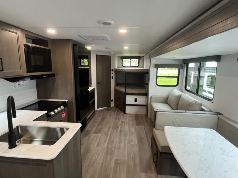Get ready to take your travels to new heights with our incredible luxury travel trailer! The front bedroom has a queen bed, wardrobe, and overhead cabinets for all your favorite belongings, the perfect place to relax and recharge after a long day of adventure. The living room/kitchen combined area is equipped with a U-shaped dinette, three-burner cooktop, microwave, refrigerator, pantry, and 62” theater seating. Perfect for cooking up your favorite meals, entertaining friends and family, or simply relaxing and enjoying the comforts of home. The full bathroom is spacious and complete with a linen closet for added convenience. And with double-sized bunk beds featuring curtains and under-bunk storage, the kids will have their cozy retreat. But the adventure doesn't stop there! Outside, you'll find an exterior griddle with a 1.7 refrigerator, perfect for cooking up a storm in the great outdoors. And with a massive 19’ awning, you'll have plenty of shade and protection from the elements, plus, with two entry/exit doors and pass-through storage, you'll have easy access to the trailer and all your gear.