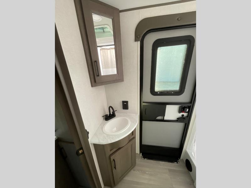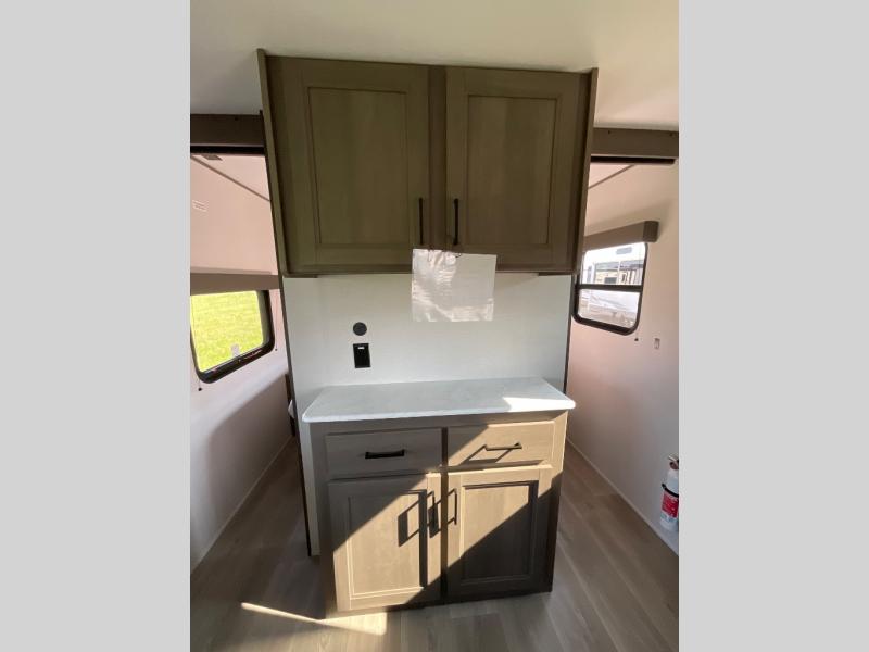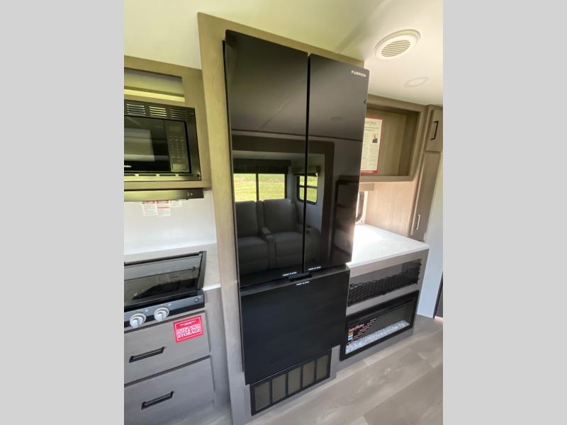 Get ready to take your travels to new heights with our incredible luxury travel trailer! The front bedroom has a queen bed, wardrobe, and overhead cabinets for all your favorite belongings, the perfect place to relax and recharge after a long day of adventure. The living room/kitchen combined area is equipped with a U-shaped dinette, three-burner cooktop, microwave, refrigerator, pantry, and 62” theater seating. Perfect for cooking up your favorite meals, entertaining friends and family, or simply relaxing and enjoying the comforts of home. The full bathroom is spacious and complete with a linen closet for added convenience. And with double-sized bunk beds featuring curtains and under-bunk storage, the kids will have their cozy retreat. But the adventure doesn't stop there! Outside, you'll find an exterior griddle with a 1.7 refrigerator, perfect for cooking up a storm in the great outdoors. And with a massive 19’ awning, you'll have plenty of shade and protection from the elements, plus, with two entry/exit doors and pass-through storage, you'll have easy access to the trailer and all your gear.