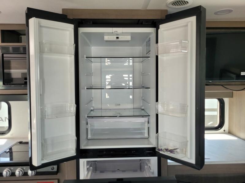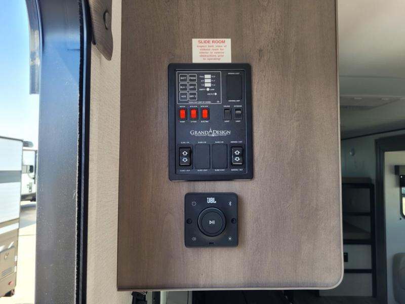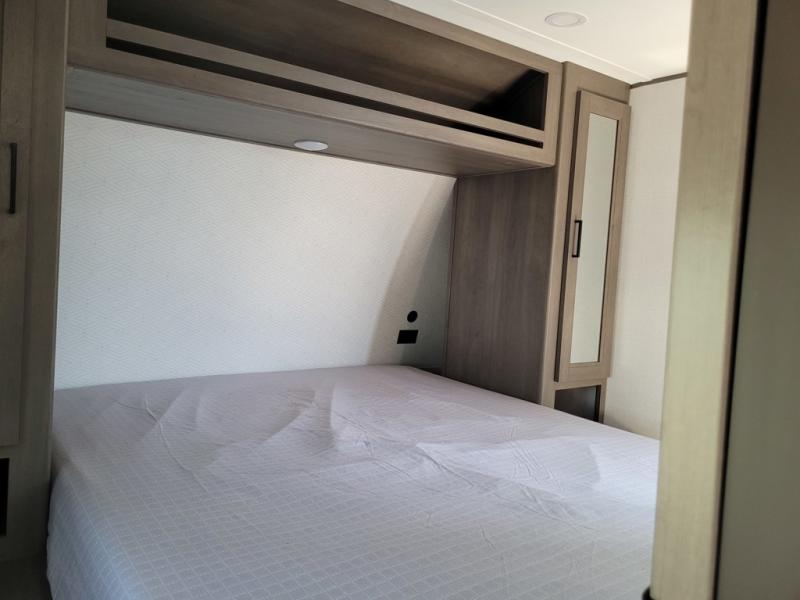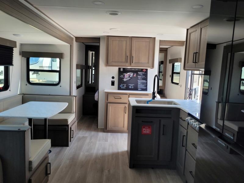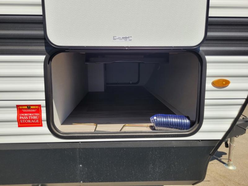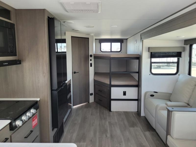 Get ready to take your travels to new heights with our incredible luxury travel trailer! The front bedroom has a queen bed, wardrobe, and overhead cabinets for all your favorite belongings, the perfect place to relax and recharge after a long day of adventure. The living room/kitchen combined area is equipped with a U-shaped dinette, three-burner cooktop, microwave, refrigerator, pantry, and 62” theater seating. Perfect for cooking up your favorite meals, entertaining friends and family, or simply relaxing and enjoying the comforts of home. The full bathroom is spacious and complete with a linen closet for added convenience. And with double-sized bunk beds featuring curtains and under-bunk storage, the kids will have their cozy retreat. But the adventure doesn't stop there! Outside, you'll find an exterior griddle with a 1.7 refrigerator, perfect for cooking up a storm in the great outdoors. And with a massive 19’ awning, you'll have plenty of shade and protection from the elements, plus, with two entry/exit doors and pass-through storage, you'll have easy access to the trailer and all your gear.