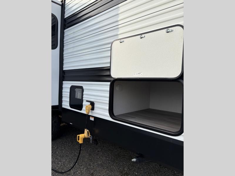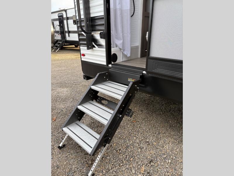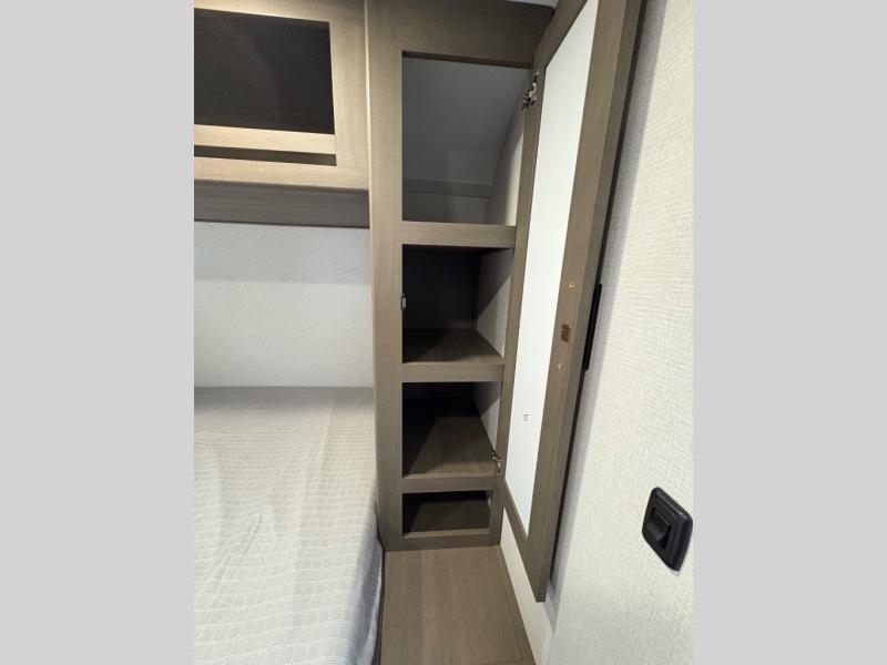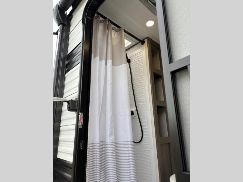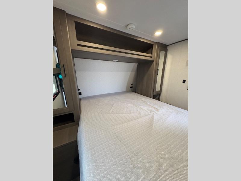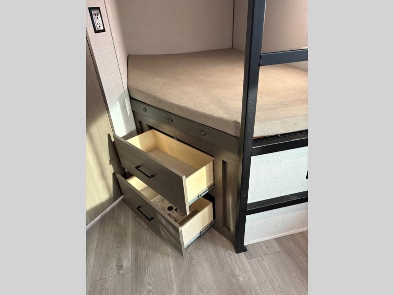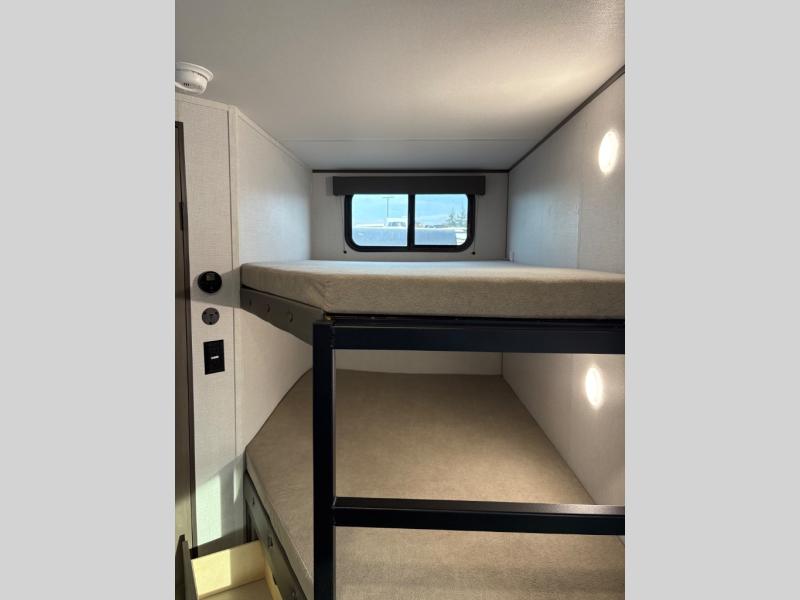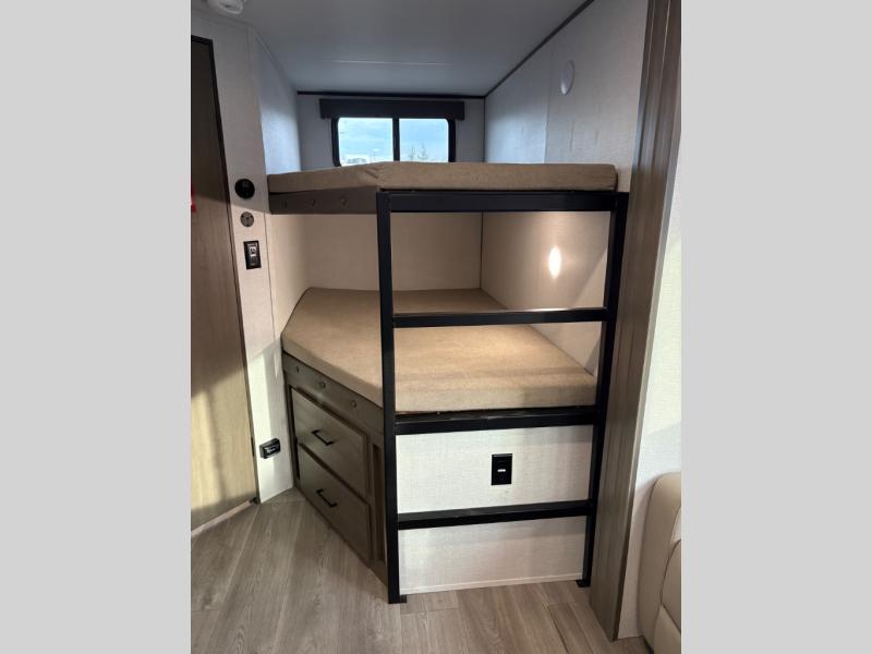Get ready to take your travels to new heights with our incredible luxury travel trailer! The front bedroom has a queen bed, wardrobe, and overhead cabinets for all your favorite belongings, the perfect place to relax and recharge after a long day of adventure. The living room/kitchen combined area is equipped with a U-shaped dinette, three-burner cooktop, microwave, refrigerator, pantry, and 62” theater seating. Perfect for cooking up your favorite meals, entertaining friends and family, or simply relaxing and enjoying the comforts of home. The full bathroom is spacious and complete with a linen closet for added convenience. And with double-sized bunk beds featuring curtains and under-bunk storage, the kids will have their cozy retreat. But the adventure doesn't stop there! Outside, you'll find an exterior griddle with a 1.7 refrigerator, perfect for cooking up a storm in the great outdoors. And with a massive 19’ awning, you'll have plenty of shade and protection from the elements, plus, with two entry/exit doors and pass-through storage, you'll have easy access to the trailer and all your gear.