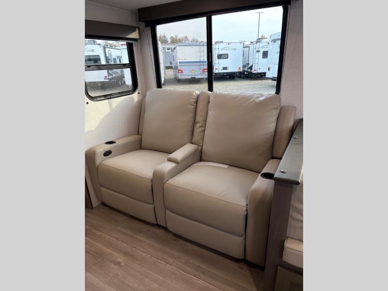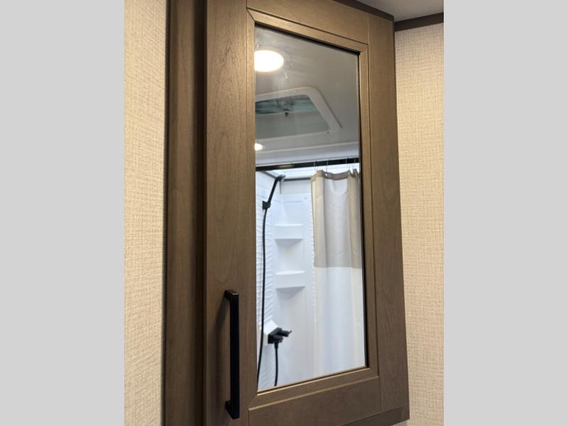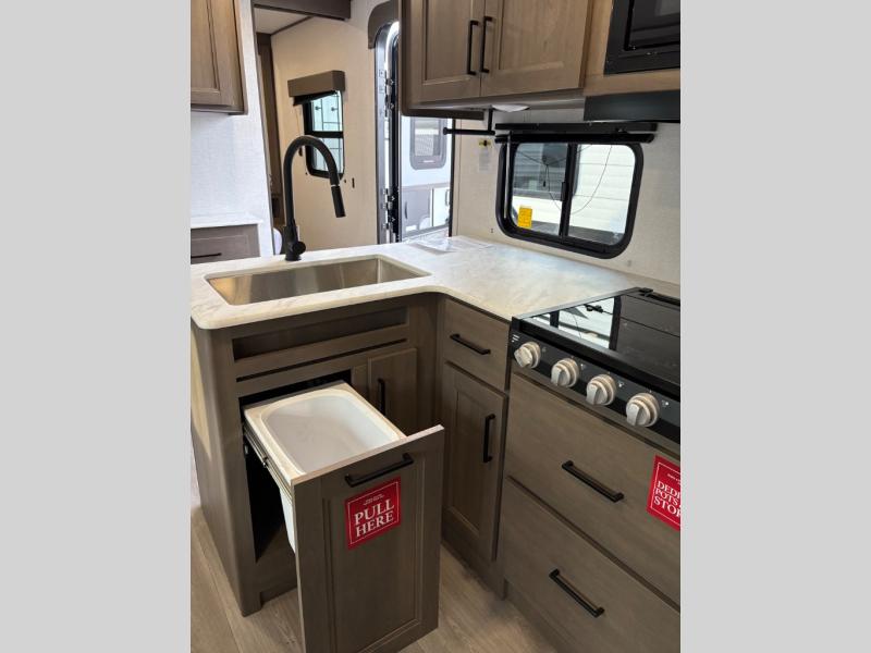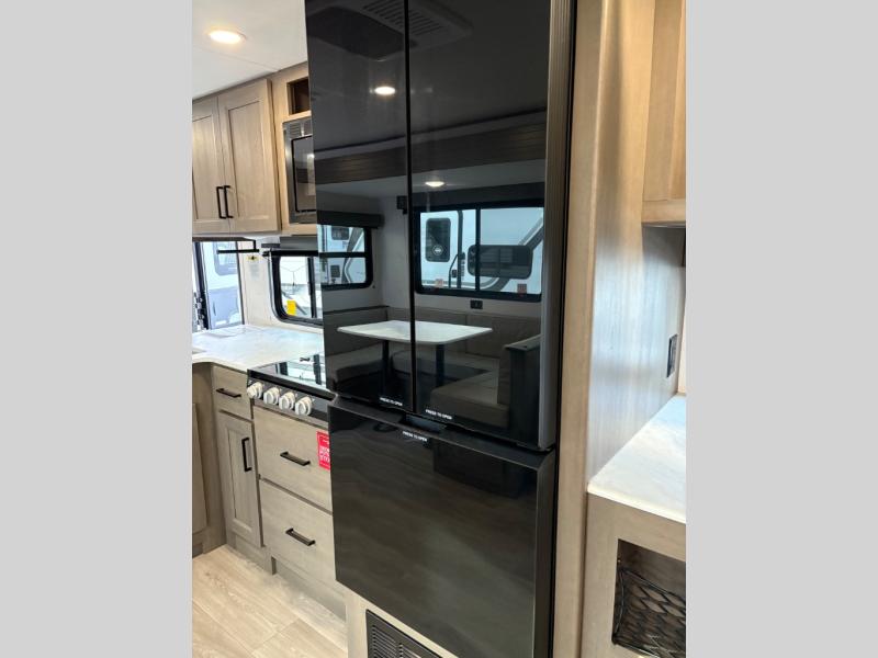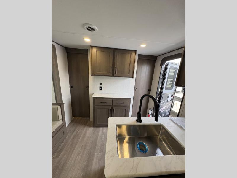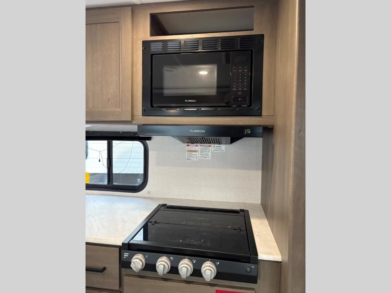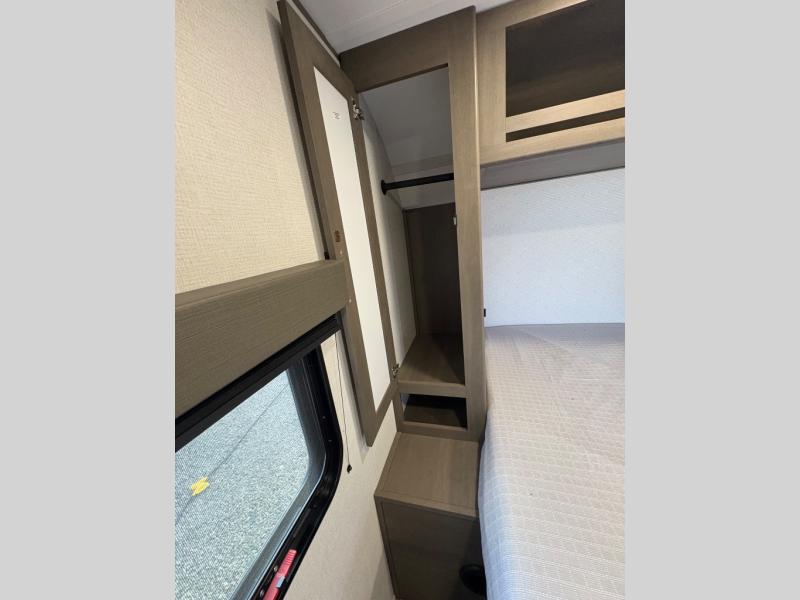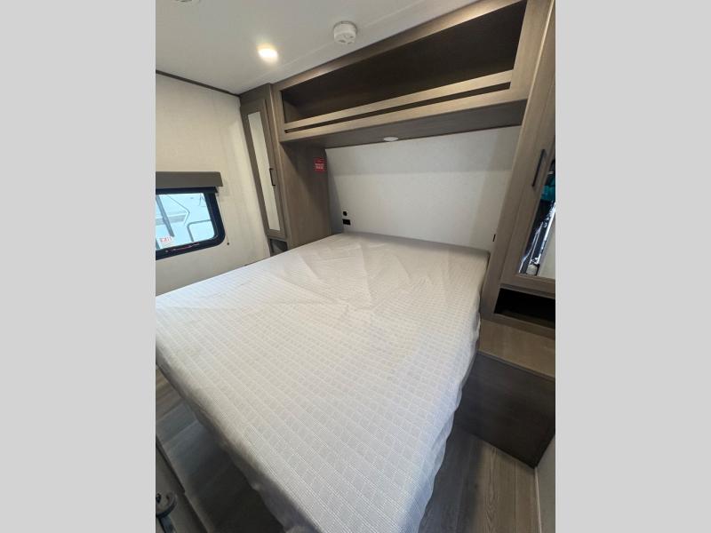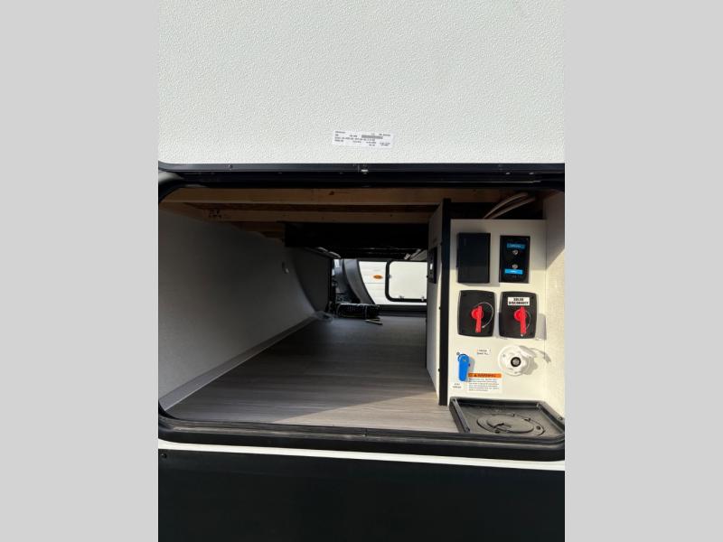 Get ready to take your travels to new heights with our incredible luxury travel trailer! The front bedroom has a queen bed, wardrobe, and overhead cabinets for all your favorite belongings, the perfect place to relax and recharge after a long day of adventure. The living room/kitchen combined area is equipped with a U-shaped dinette, three-burner cooktop, microwave, refrigerator, pantry, and 62” theater seating. Perfect for cooking up your favorite meals, entertaining friends and family, or simply relaxing and enjoying the comforts of home. The full bathroom is spacious and complete with a linen closet for added convenience. And with double-sized bunk beds featuring curtains and under-bunk storage, the kids will have their cozy retreat. But the adventure doesn't stop there! Outside, you'll find an exterior griddle with a 1.7 refrigerator, perfect for cooking up a storm in the great outdoors. And with a massive 19’ awning, you'll have plenty of shade and protection from the elements, plus, with two entry/exit doors and pass-through storage, you'll have easy access to the trailer and all your gear.
