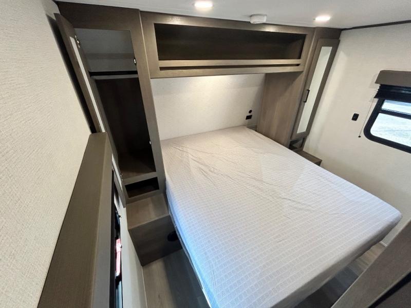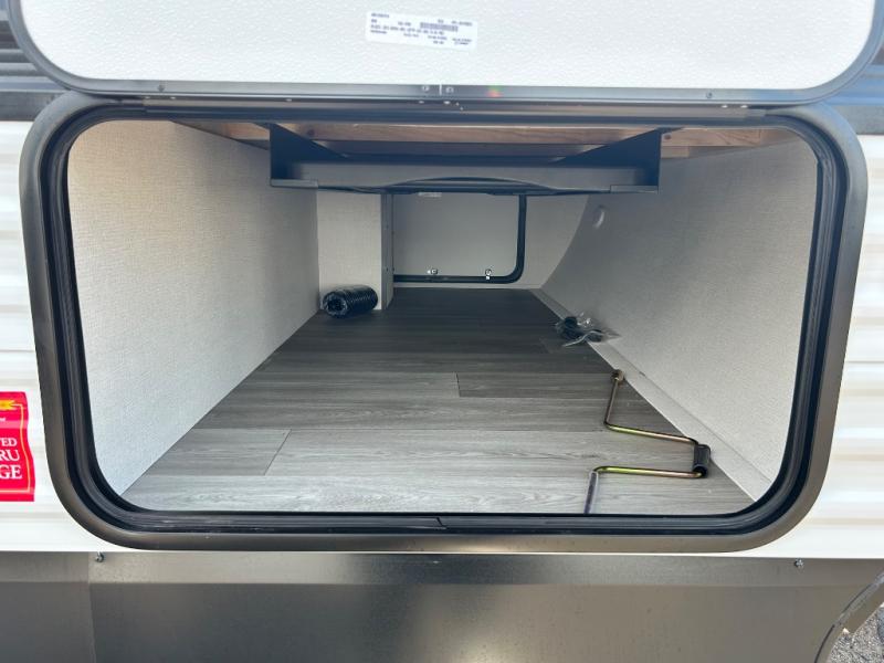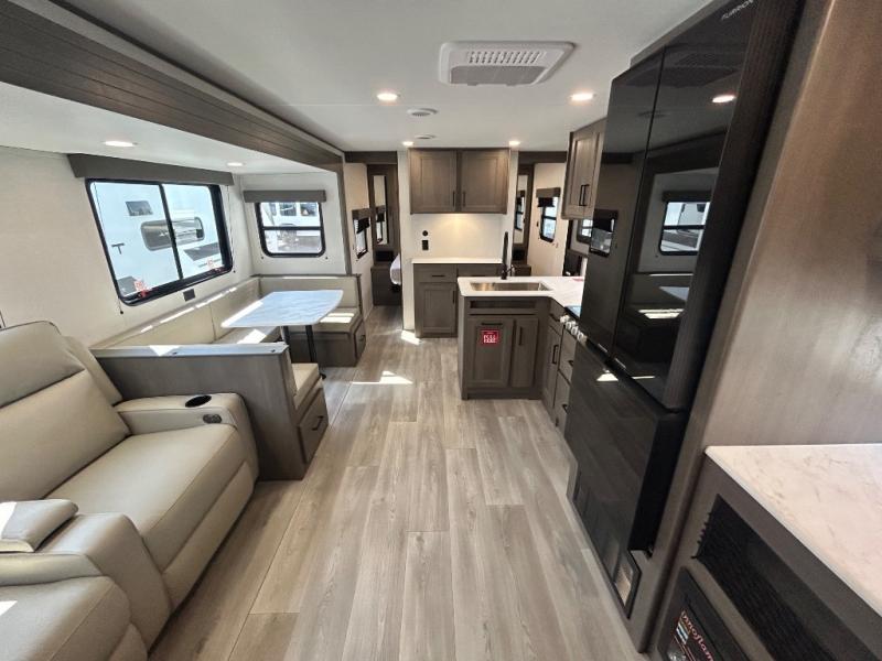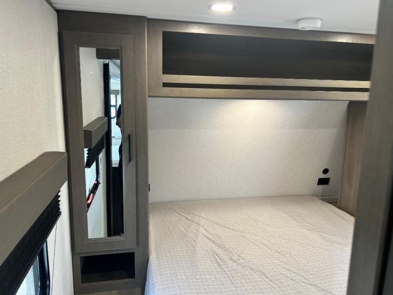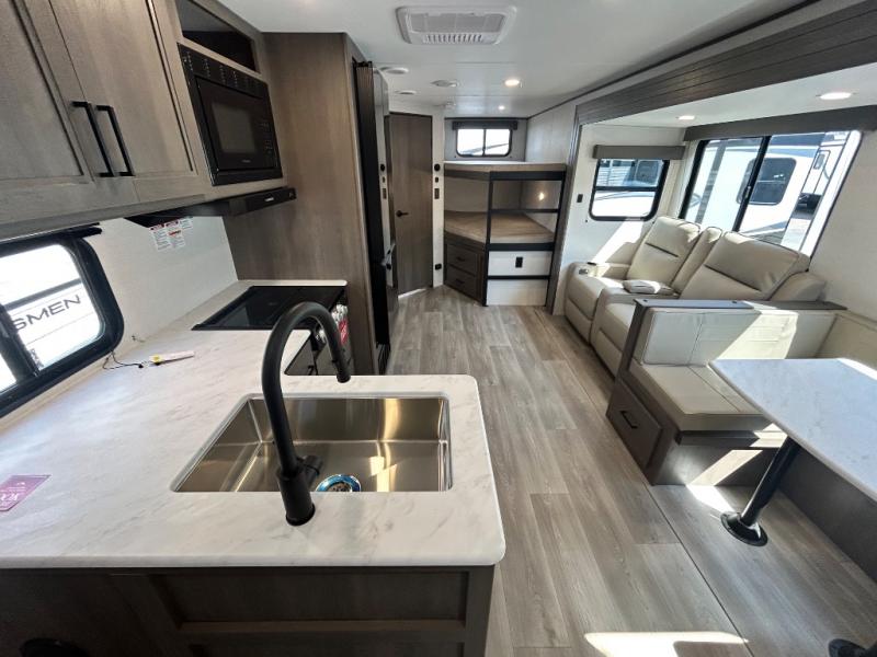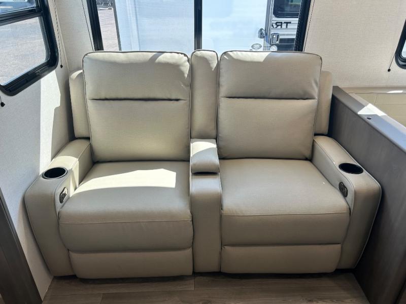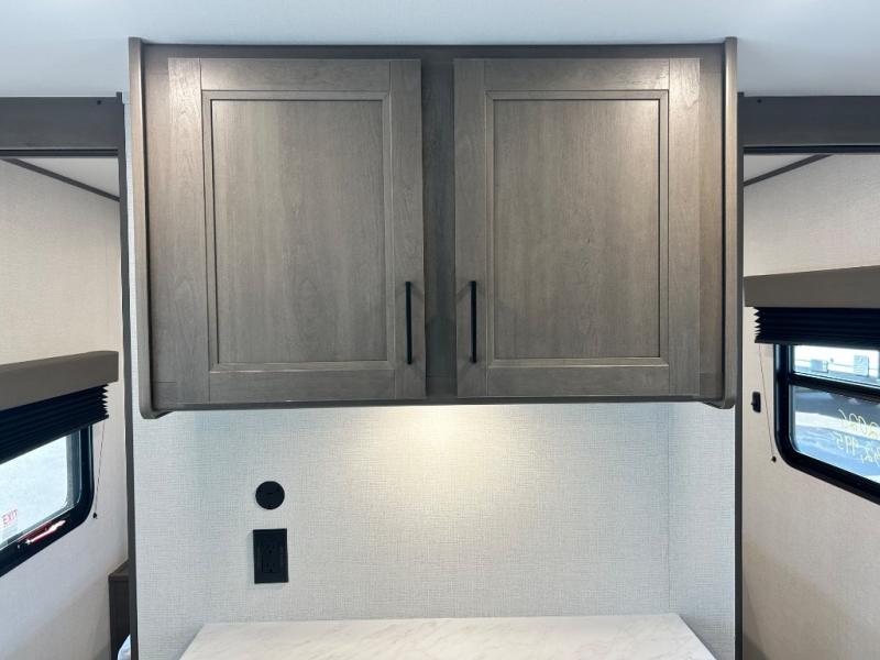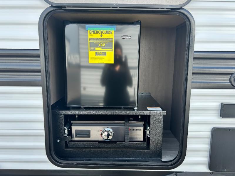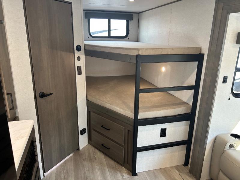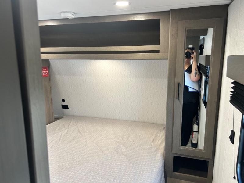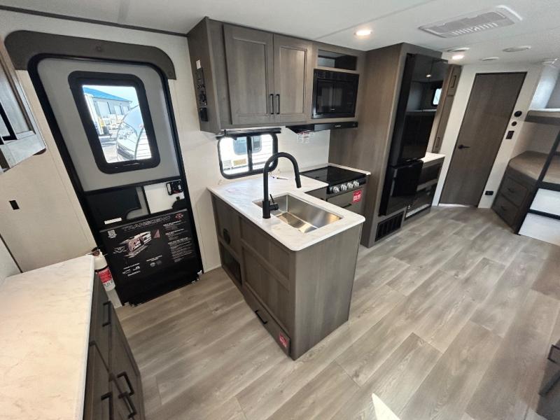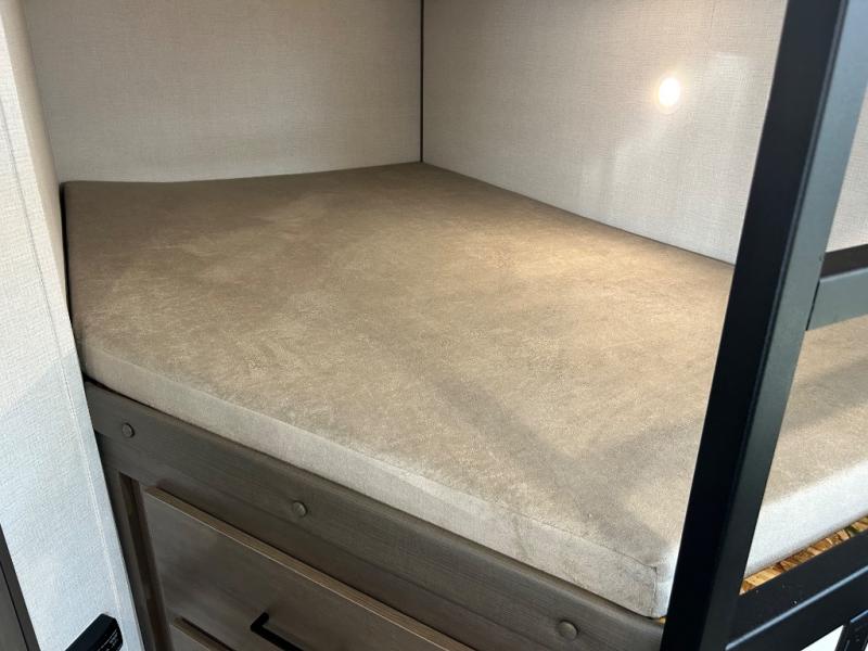 Get ready to take your travels to new heights with our incredible luxury travel trailer! The front bedroom has a queen bed, wardrobe, and overhead cabinets for all your favorite belongings, the perfect place to relax and recharge after a long day of adventure. The living room/kitchen combined area is equipped with a U-shaped dinette, three-burner cooktop, microwave, refrigerator, pantry, and 62” theater seating. Perfect for cooking up your favorite meals, entertaining friends and family, or simply relaxing and enjoying the comforts of home. The full bathroom is spacious and complete with a linen closet for added convenience. And with double-sized bunk beds featuring curtains and under-bunk storage, the kids will have their cozy retreat. But the adventure doesn't stop there! Outside, you'll find an exterior griddle with a 1.7 refrigerator, perfect for cooking up a storm in the great outdoors. And with a massive 19’ awning, you'll have plenty of shade and protection from the elements, plus, with two entry/exit doors and pass-through storage, you'll have easy access to the trailer and all your gear.