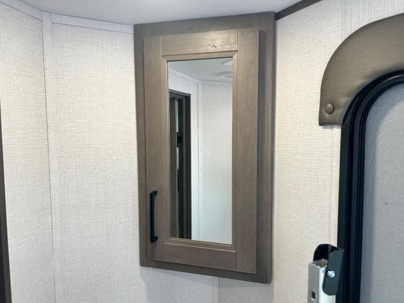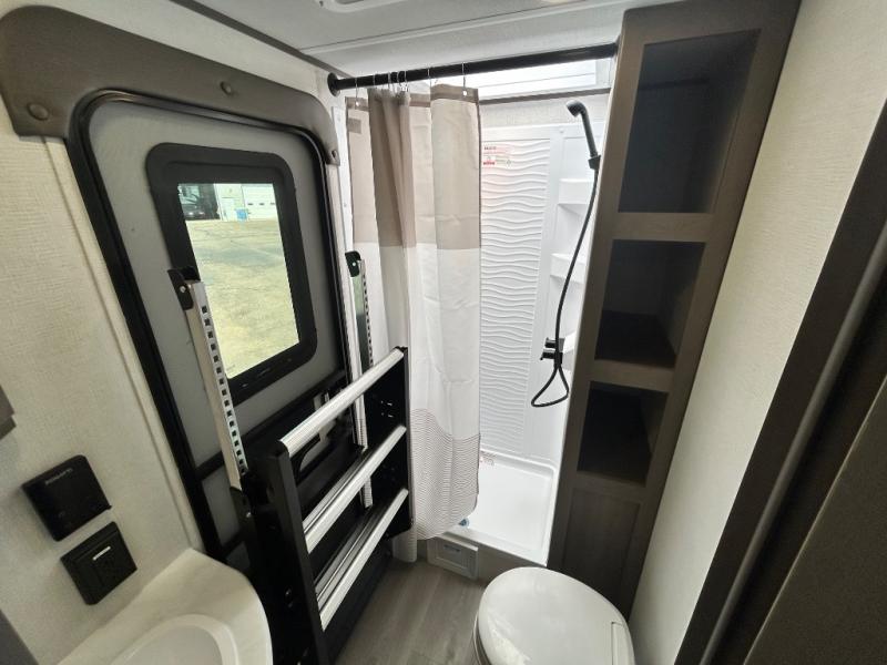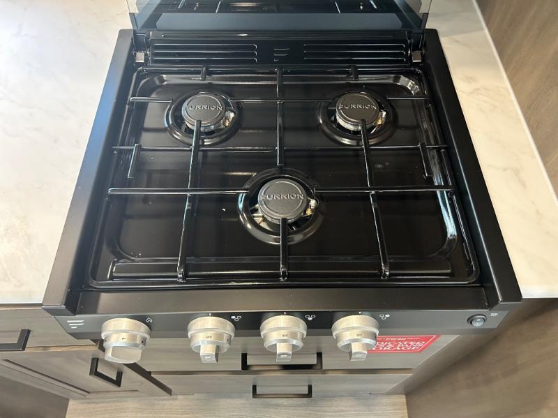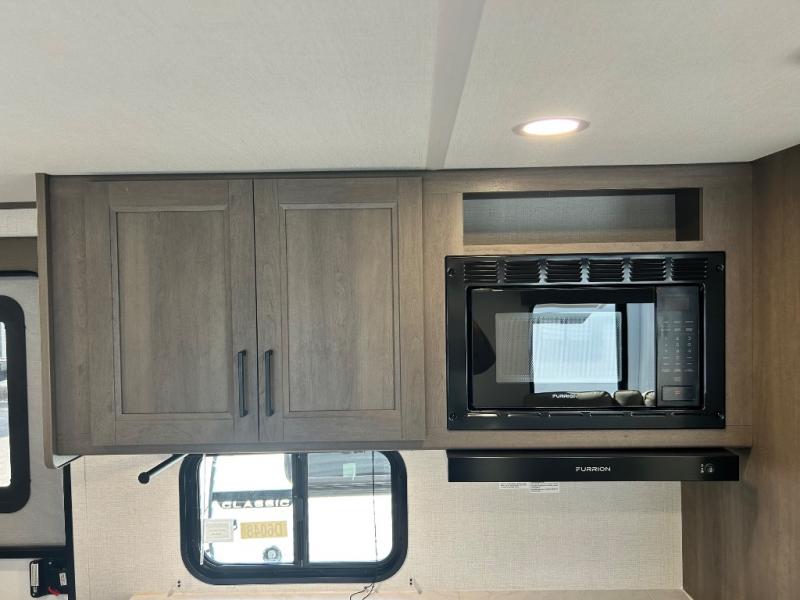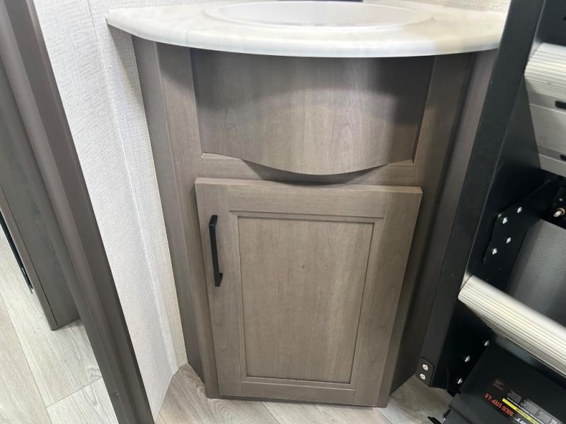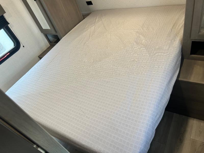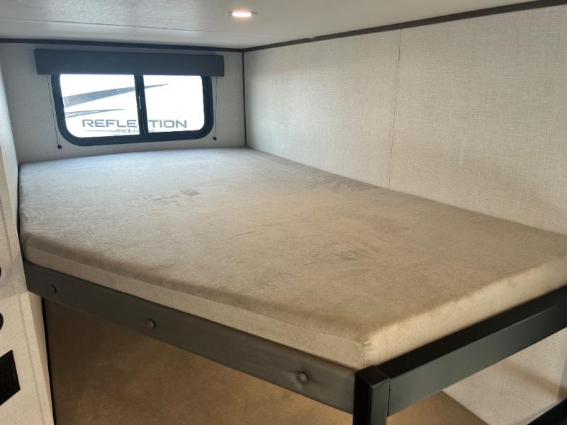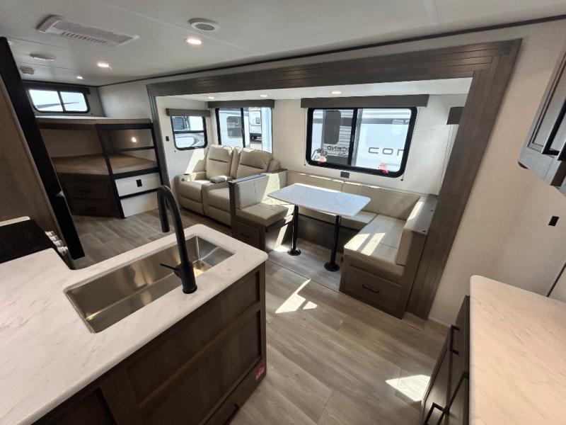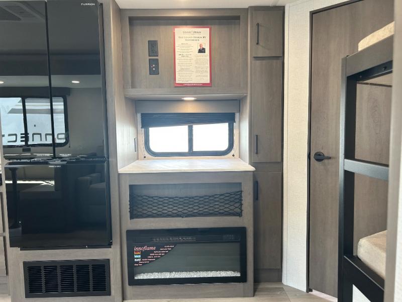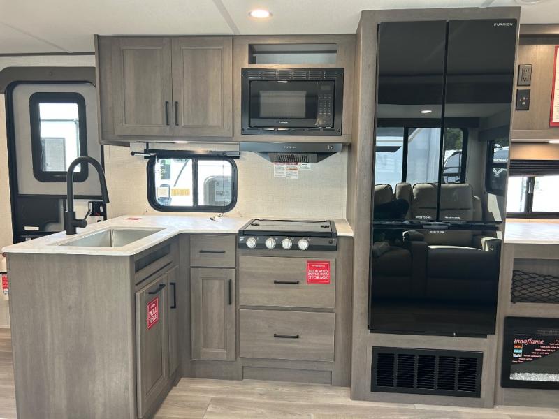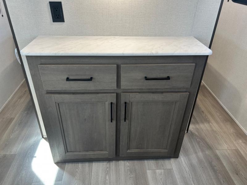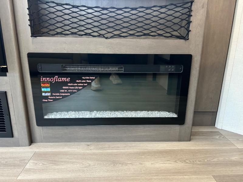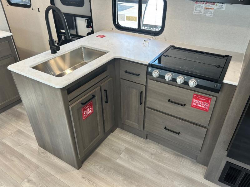 Get ready to take your travels to new heights with our incredible luxury travel trailer! The front bedroom has a queen bed, wardrobe, and overhead cabinets for all your favorite belongings, the perfect place to relax and recharge after a long day of adventure. The living room/kitchen combined area is equipped with a U-shaped dinette, three-burner cooktop, microwave, refrigerator, pantry, and 62” theater seating. Perfect for cooking up your favorite meals, entertaining friends and family, or simply relaxing and enjoying the comforts of home. The full bathroom is spacious and complete with a linen closet for added convenience. And with double-sized bunk beds featuring curtains and under-bunk storage, the kids will have their cozy retreat. But the adventure doesn't stop there! Outside, you'll find an exterior griddle with a 1.7 refrigerator, perfect for cooking up a storm in the great outdoors. And with a massive 19’ awning, you'll have plenty of shade and protection from the elements, plus, with two entry/exit doors and pass-through storage, you'll have easy access to the trailer and all your gear.