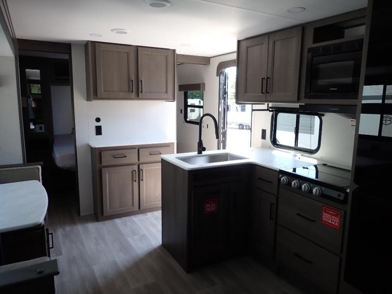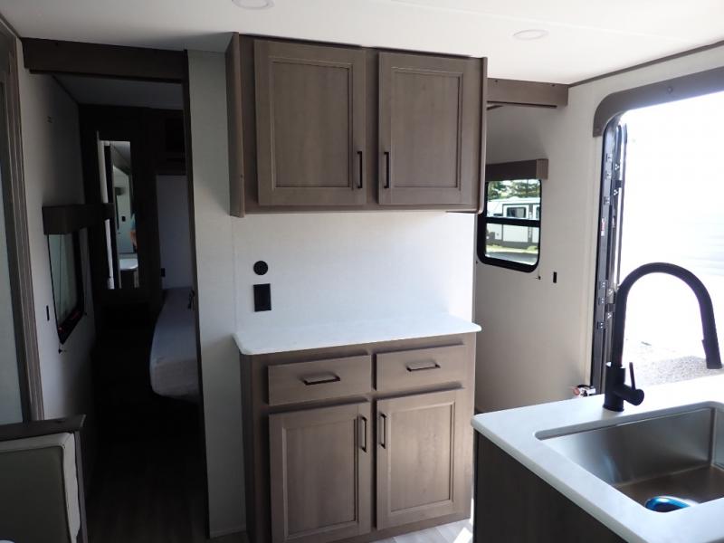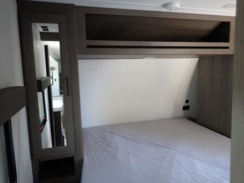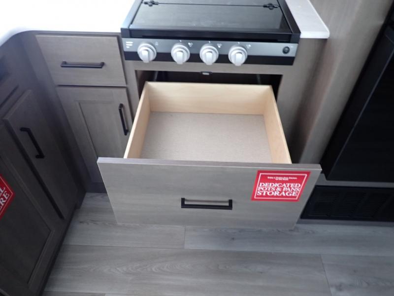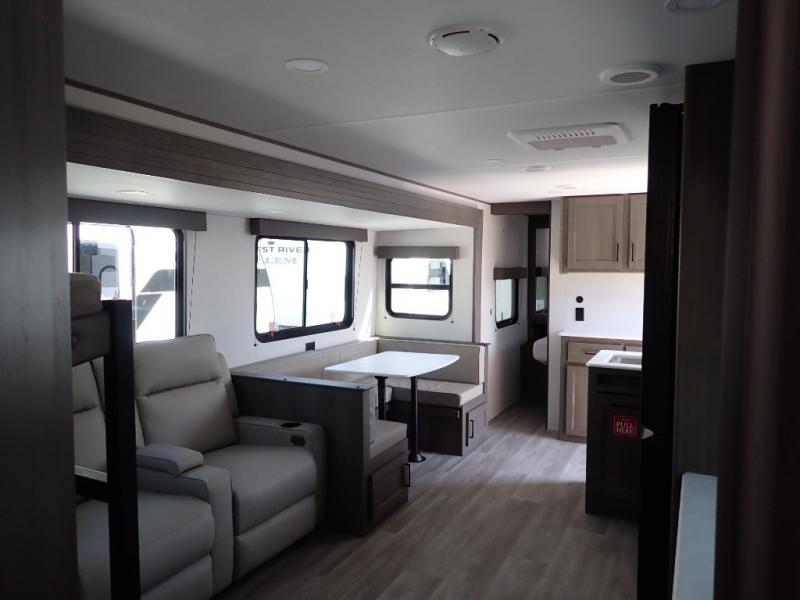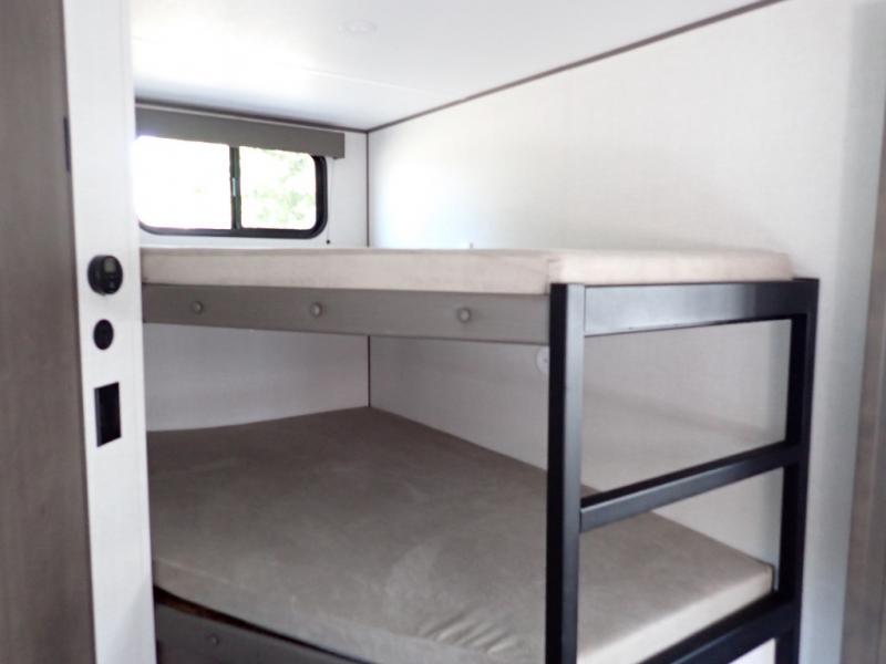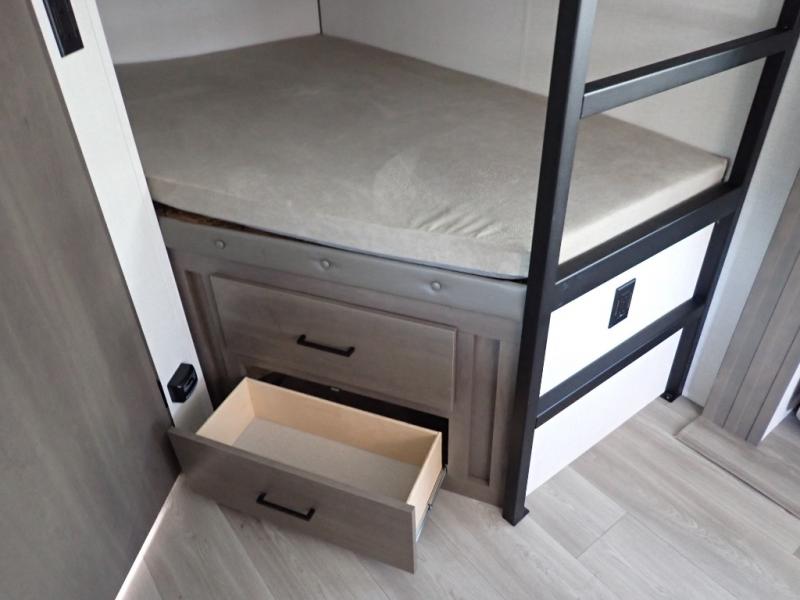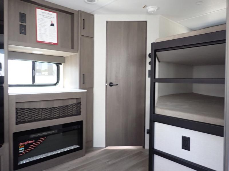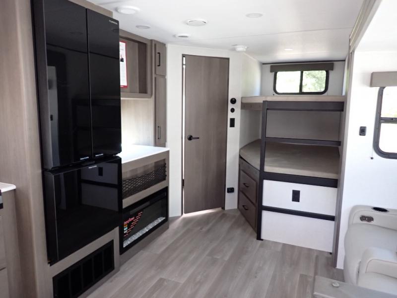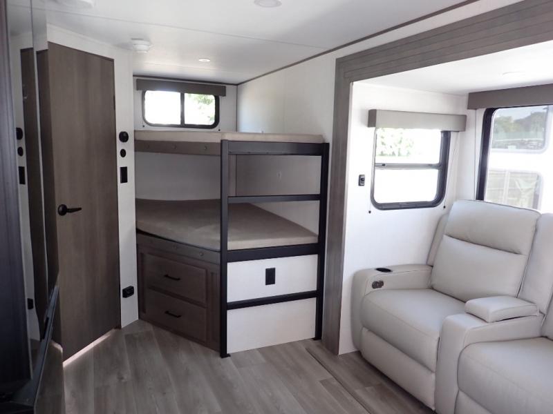 Get ready to take your travels to new heights with our incredible luxury travel trailer! The front bedroom has a queen bed, wardrobe, and overhead cabinets for all your favorite belongings, the perfect place to relax and recharge after a long day of adventure. The living room/kitchen combined area is equipped with a U-shaped dinette, three-burner cooktop, microwave, refrigerator, pantry, and 62” theater seating. Perfect for cooking up your favorite meals, entertaining friends and family, or simply relaxing and enjoying the comforts of home. The full bathroom is spacious and complete with a linen closet for added convenience. And with double-sized bunk beds featuring curtains and under-bunk storage, the kids will have their cozy retreat. But the adventure doesn't stop there! Outside, you'll find an exterior griddle with a 1.7 refrigerator, perfect for cooking up a storm in the great outdoors. And with a massive 19’ awning, you'll have plenty of shade and protection from the elements, plus, with two entry/exit doors and pass-through storage, you'll have easy access to the trailer and all your gear.