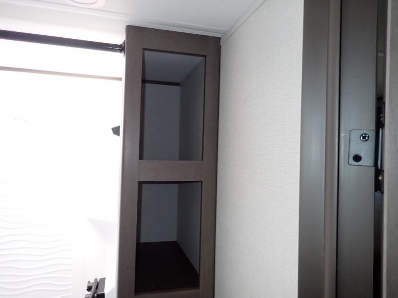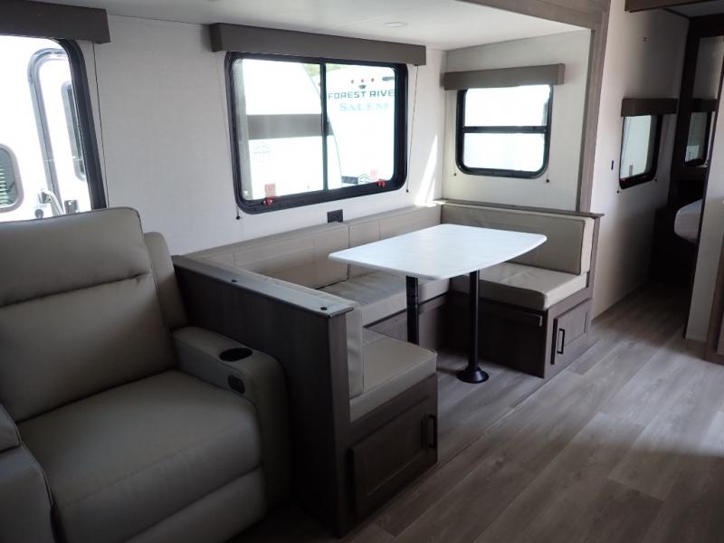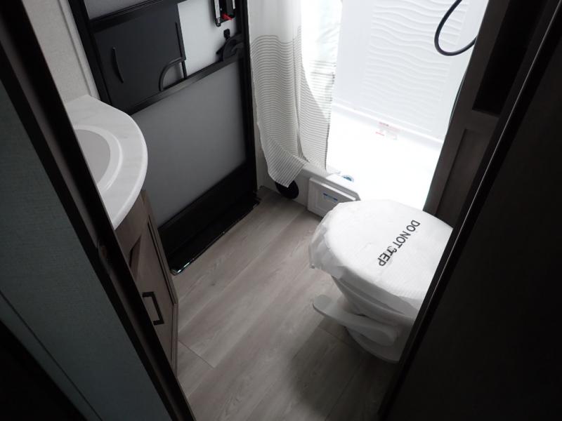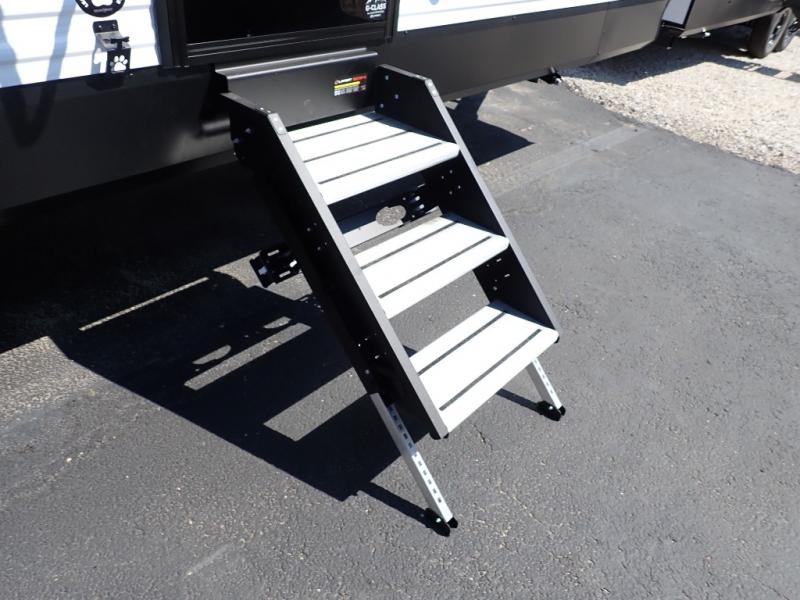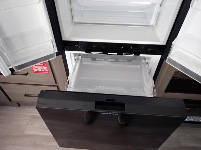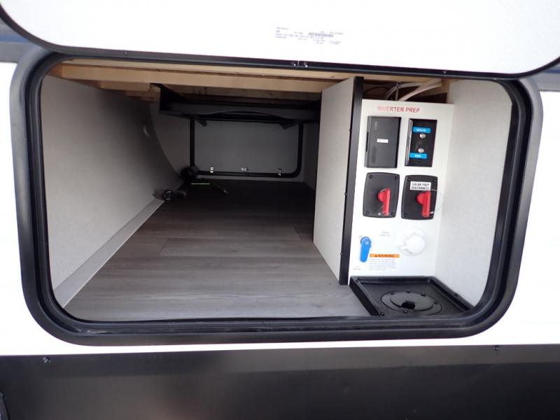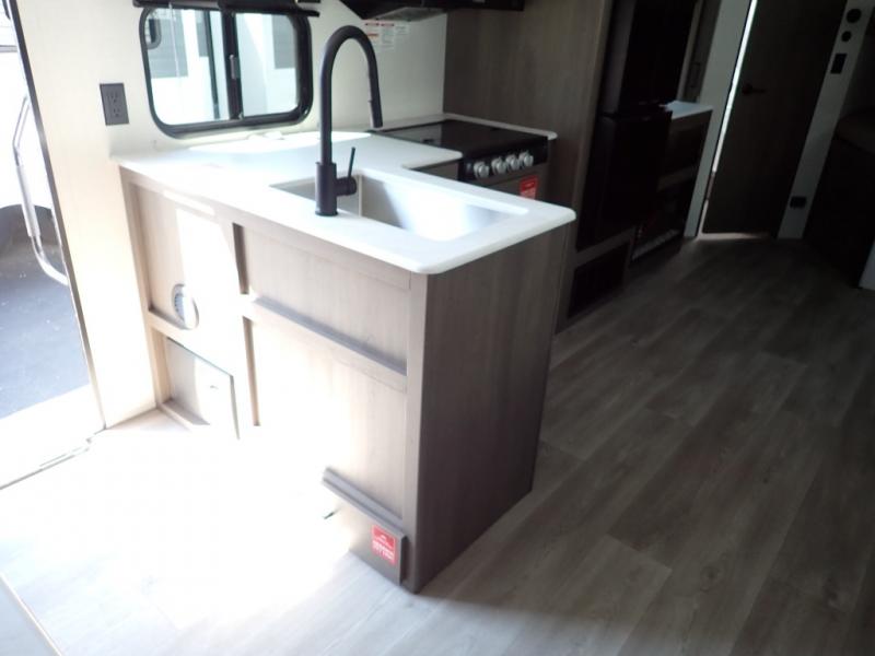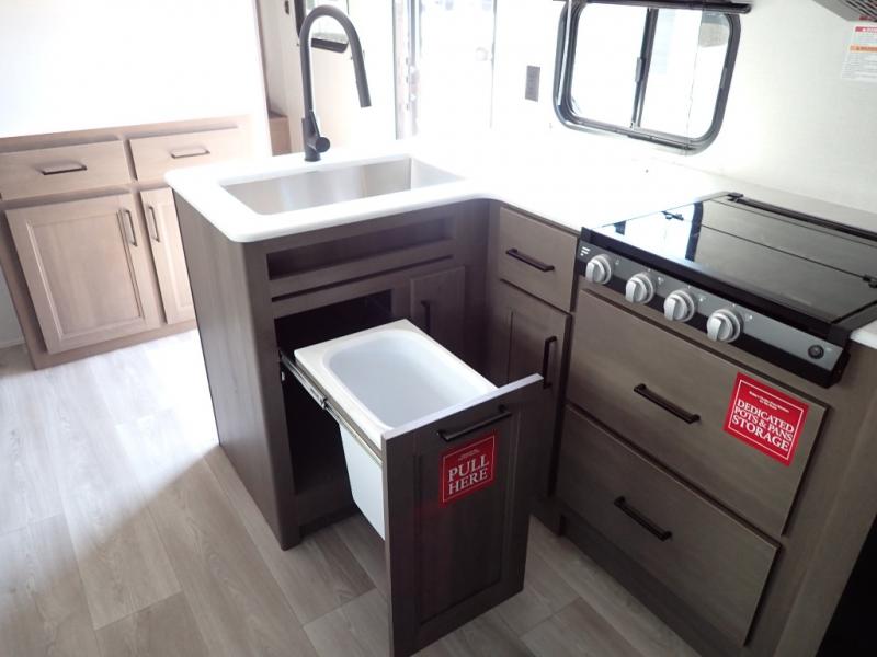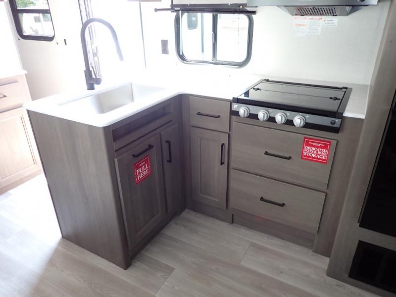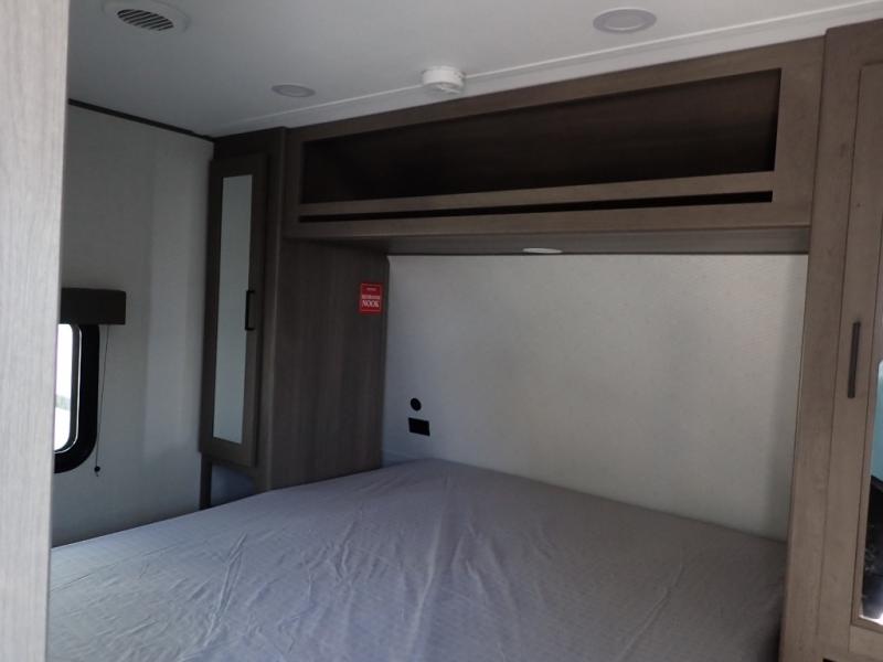 Get ready to take your travels to new heights with our incredible luxury travel trailer! The front bedroom has a queen bed, wardrobe, and overhead cabinets for all your favorite belongings, the perfect place to relax and recharge after a long day of adventure. The living room/kitchen combined area is equipped with a U-shaped dinette, three-burner cooktop, microwave, refrigerator, pantry, and 62” theater seating. Perfect for cooking up your favorite meals, entertaining friends and family, or simply relaxing and enjoying the comforts of home. The full bathroom is spacious and complete with a linen closet for added convenience. And with double-sized bunk beds featuring curtains and under-bunk storage, the kids will have their cozy retreat. But the adventure doesn't stop there! Outside, you'll find an exterior griddle with a 1.7 refrigerator, perfect for cooking up a storm in the great outdoors. And with a massive 19’ awning, you'll have plenty of shade and protection from the elements, plus, with two entry/exit doors and pass-through storage, you'll have easy access to the trailer and all your gear.