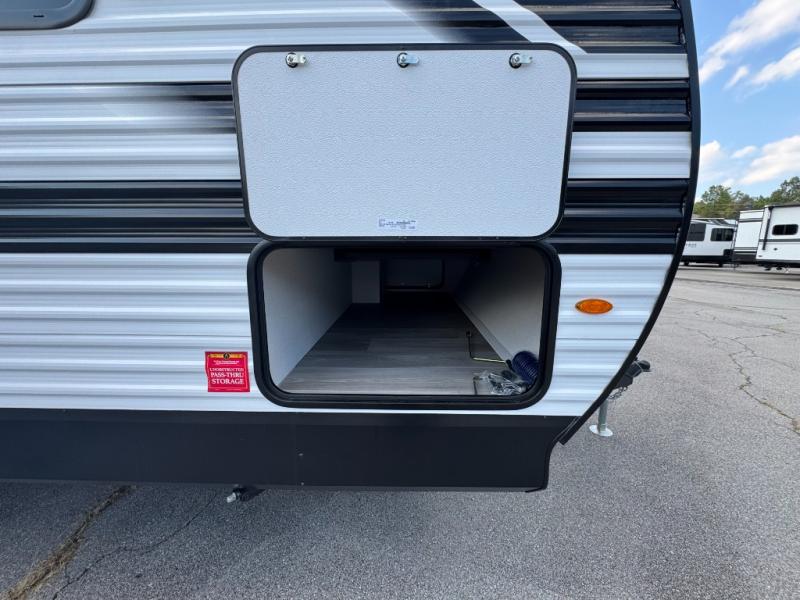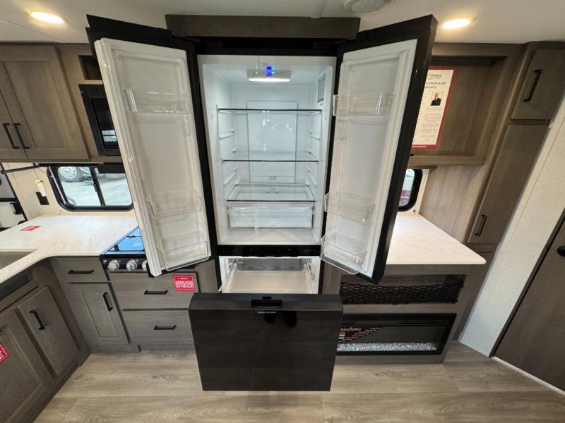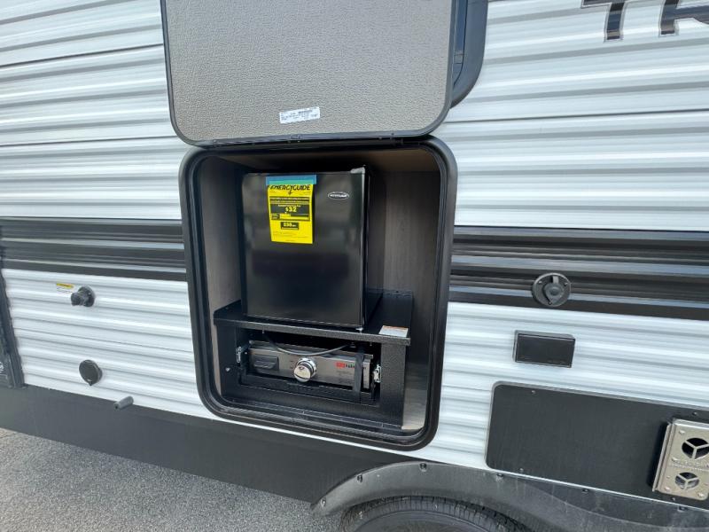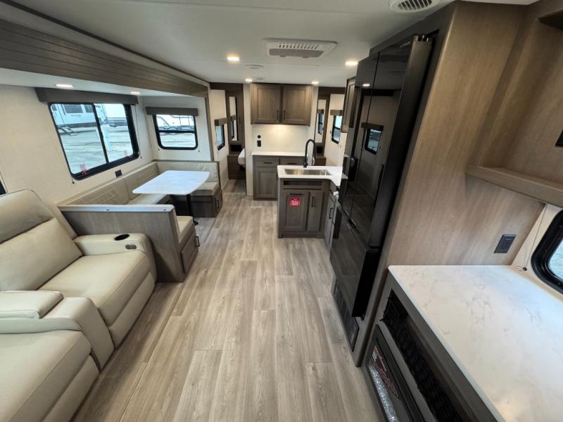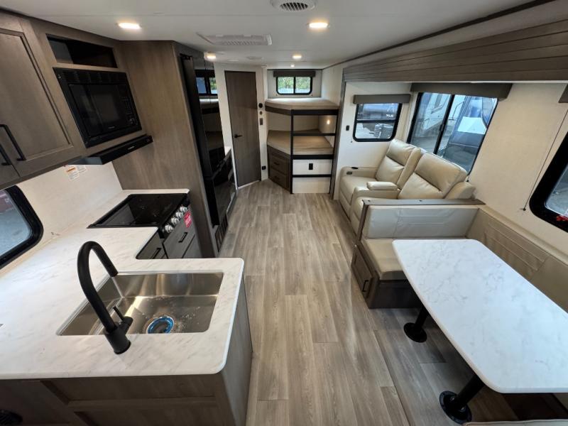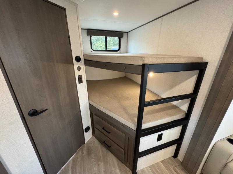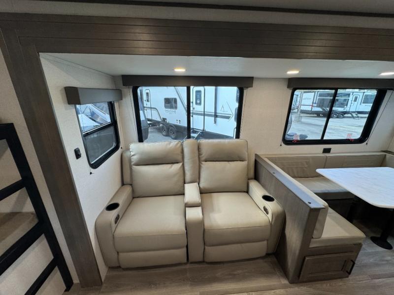 Get ready to take your travels to new heights with our incredible luxury travel trailer! The front bedroom has a queen bed, wardrobe, and overhead cabinets for all your favorite belongings, the perfect place to relax and recharge after a long day of adventure. The living room/kitchen combined area is equipped with a U-shaped dinette, three-burner cooktop, microwave, refrigerator, pantry, and 62” theater seating. Perfect for cooking up your favorite meals, entertaining friends and family, or simply relaxing and enjoying the comforts of home. The full bathroom is spacious and complete with a linen closet for added convenience. And with double-sized bunk beds featuring curtains and under-bunk storage, the kids will have their cozy retreat. But the adventure doesn't stop there! Outside, you'll find an exterior griddle with a 1.7 refrigerator, perfect for cooking up a storm in the great outdoors. And with a massive 19’ awning, you'll have plenty of shade and protection from the elements, plus, with two entry/exit doors and pass-through storage, you'll have easy access to the trailer and all your gear.