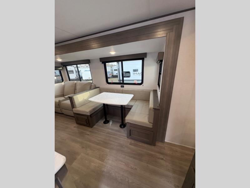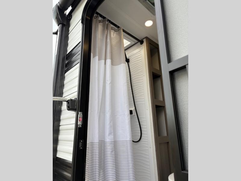 Get ready to take your travels to new heights with our incredible luxury travel trailer! The front bedroom has a queen bed, wardrobe, and overhead cabinets for all your favorite belongings, the perfect place to relax and recharge after a long day of adventure. The living room/kitchen combined area is equipped with a U-shaped dinette, three-burner cooktop, microwave, refrigerator, pantry, and 62” theater seating. Perfect for cooking up your favorite meals, entertaining friends and family, or simply relaxing and enjoying the comforts of home. The full bathroom is spacious and complete with a linen closet for added convenience. And with double-sized bunk beds featuring curtains and under-bunk storage, the kids will have their cozy retreat. But the adventure doesn't stop there! Outside, you'll find an exterior griddle with a 1.7 refrigerator, perfect for cooking up a storm in the great outdoors. And with a massive 19’ awning, you'll have plenty of shade and protection from the elements, plus, with two entry/exit doors and pass-through storage, you'll have easy access to the trailer and all your gear.