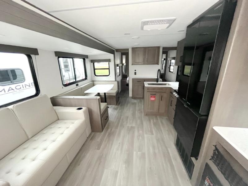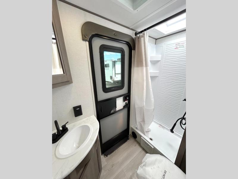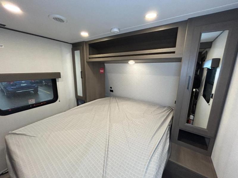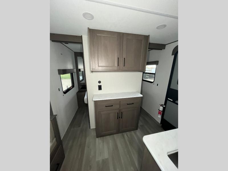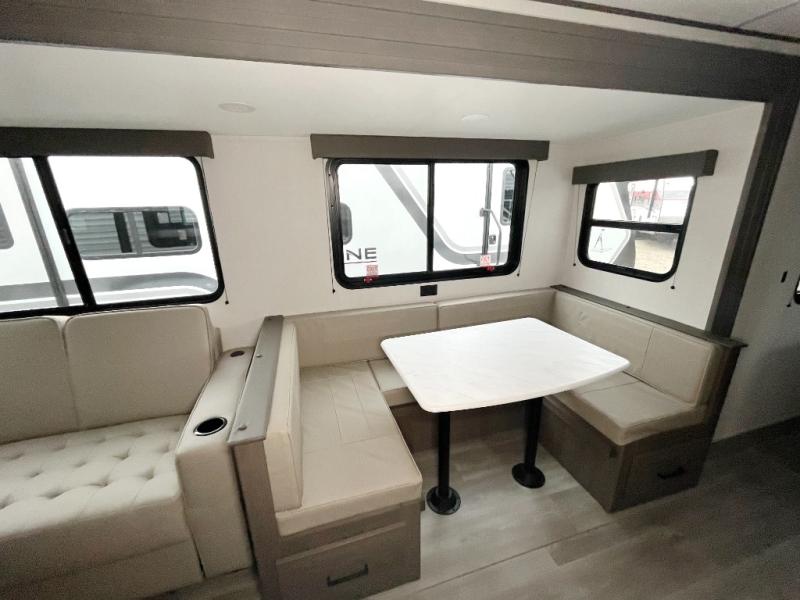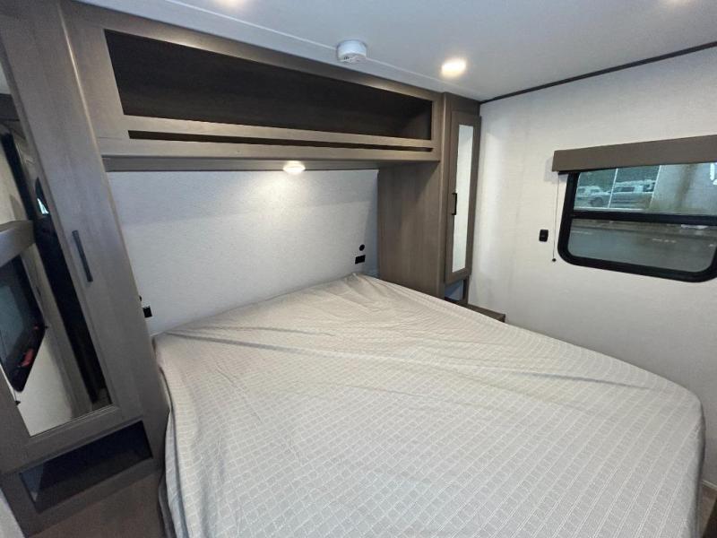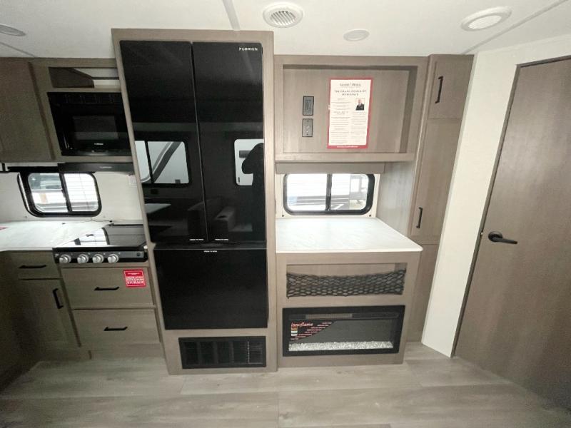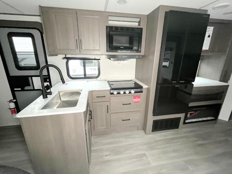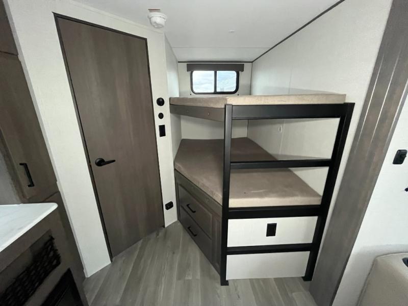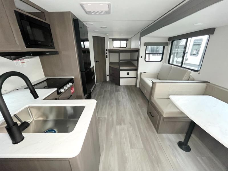 Get ready to take your travels to new heights with our incredible luxury travel trailer! The front bedroom has a queen bed, wardrobe, and overhead cabinets for all your favorite belongings, the perfect place to relax and recharge after a long day of adventure. The living room/kitchen combined area is equipped with a U-shaped dinette, three-burner cooktop, microwave, refrigerator, pantry, and 62” theater seating. Perfect for cooking up your favorite meals, entertaining friends and family, or simply relaxing and enjoying the comforts of home. The full bathroom is spacious and complete with a linen closet for added convenience. And with double-sized bunk beds featuring curtains and under-bunk storage, the kids will have their cozy retreat. But the adventure doesn't stop there! Outside, you'll find an exterior griddle with a 1.7 refrigerator, perfect for cooking up a storm in the great outdoors. And with a massive 19’ awning, you'll have plenty of shade and protection from the elements, plus, with two entry/exit doors and pass-through storage, you'll have easy access to the trailer and all your gear.
