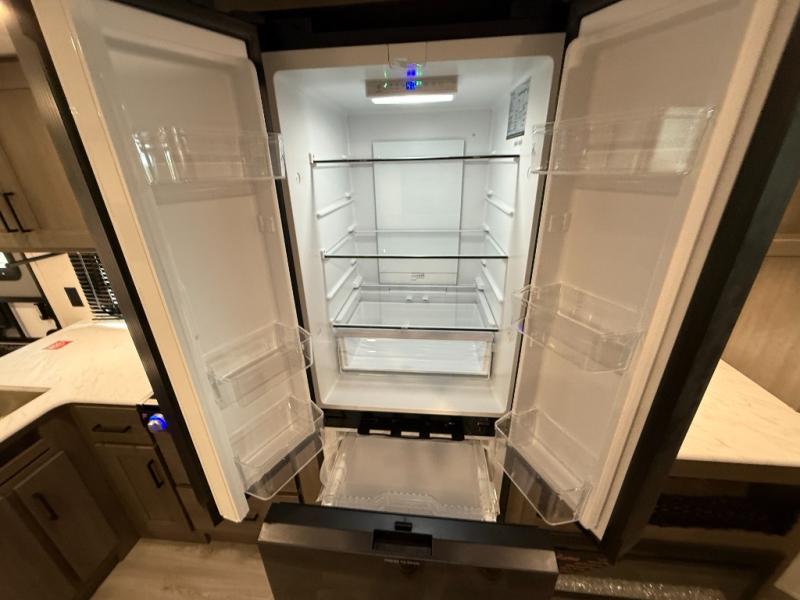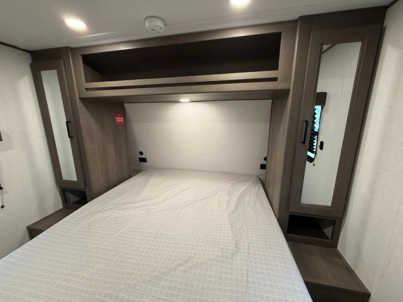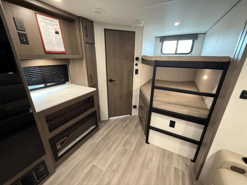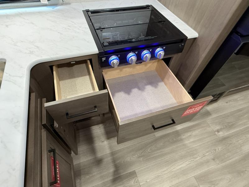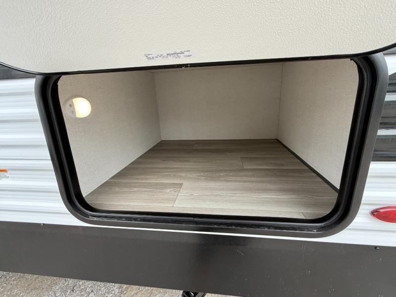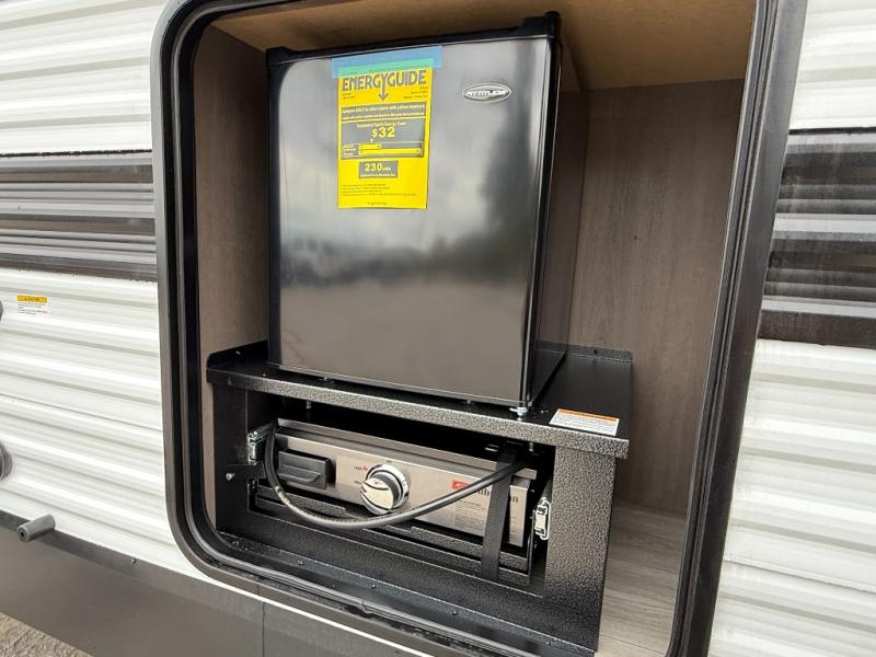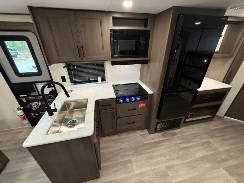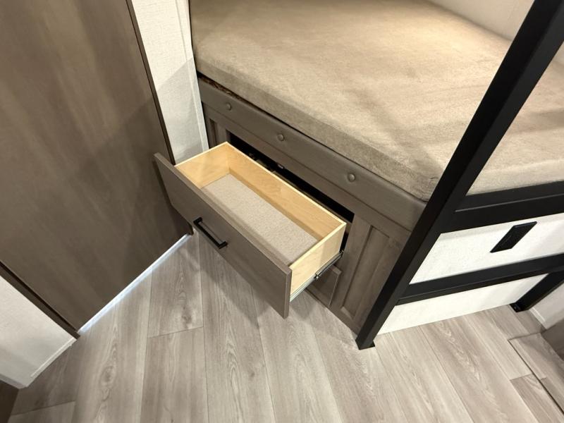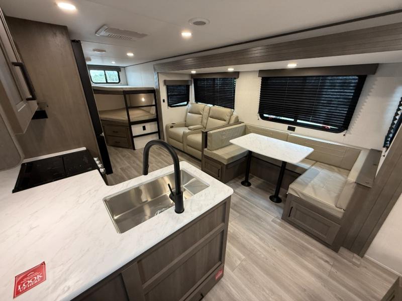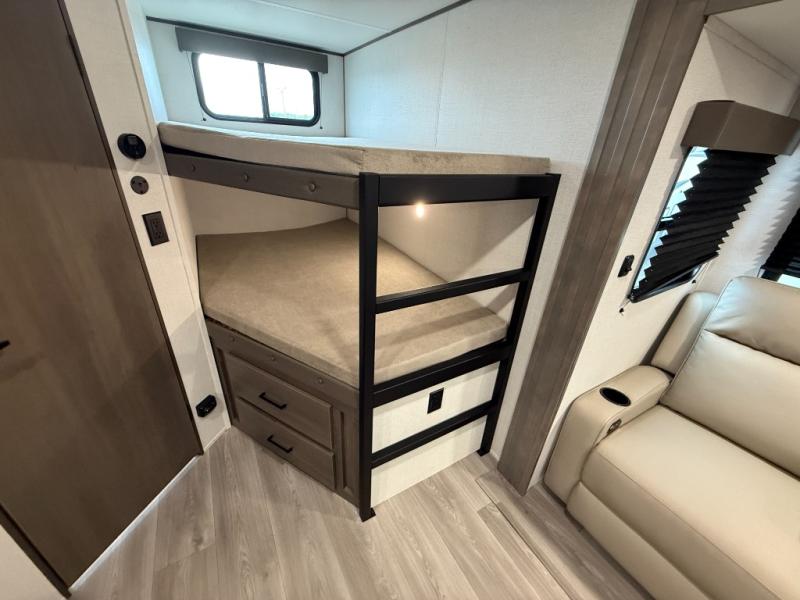 Get ready to take your travels to new heights with our incredible luxury travel trailer! The front bedroom has a queen bed, wardrobe, and overhead cabinets for all your favorite belongings, the perfect place to relax and recharge after a long day of adventure. The living room/kitchen combined area is equipped with a U-shaped dinette, three-burner cooktop, microwave, refrigerator, pantry, and 62” theater seating. Perfect for cooking up your favorite meals, entertaining friends and family, or simply relaxing and enjoying the comforts of home. The full bathroom is spacious and complete with a linen closet for added convenience. And with double-sized bunk beds featuring curtains and under-bunk storage, the kids will have their cozy retreat. But the adventure doesn't stop there! Outside, you'll find an exterior griddle with a 1.7 refrigerator, perfect for cooking up a storm in the great outdoors. And with a massive 19’ awning, you'll have plenty of shade and protection from the elements, plus, with two entry/exit doors and pass-through storage, you'll have easy access to the trailer and all your gear.