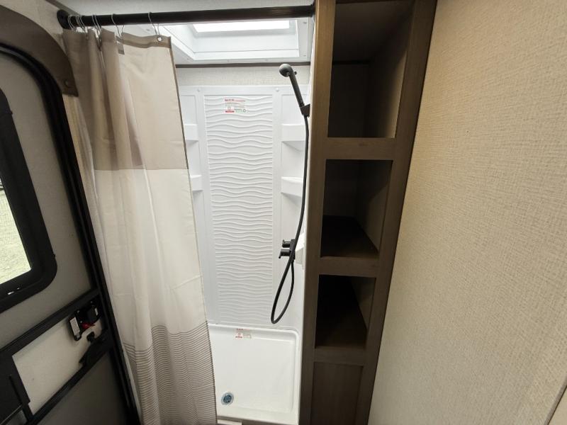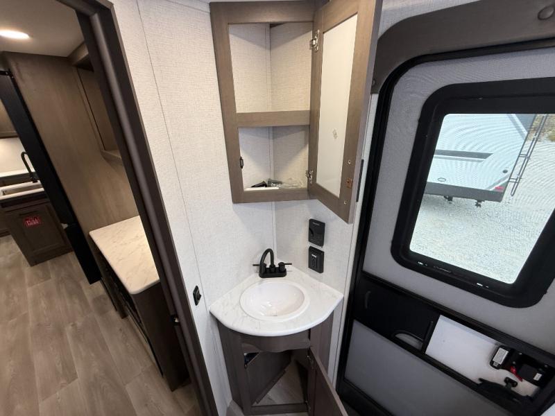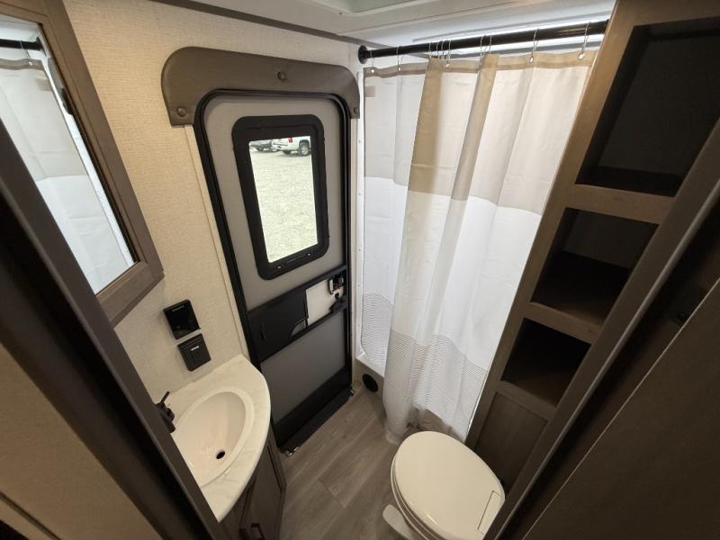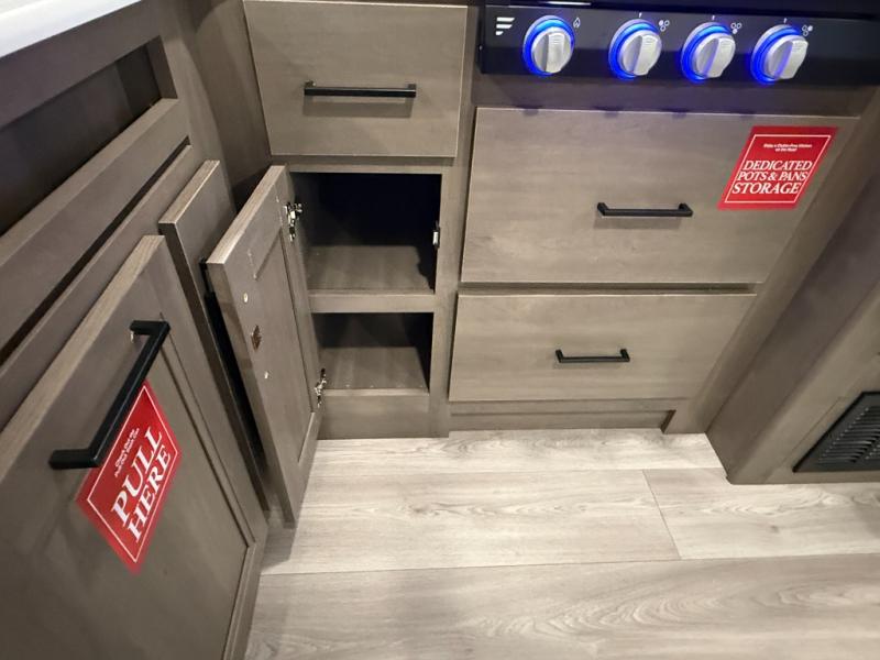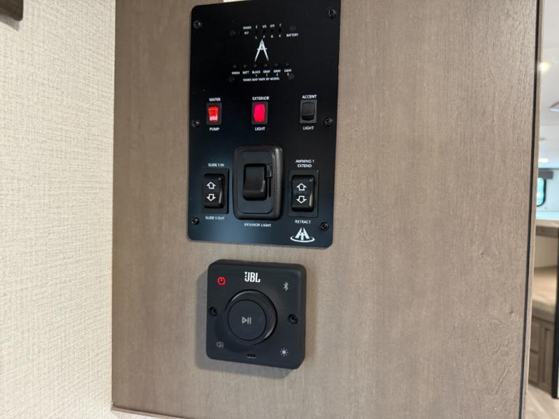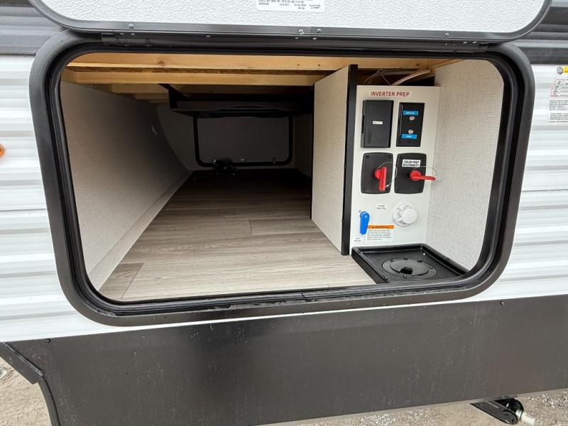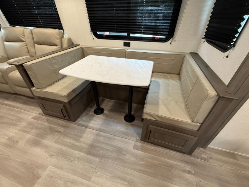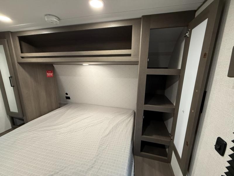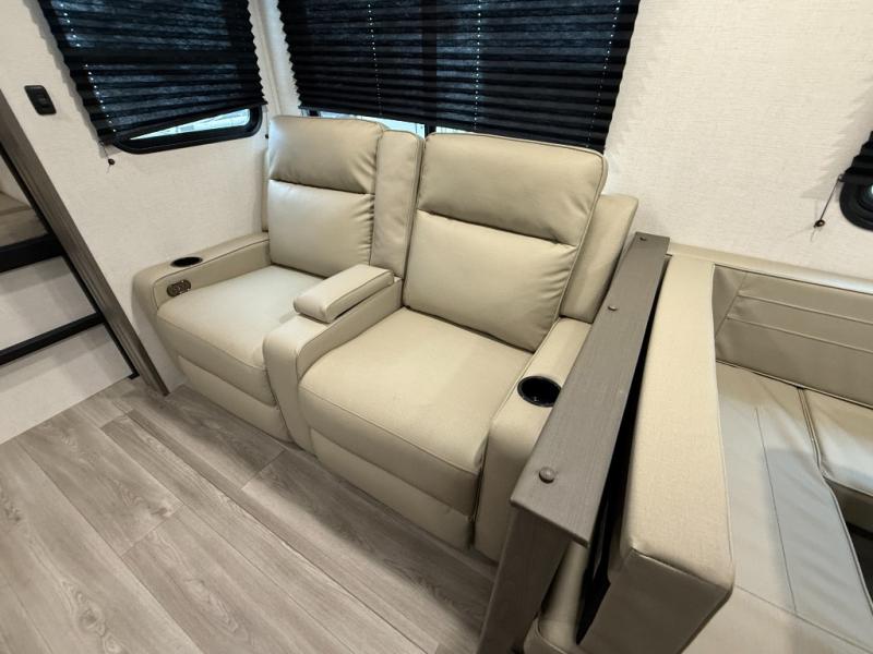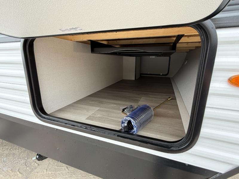 Get ready to take your travels to new heights with our incredible luxury travel trailer! The front bedroom has a queen bed, wardrobe, and overhead cabinets for all your favorite belongings, the perfect place to relax and recharge after a long day of adventure. The living room/kitchen combined area is equipped with a U-shaped dinette, three-burner cooktop, microwave, refrigerator, pantry, and 62” theater seating. Perfect for cooking up your favorite meals, entertaining friends and family, or simply relaxing and enjoying the comforts of home. The full bathroom is spacious and complete with a linen closet for added convenience. And with double-sized bunk beds featuring curtains and under-bunk storage, the kids will have their cozy retreat. But the adventure doesn't stop there! Outside, you'll find an exterior griddle with a 1.7 refrigerator, perfect for cooking up a storm in the great outdoors. And with a massive 19’ awning, you'll have plenty of shade and protection from the elements, plus, with two entry/exit doors and pass-through storage, you'll have easy access to the trailer and all your gear.