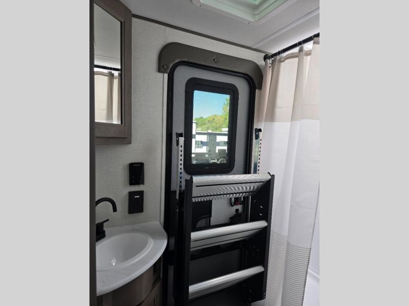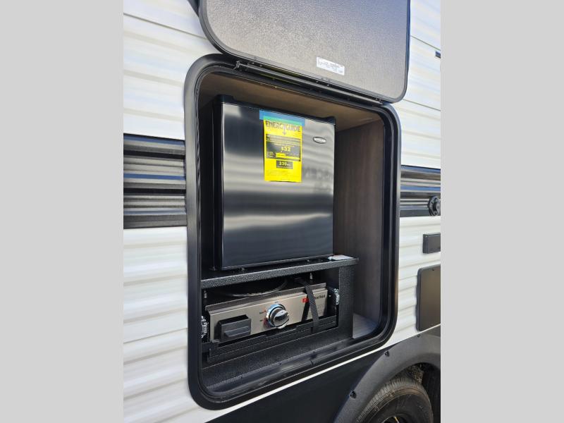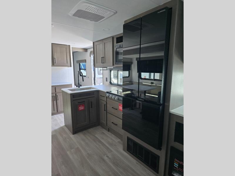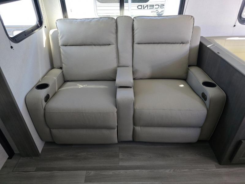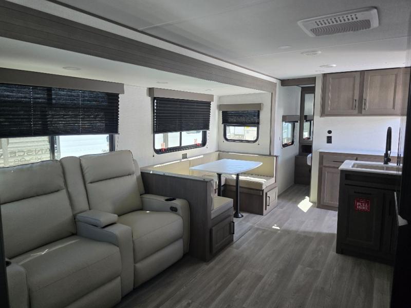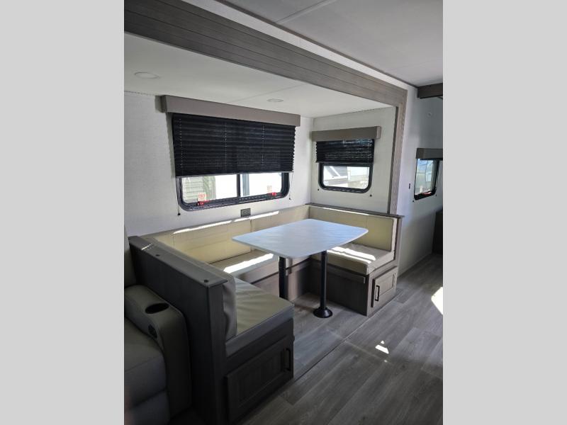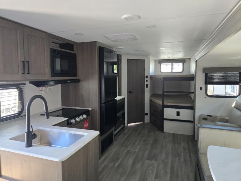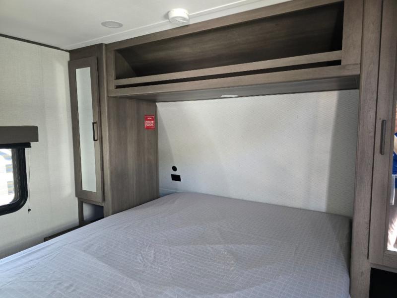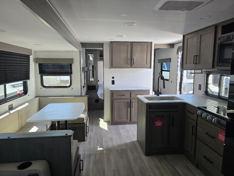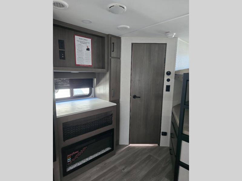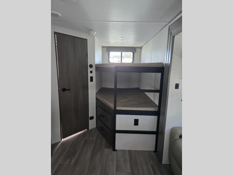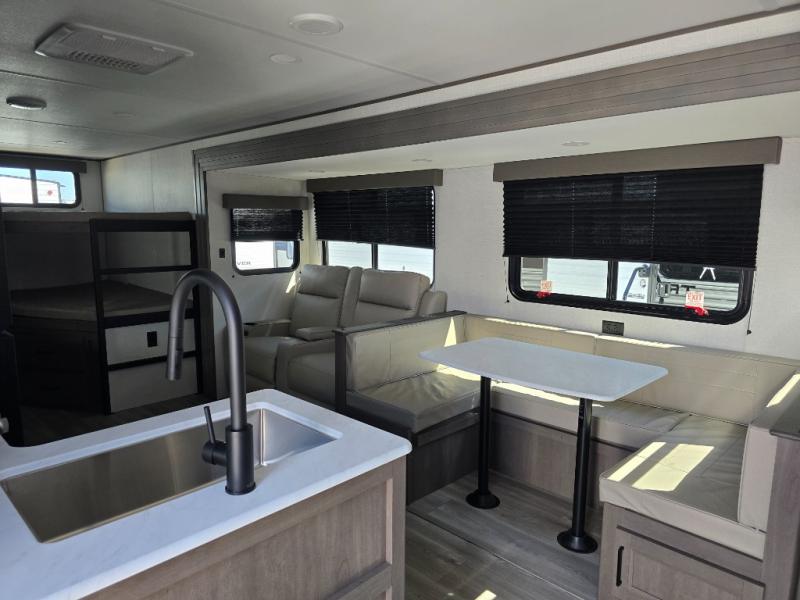 Get ready to take your travels to new heights with our incredible luxury travel trailer! The front bedroom has a queen bed, wardrobe, and overhead cabinets for all your favorite belongings, the perfect place to relax and recharge after a long day of adventure. The living room/kitchen combined area is equipped with a U-shaped dinette, three-burner cooktop, microwave, refrigerator, pantry, and 62” theater seating. Perfect for cooking up your favorite meals, entertaining friends and family, or simply relaxing and enjoying the comforts of home. The full bathroom is spacious and complete with a linen closet for added convenience. And with double-sized bunk beds featuring curtains and under-bunk storage, the kids will have their cozy retreat. But the adventure doesn't stop there! Outside, you'll find an exterior griddle with a 1.7 refrigerator, perfect for cooking up a storm in the great outdoors. And with a massive 19’ awning, you'll have plenty of shade and protection from the elements, plus, with two entry/exit doors and pass-through storage, you'll have easy access to the trailer and all your gear.