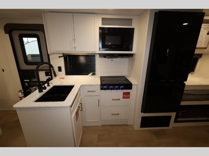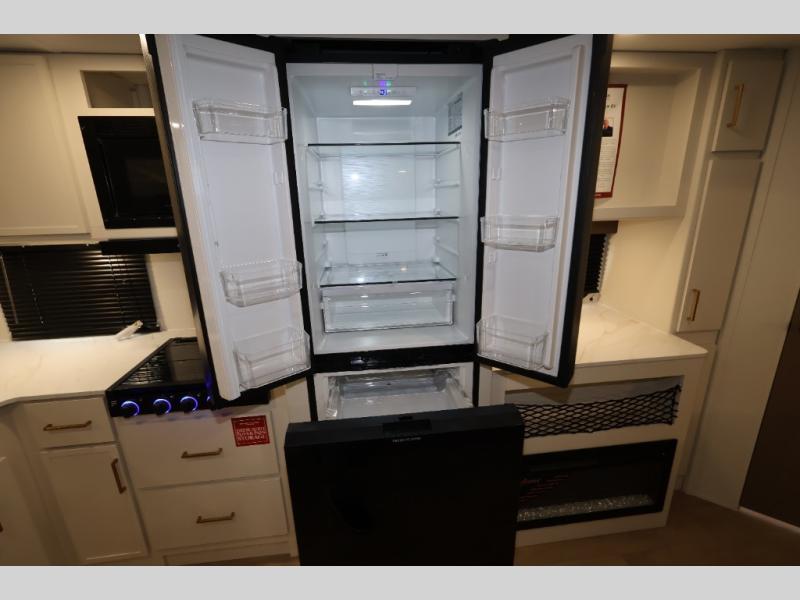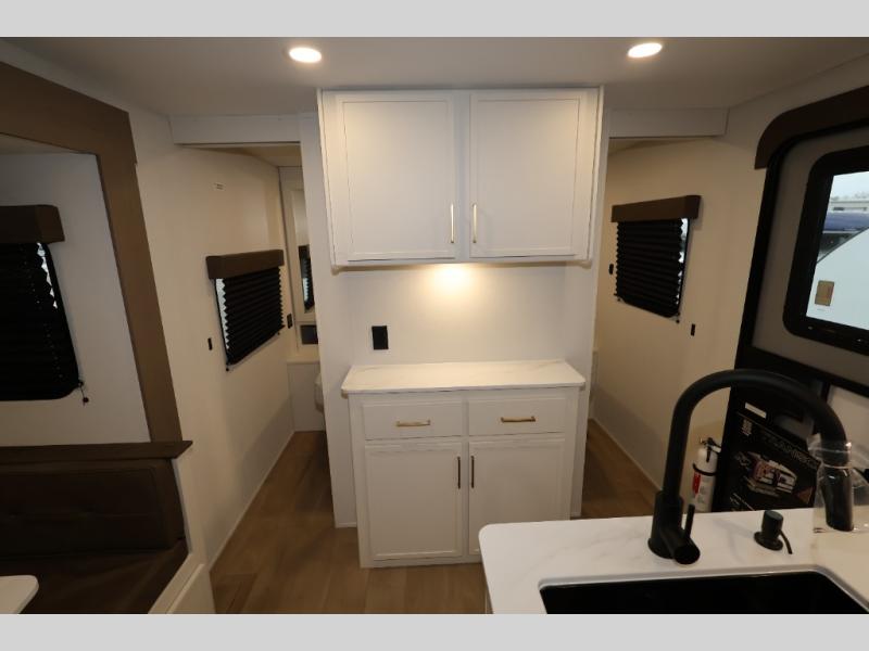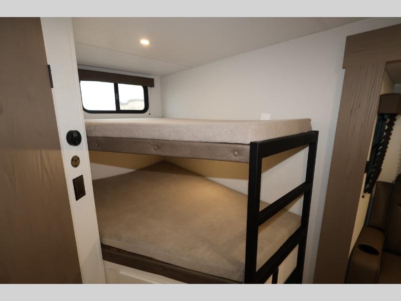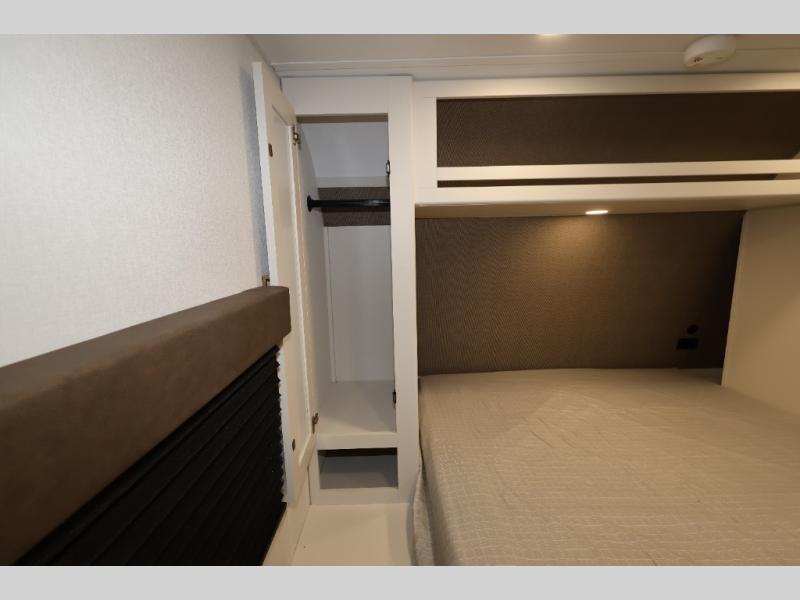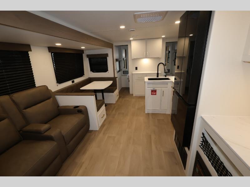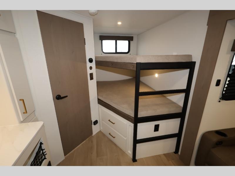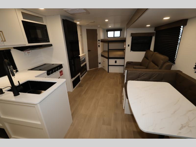Get ready to take your travels to new heights with our incredible luxury travel trailer! The front bedroom has a queen bed, wardrobe, and overhead cabinets for all your favorite belongings, the perfect place to relax and recharge after a long day of adventure. The living room/kitchen combined area is equipped with a U-shaped dinette, three-burner cooktop, microwave, refrigerator, pantry, and 62” theater seating. Perfect for cooking up your favorite meals, entertaining friends and family, or simply relaxing and enjoying the comforts of home. The full bathroom is spacious and complete with a linen closet for added convenience. And with double-sized bunk beds featuring curtains and under-bunk storage, the kids will have their cozy retreat. But the adventure doesn't stop there! Outside, you'll find an exterior griddle with a 1.7 refrigerator, perfect for cooking up a storm in the great outdoors. And with a massive 19’ awning, you'll have plenty of shade and protection from the elements, plus, with two entry/exit doors and pass-through storage, you'll have easy access to the trailer and all your gear.