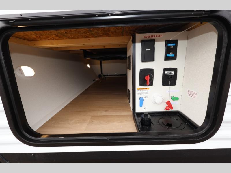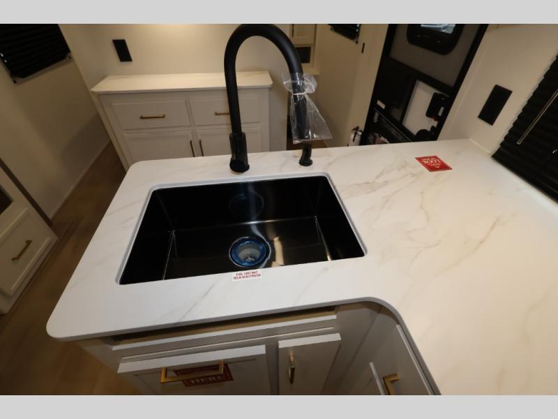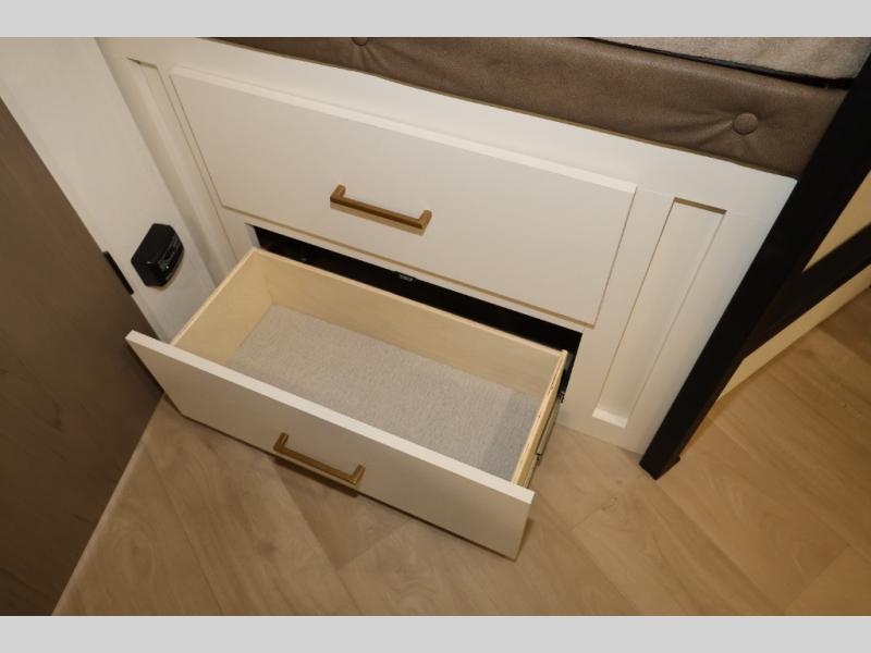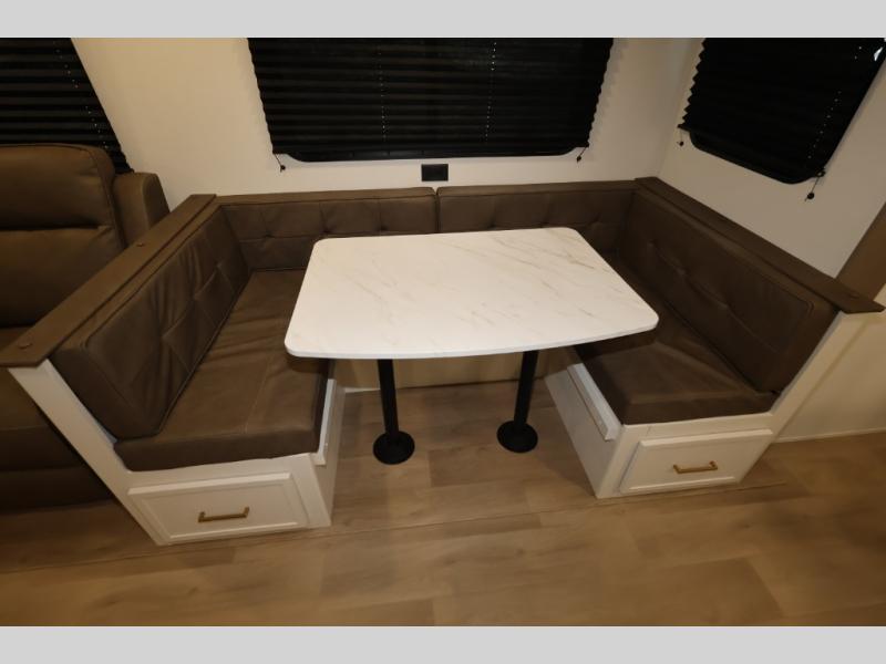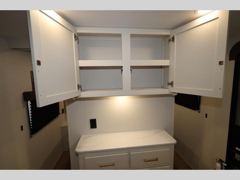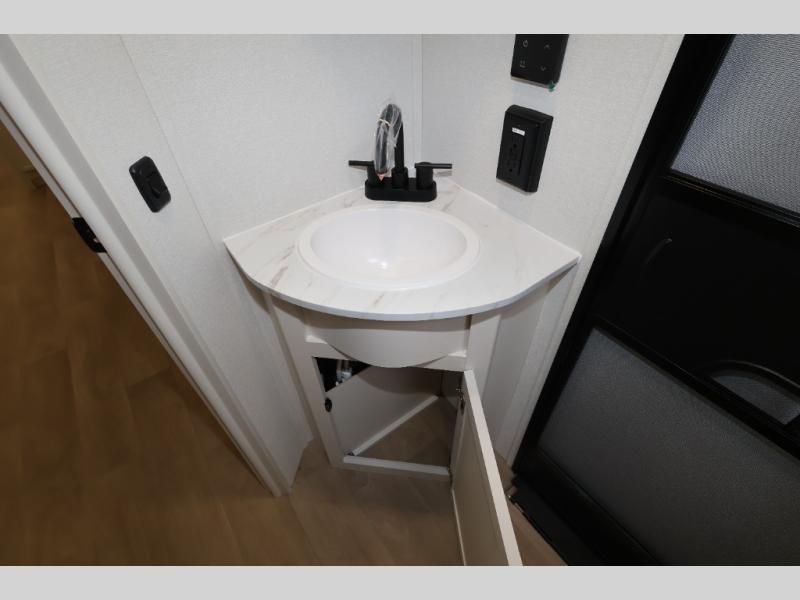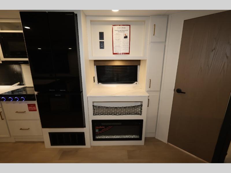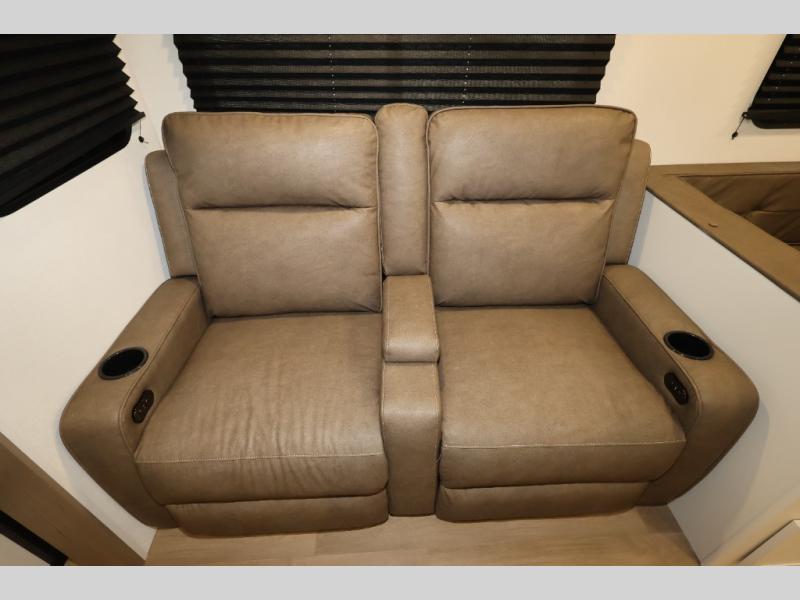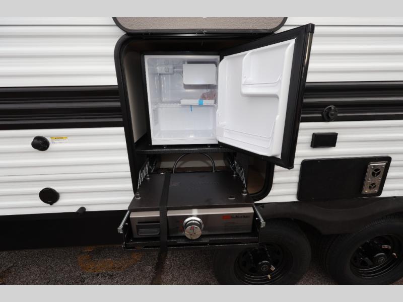 Get ready to take your travels to new heights with our incredible luxury travel trailer! The front bedroom has a queen bed, wardrobe, and overhead cabinets for all your favorite belongings, the perfect place to relax and recharge after a long day of adventure. The living room/kitchen combined area is equipped with a U-shaped dinette, three-burner cooktop, microwave, refrigerator, pantry, and 62” theater seating. Perfect for cooking up your favorite meals, entertaining friends and family, or simply relaxing and enjoying the comforts of home. The full bathroom is spacious and complete with a linen closet for added convenience. And with double-sized bunk beds featuring curtains and under-bunk storage, the kids will have their cozy retreat. But the adventure doesn't stop there! Outside, you'll find an exterior griddle with a 1.7 refrigerator, perfect for cooking up a storm in the great outdoors. And with a massive 19’ awning, you'll have plenty of shade and protection from the elements, plus, with two entry/exit doors and pass-through storage, you'll have easy access to the trailer and all your gear.