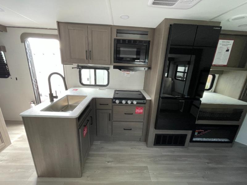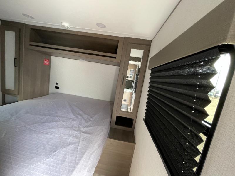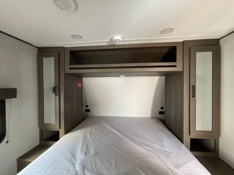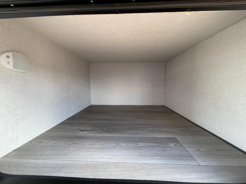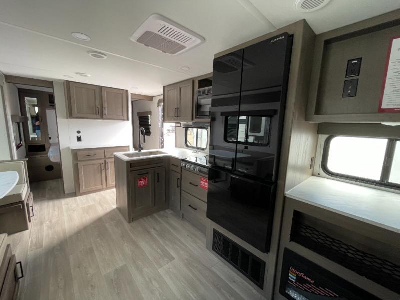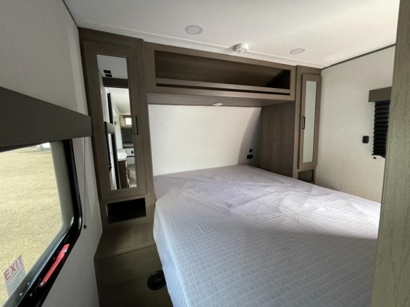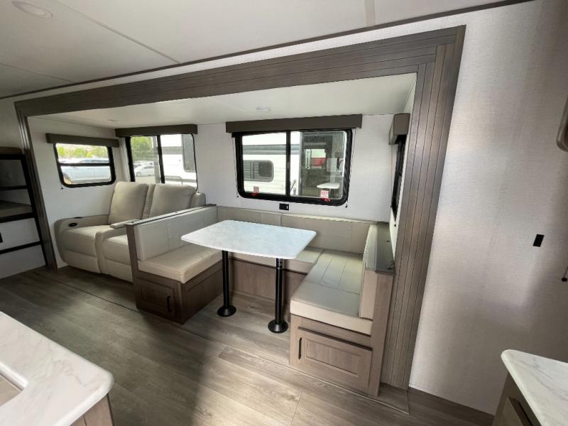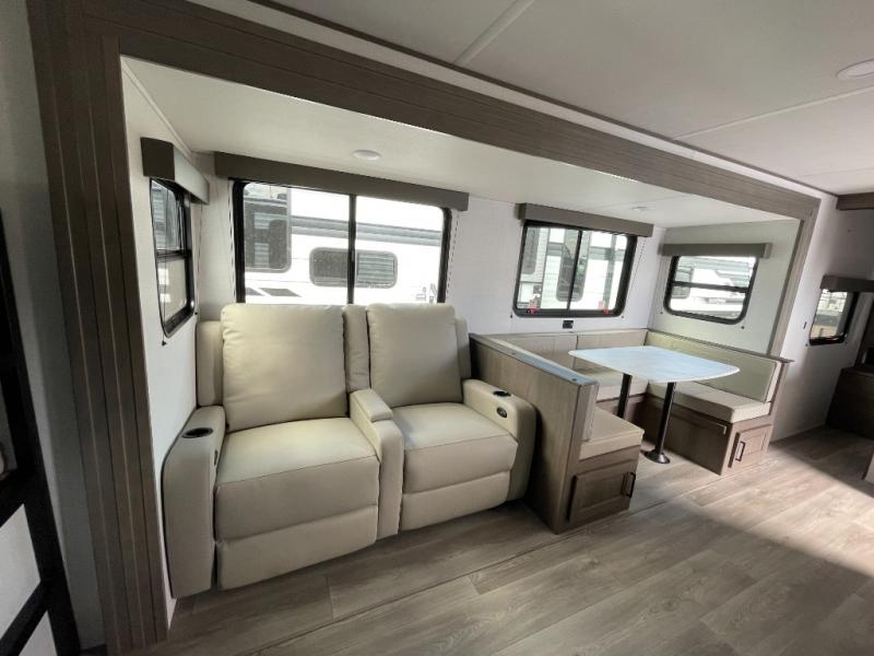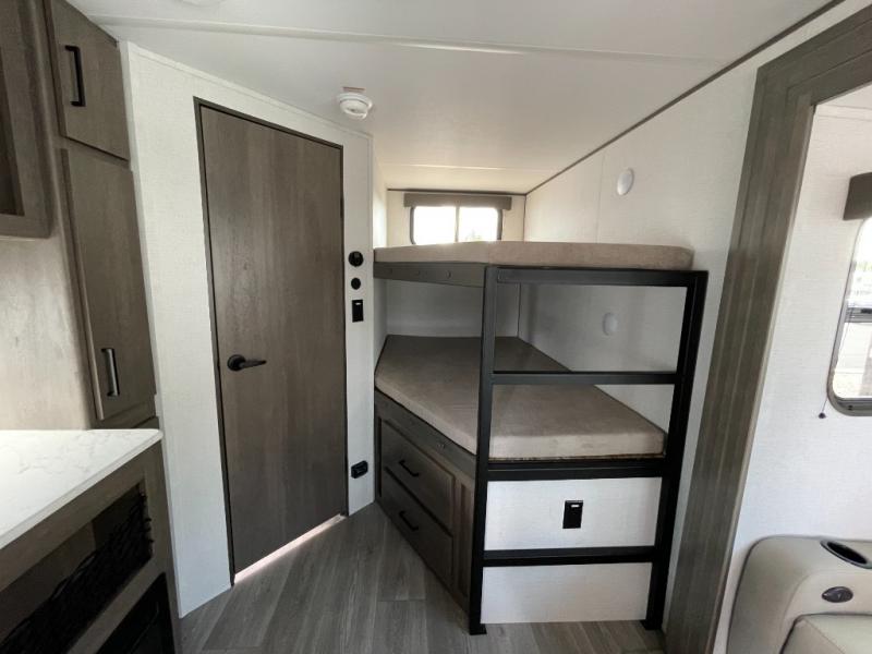 Get ready to take your travels to new heights with our incredible luxury travel trailer! The front bedroom has a queen bed, wardrobe, and overhead cabinets for all your favorite belongings, the perfect place to relax and recharge after a long day of adventure. The living room/kitchen combined area is equipped with a U-shaped dinette, three-burner cooktop, microwave, refrigerator, pantry, and 62” theater seating. Perfect for cooking up your favorite meals, entertaining friends and family, or simply relaxing and enjoying the comforts of home. The full bathroom is spacious and complete with a linen closet for added convenience. And with double-sized bunk beds featuring curtains and under-bunk storage, the kids will have their cozy retreat. But the adventure doesn't stop there! Outside, you'll find an exterior griddle with a 1.7 refrigerator, perfect for cooking up a storm in the great outdoors. And with a massive 19’ awning, you'll have plenty of shade and protection from the elements, plus, with two entry/exit doors and pass-through storage, you'll have easy access to the trailer and all your gear.