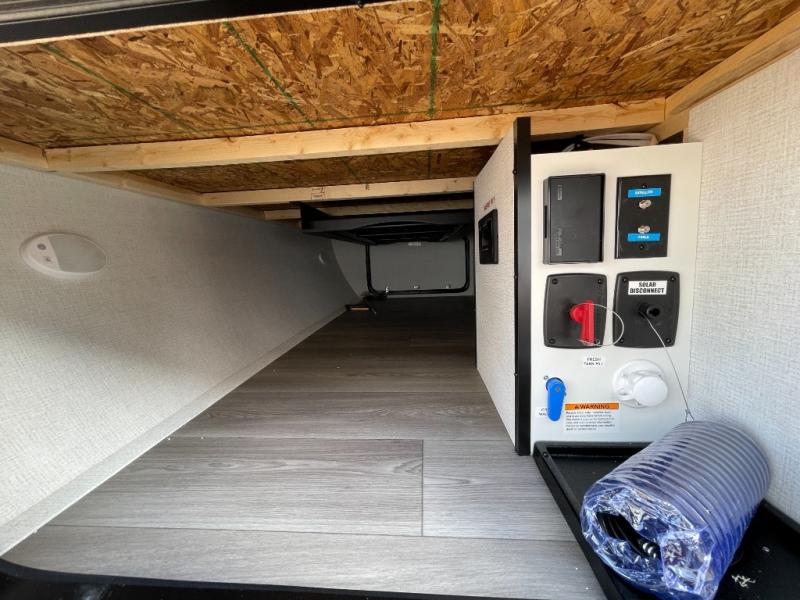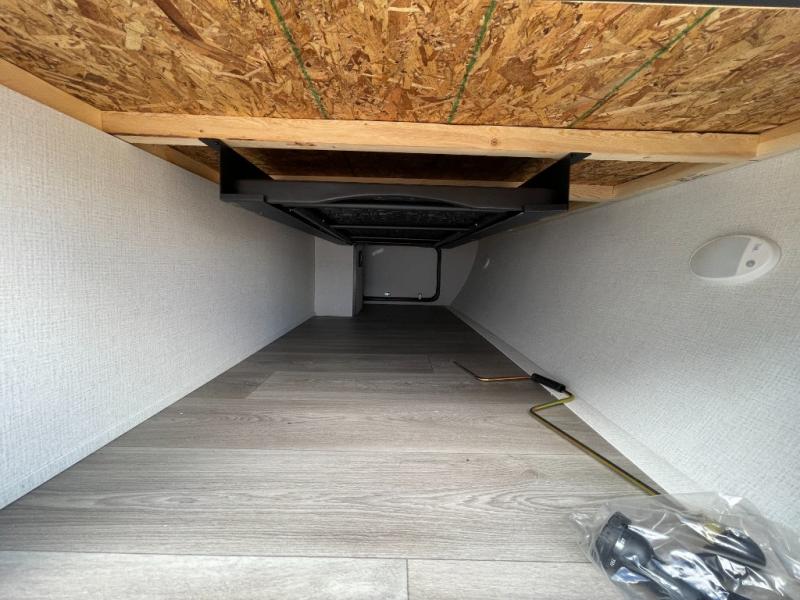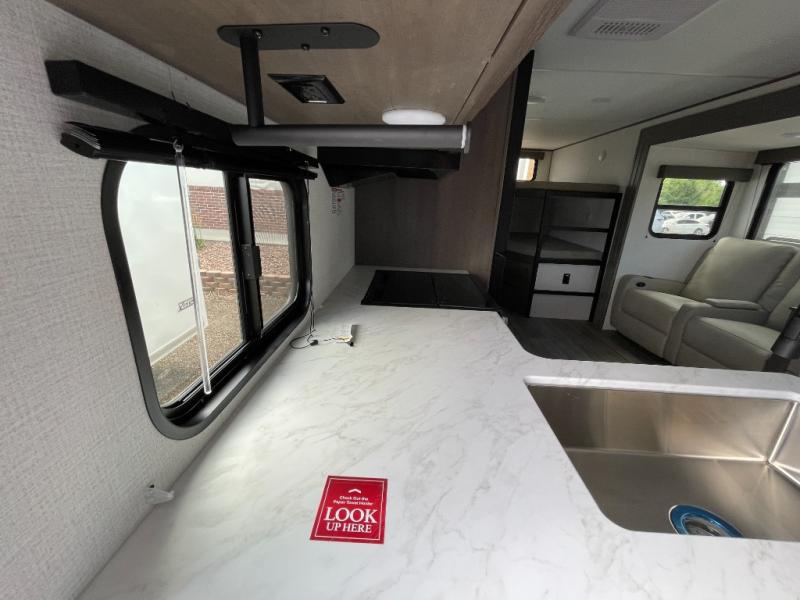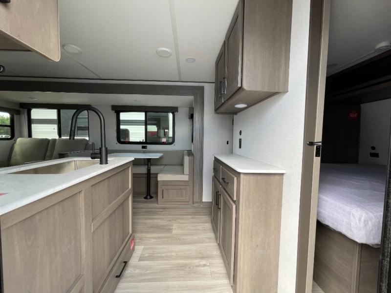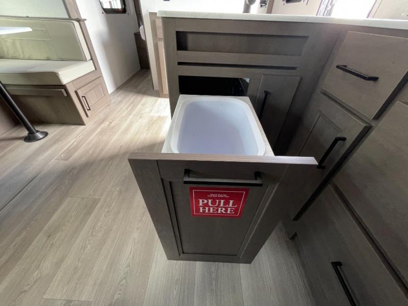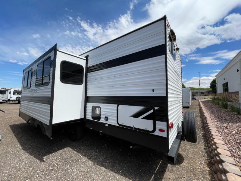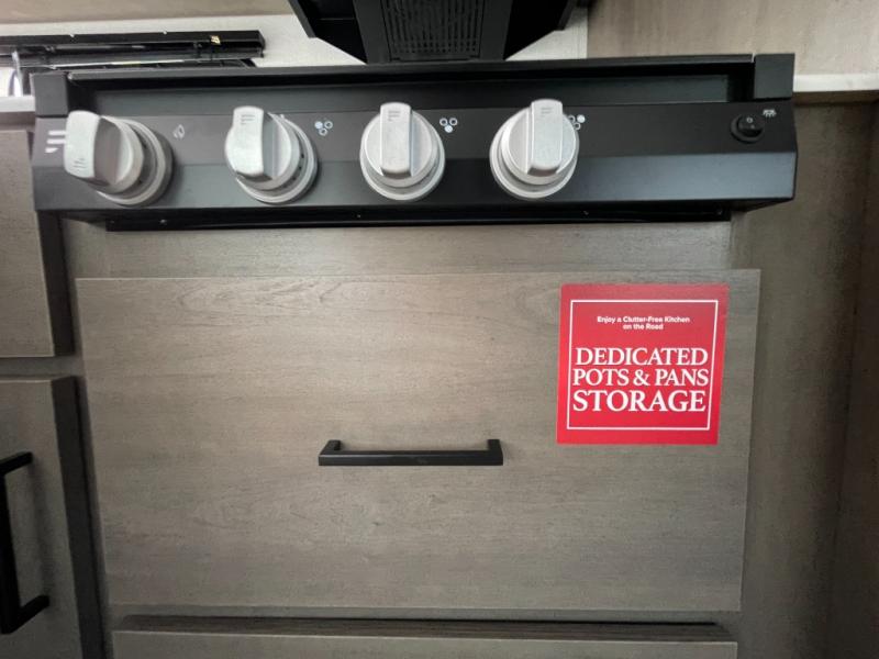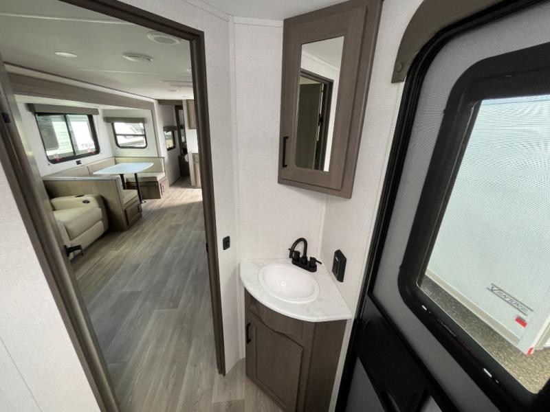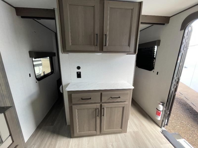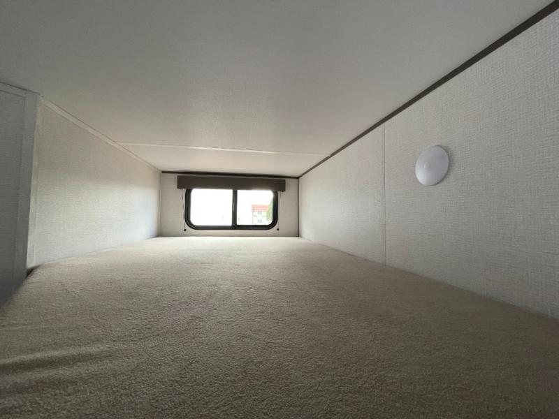 Get ready to take your travels to new heights with our incredible luxury travel trailer! The front bedroom has a queen bed, wardrobe, and overhead cabinets for all your favorite belongings, the perfect place to relax and recharge after a long day of adventure. The living room/kitchen combined area is equipped with a U-shaped dinette, three-burner cooktop, microwave, refrigerator, pantry, and 62” theater seating. Perfect for cooking up your favorite meals, entertaining friends and family, or simply relaxing and enjoying the comforts of home. The full bathroom is spacious and complete with a linen closet for added convenience. And with double-sized bunk beds featuring curtains and under-bunk storage, the kids will have their cozy retreat. But the adventure doesn't stop there! Outside, you'll find an exterior griddle with a 1.7 refrigerator, perfect for cooking up a storm in the great outdoors. And with a massive 19’ awning, you'll have plenty of shade and protection from the elements, plus, with two entry/exit doors and pass-through storage, you'll have easy access to the trailer and all your gear.