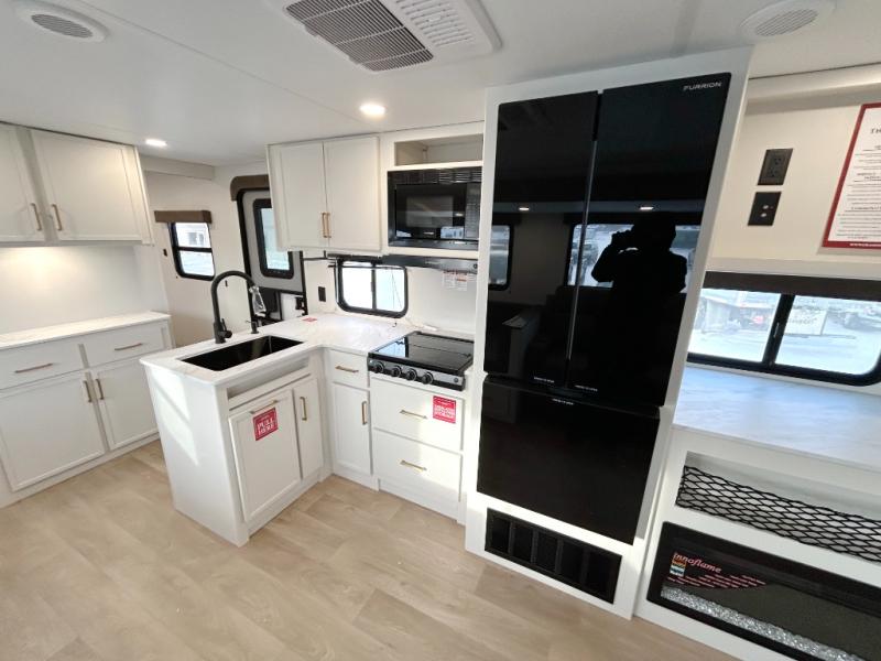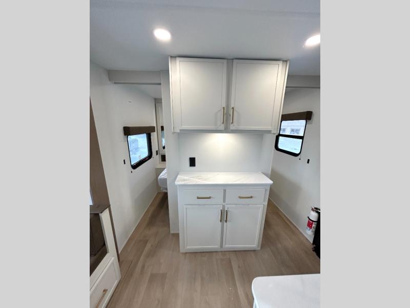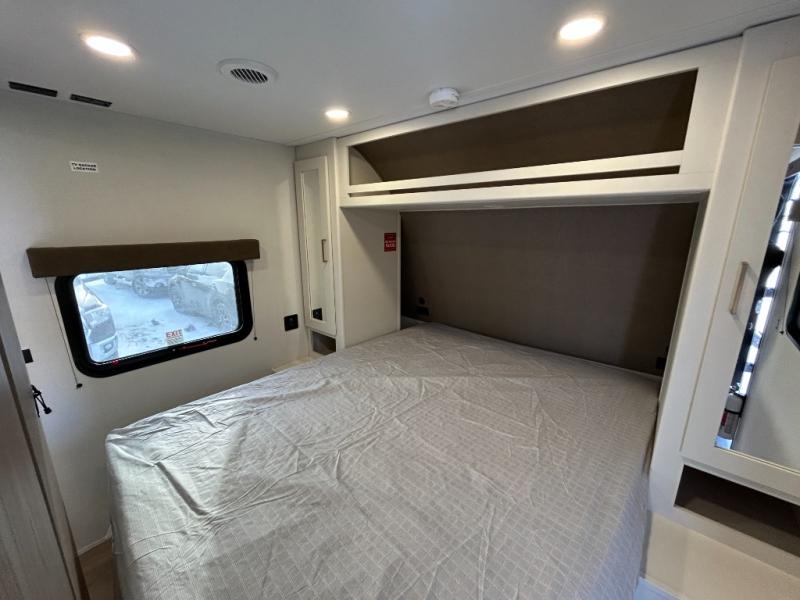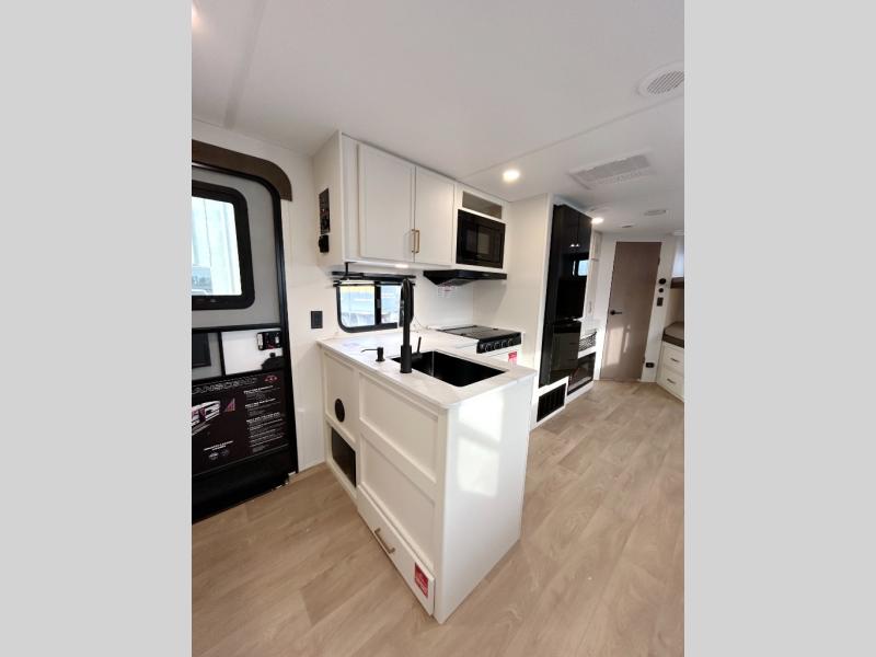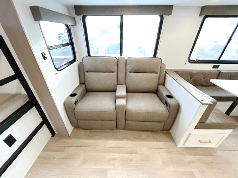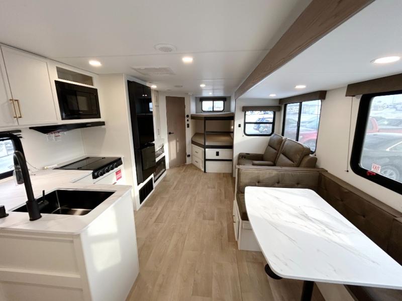 Get ready to take your travels to new heights with our incredible luxury travel trailer! The front bedroom has a queen bed, wardrobe, and overhead cabinets for all your favorite belongings, the perfect place to relax and recharge after a long day of adventure. The living room/kitchen combined area is equipped with a U-shaped dinette, three-burner cooktop, microwave, refrigerator, and pantry. The full bathroom is spacious and complete with a linen closet for added convenience. And with double-sized bunk beds featuring curtains and under-bunk storage, the kids will have their cozy retreat. But the adventure doesn't stop there! Outside, you'll find an exterior griddle with a 1.7 refrigerator, perfect for cooking up a storm in the great outdoors. And with a massive 19’ awning, you'll have plenty of shade and protection from the elements, plus, with two entry/exit doors and pass-through storage, you'll have easy access to the trailer and all your gear.