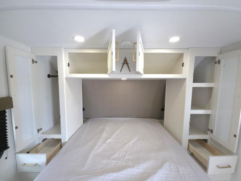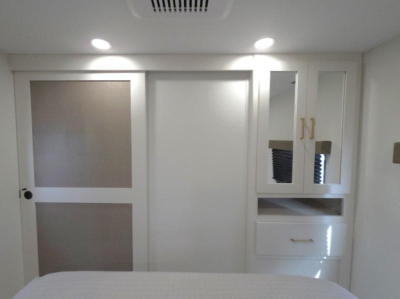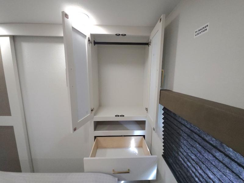 When it’s time to rest, the private bedroom features a queen bed designed for comfort and convenience. Thoughtful storage solutions, including a handy laundry chute, help keep your space tidy and organized throughout your travels.