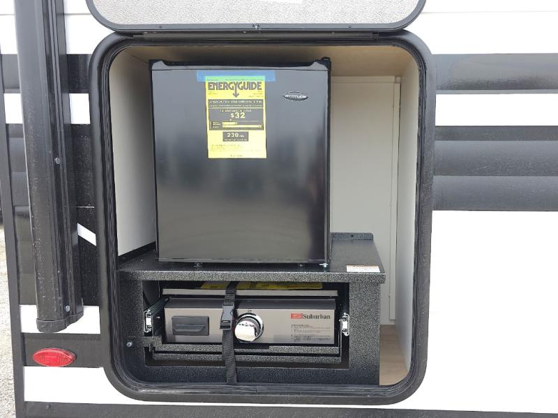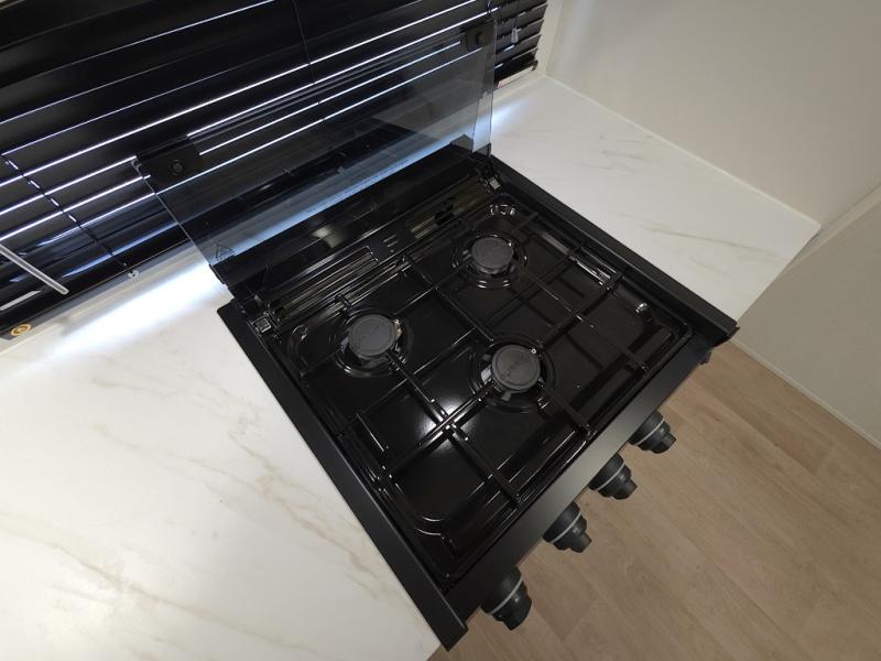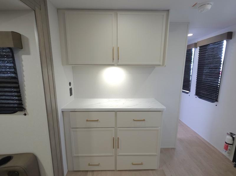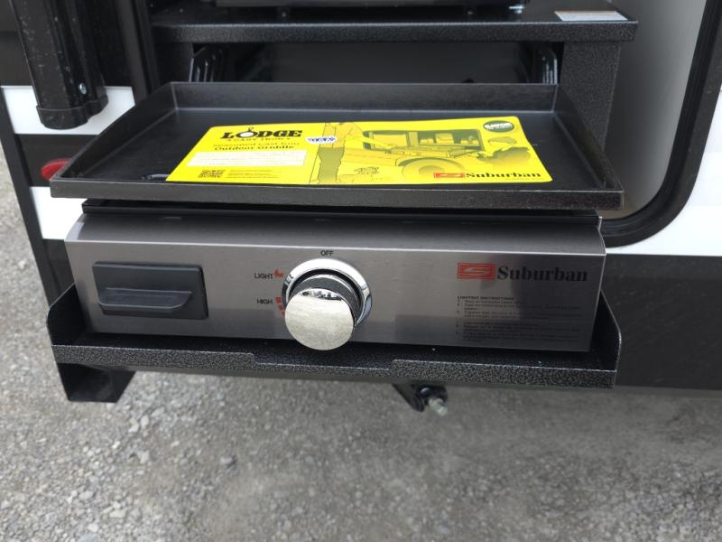 Outside, the features continue to impress. The exterior griddle makes outdoor cooking simple and fun, while the spray port allows for quick cleanup after a day of adventure. The power awning with LED lighting creates a welcoming outdoor living area perfect for relaxing evenings at the campsite.