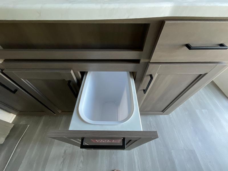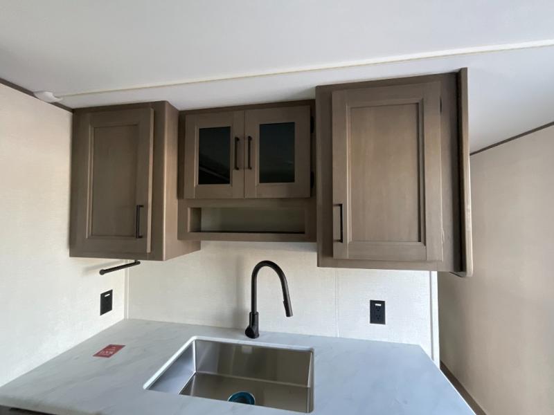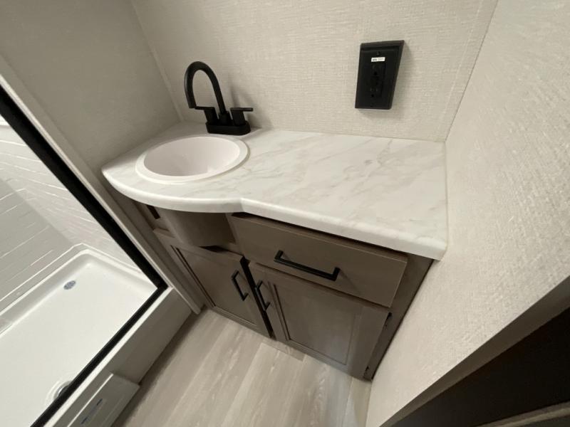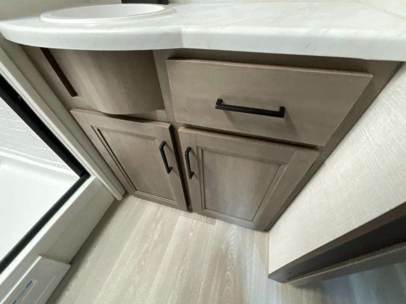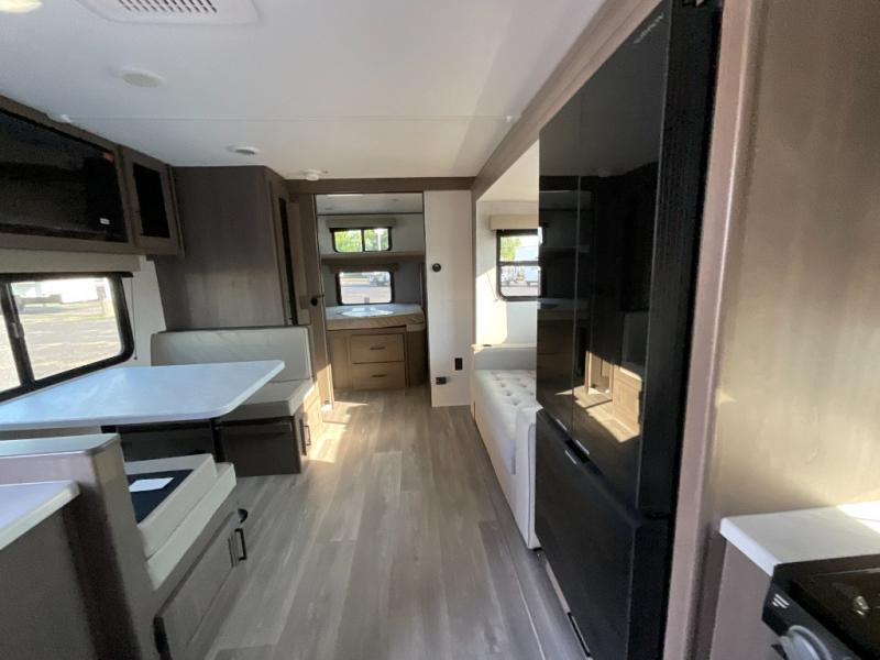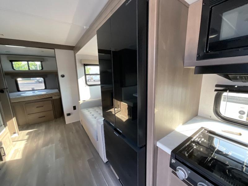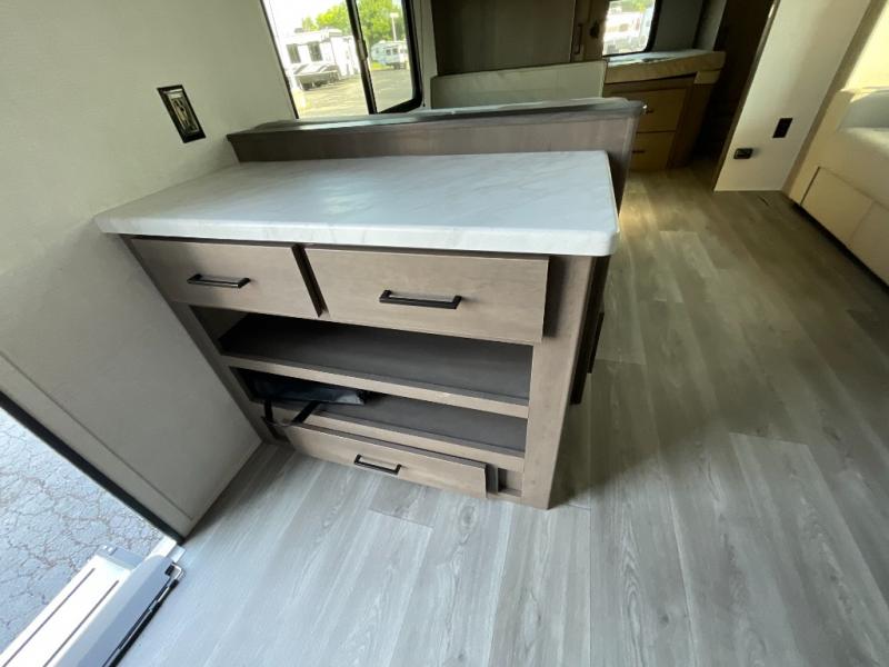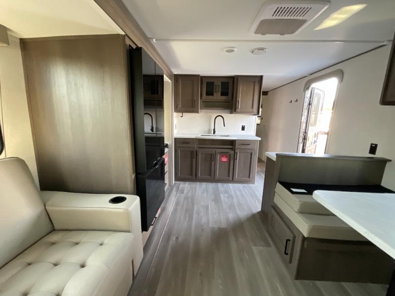 Step inside and discover a spacious main living area enhanced by a large slideout that opens the space for easy movement and relaxation. The cozy seating, booth dinette, and entertainment center create a welcoming hub for meals, movie nights, and downtime. The fully equipped kitchen features residential countertops, a deep stainless-steel sink, premium appliances, and abundant cabinet storage, making mealtime simple whether you're cooking a full dinner or grabbing snacks between adventures.