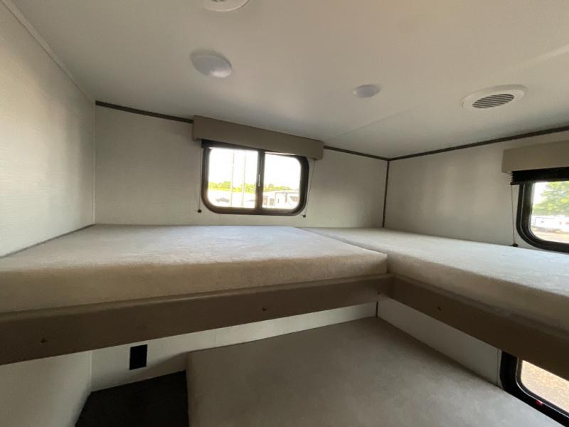 The standout feature of the 295QBT is its large private bunkroom, offering multiple bunks, storage areas, and room for kids or guests to spread out. This separate retreat keeps the main living space organized and comfortable. The front private bedroom includes a walk-around queen bed, dual wardrobes, and overhead cabinets, giving you a relaxing place to unwind at the end of the day. The centrally located bathroom features a roomy shower and practical layout, ensuring comfort and convenience for the whole family.