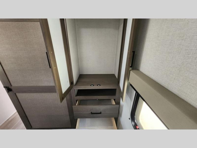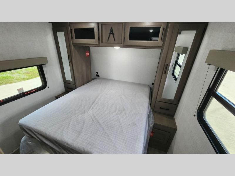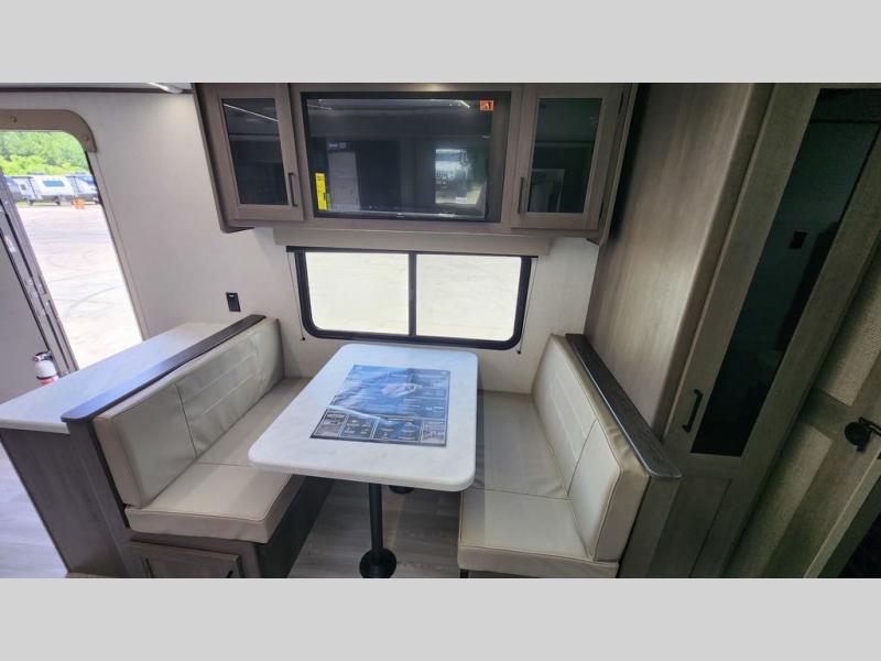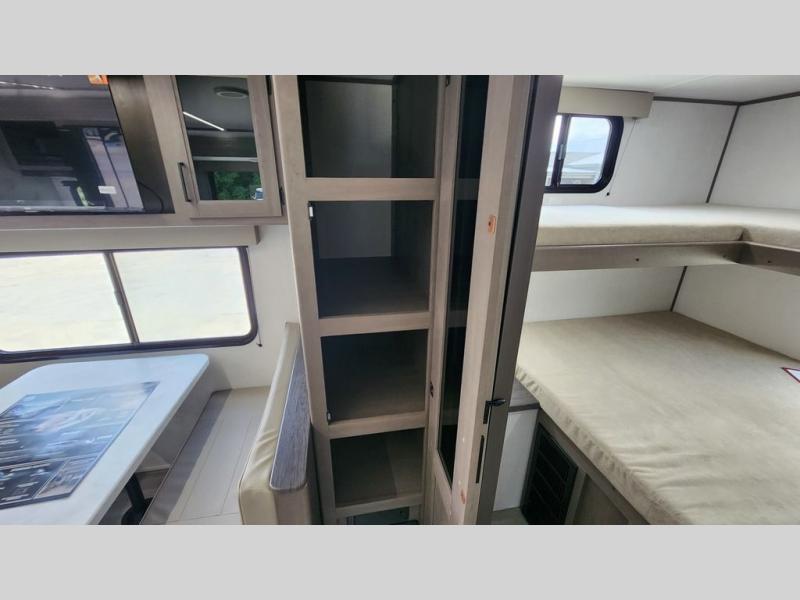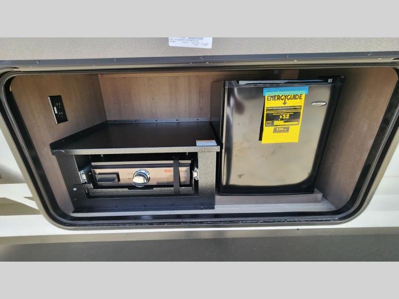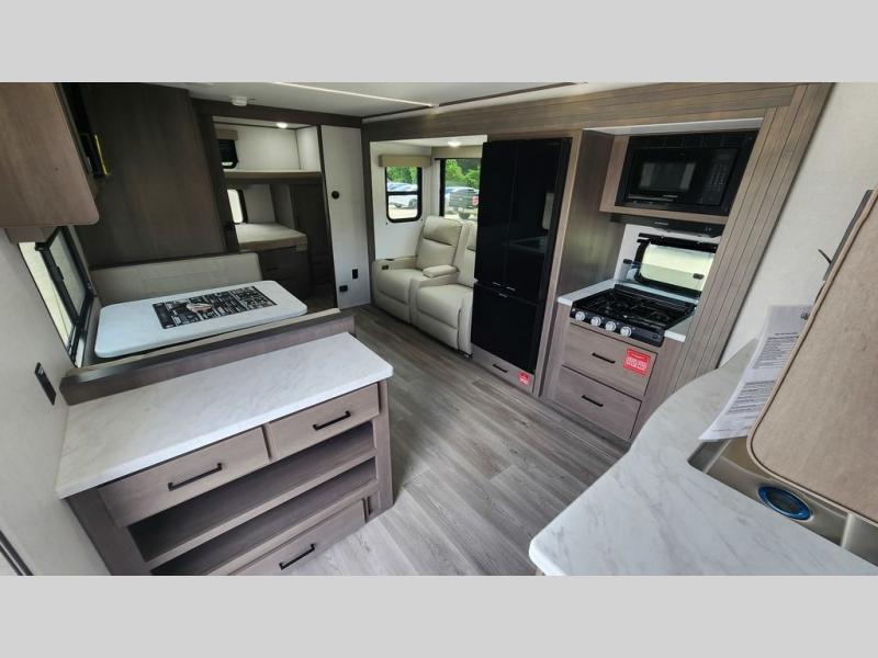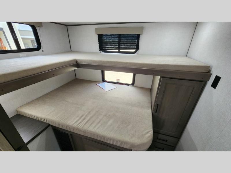You're going to love every minute spent in this Transcend travel trailer! Your guests or the little ones will have the rear bunkhouse all to themselves that includes a residential full-size bed and two bunks, storage drawers, and TV prep if you want to add a television here. You'll enjoy your own space up front in the private bedroom with a queen bed, storage drawers, and TV prep here also. The combined kitchen and living area includes a sleeper sofa with an optional theater seating, a booth dinette where you can dine together, and a 32" TV for movie nights! The exterior is just as accommodating with its 20' awning, rear storage, plus exterior griddle and refrigerator!
