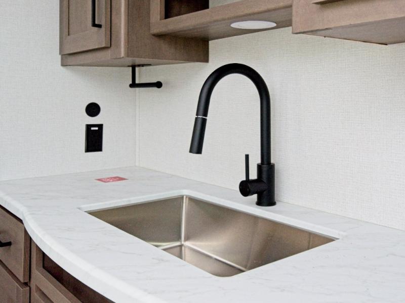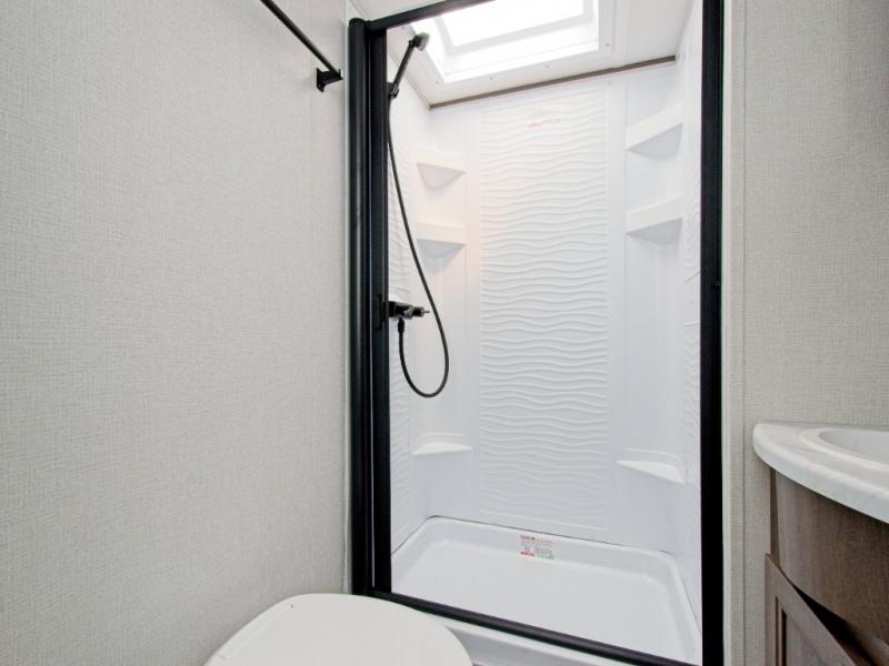 Enjoy seamless thermoformed countertops, 6'6" interior height, a universal docking station, and safety features like the black automotive glass entry door and Safe-T-Rail assist.