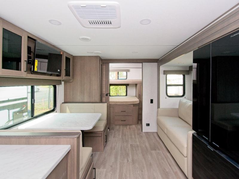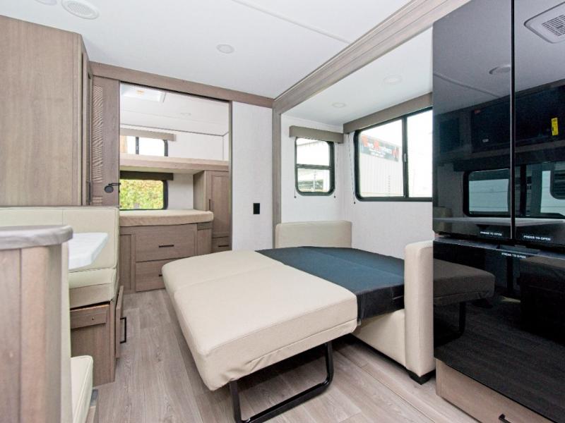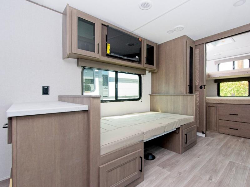 The central living area brings everyone together with a sleeper sofa, booth dinette, and 32" TV—perfect for game nights or weekend streaming. Optional theater seating upgrades the relaxation factor even more.