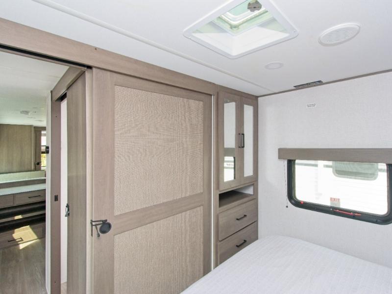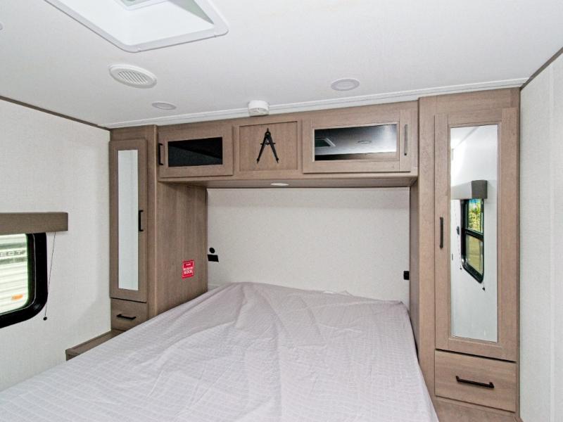 This well-designed travel trailer offers a rear bunkhouse retreat for the kids or guests, complete with storage drawers and TV prep. The private front bedroom delivers comfort with a walk-around queen bed, dual drawers, and extra entertainment options.