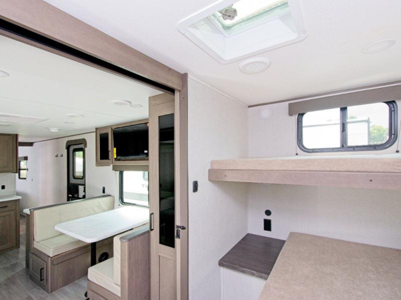 - Private rear bunkhouse with full-size bed and dual bunks