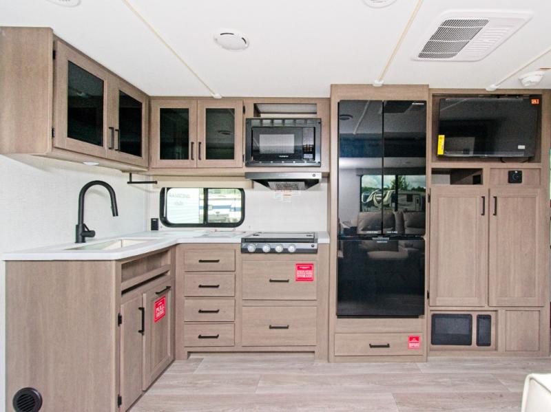 Inside, enjoy a cozy living area with a sleeper sofa, booth dinette, and 32" TV, while the outdoor kitchen setup lets you cook and entertain outside. Whether you're relaxing under the power awning with LED lights or enjoying tunes through the JBL interior and exterior speakers, this trailer makes every moment memorable.