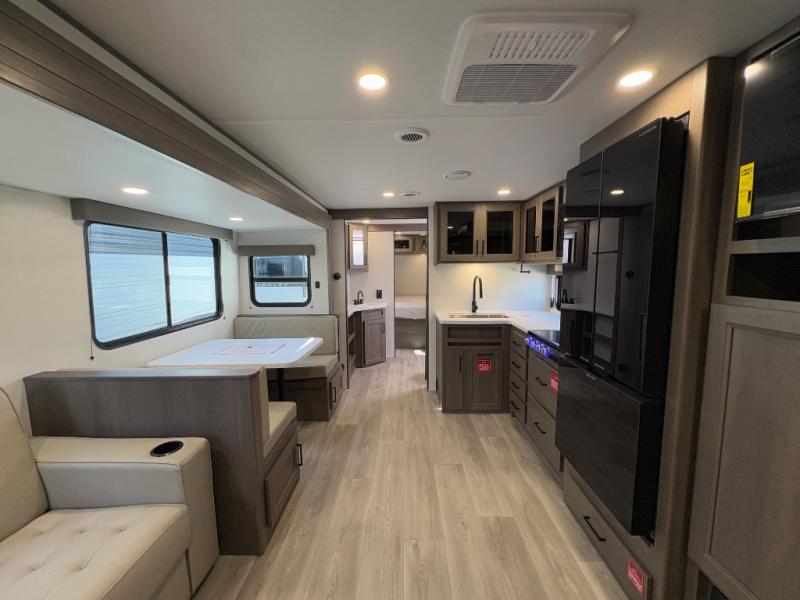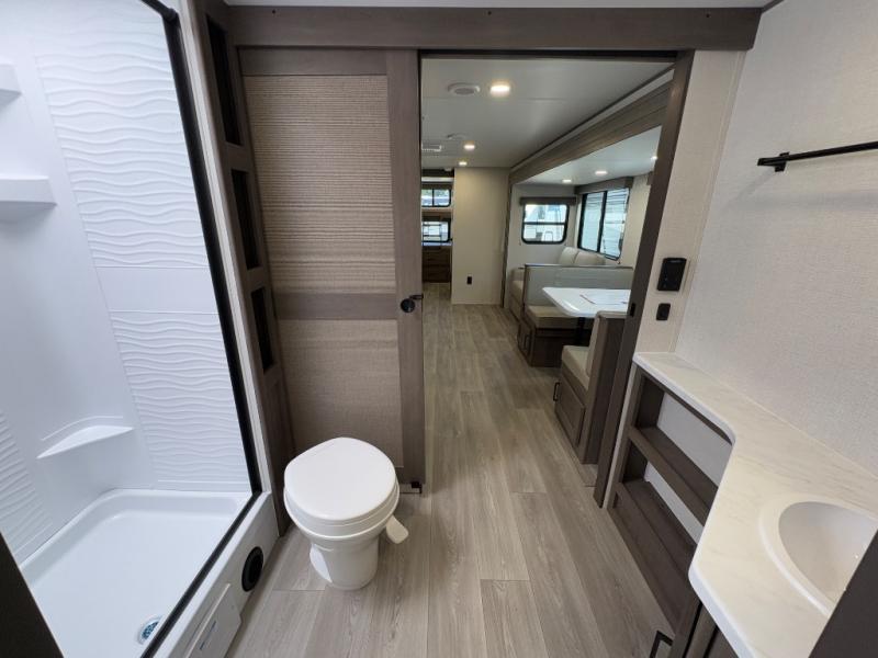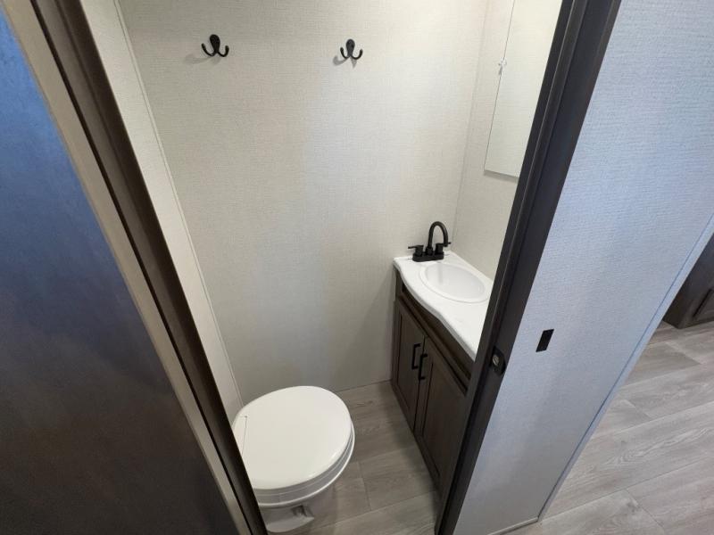Your crew of nine will love camping in this spacious travel trailer! There are four bunks in the rear bunkhouse, along with storage drawers, and a convenient half bath! A full walk-thru bath will create a front master bedroom you are sure to love, especially with its queen bed, wardrobe storage, and private exterior entry door! The main living area will be a favorite place to hang out with its booth dinette, sleeper sofa and 32" TV. If the weather is nice, you may just find yourselves outdoors since there is an exterior griddle and 1.7 cu. ft. refrigerator!