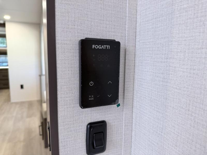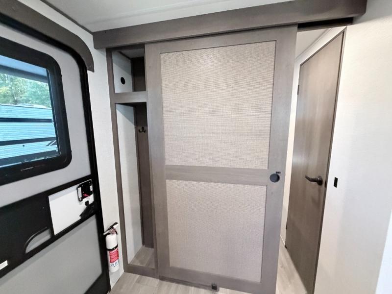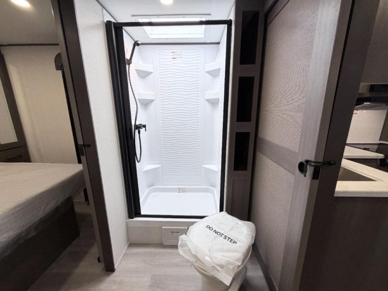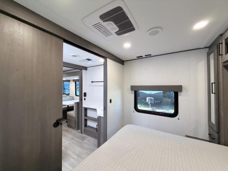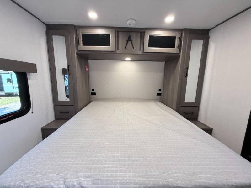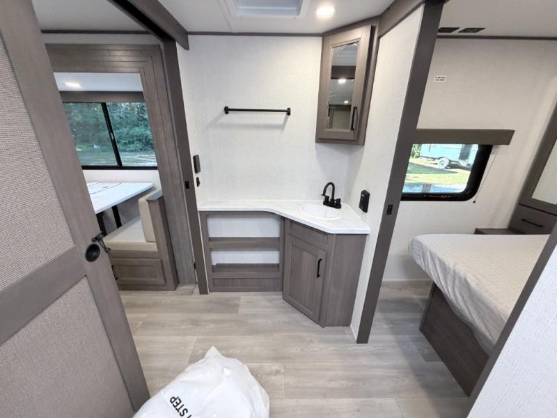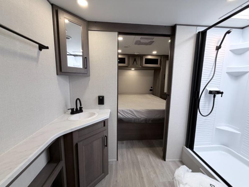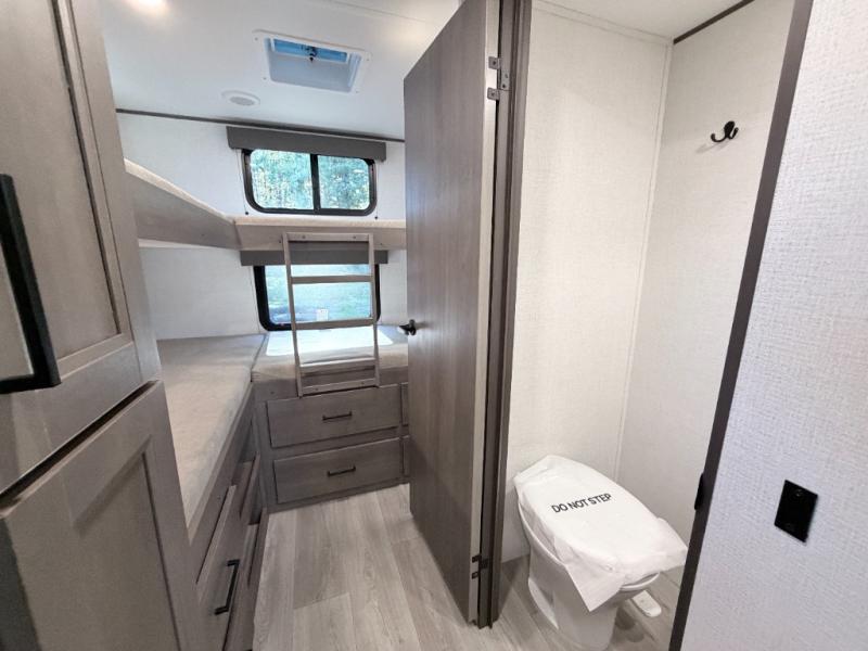 Your crew of nine will love camping in this spacious travel trailer! The rear bunkhouse includes four bunks, built-in storage drawers, and its own half bath for added convenience. The walk-through full bath creates a private front master bedroom, complete with a queen bed, wardrobe storage, and a dedicated exterior entry door.