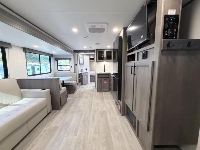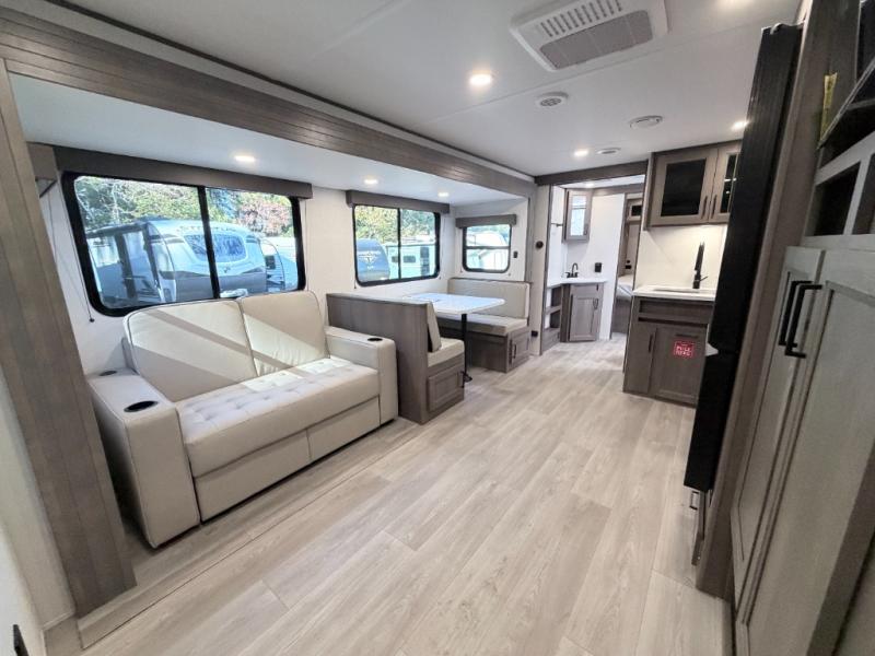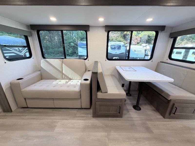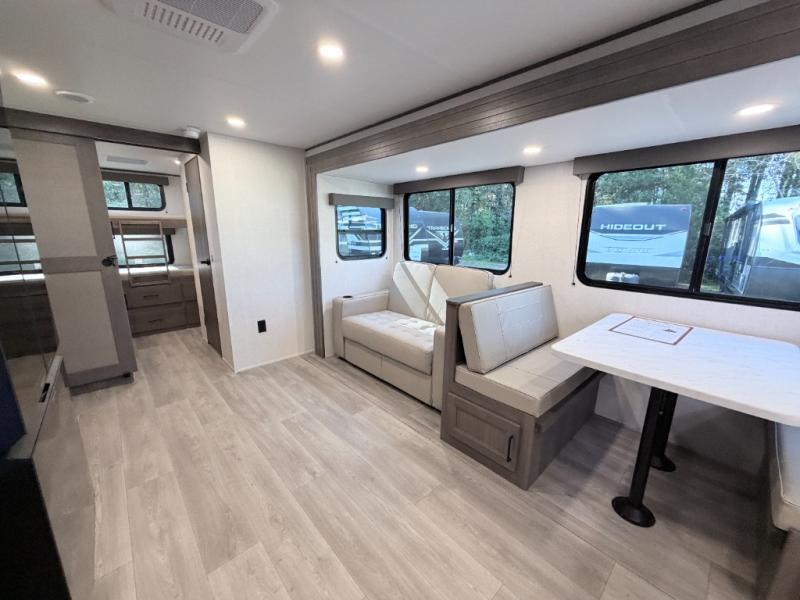 The main living area is a relaxing hangout space featuring a booth dinette, sleeper sofa, and a 32" TV for movie nights or rainy-day entertainment. Dual A/C units ensure the entire trailer stays cool and comfortable throughout the summer.