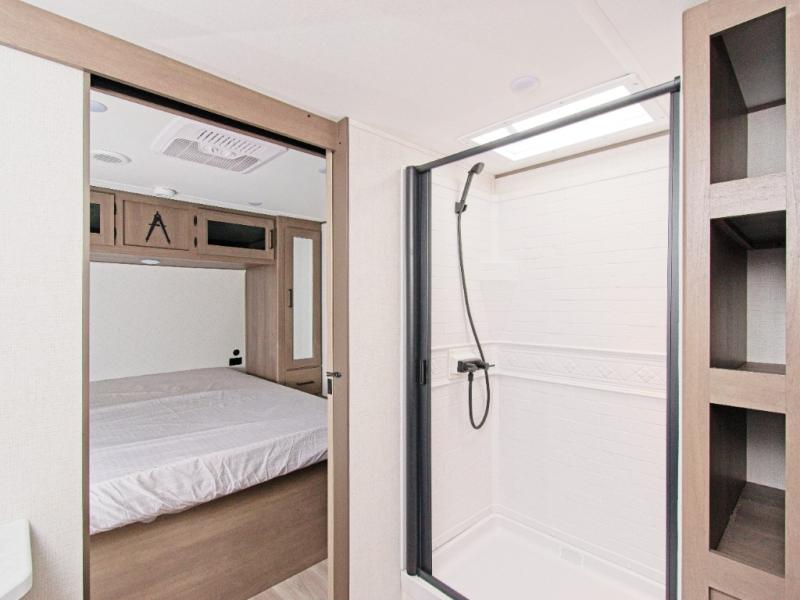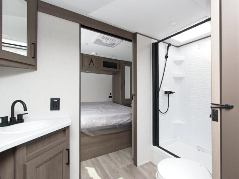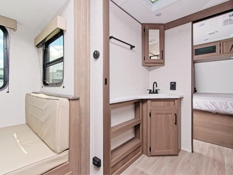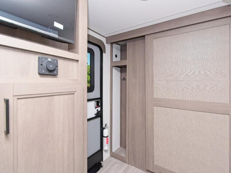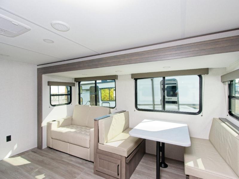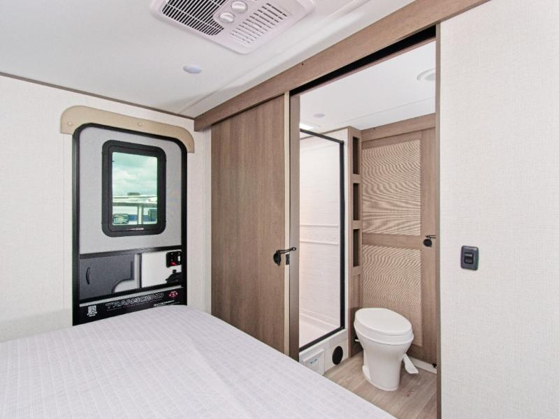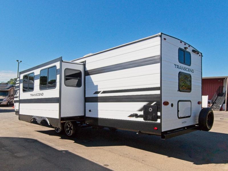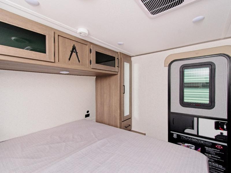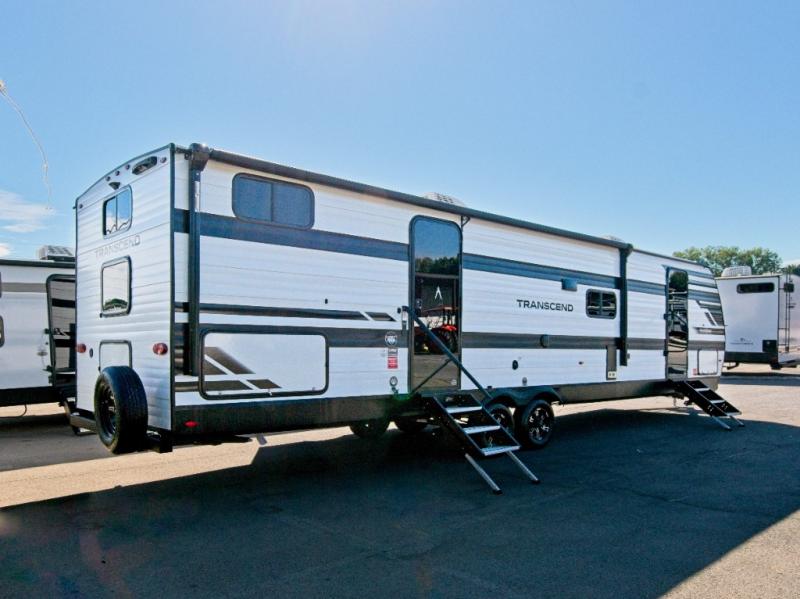 The Transcend 305BHT is designed for families and groups who love to travel in comfort. The rear bunkhouse suite features four spacious bunks, built-in storage drawers, and a private half bath, making it perfect for kids or guests. Up front, the walk-thru bathroom leads to a serene master bedroom with a queen-size bed, dual wardrobes, and its own private exterior entry.