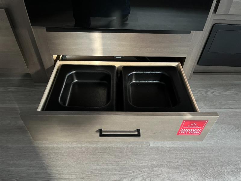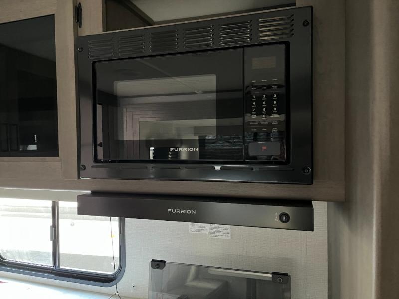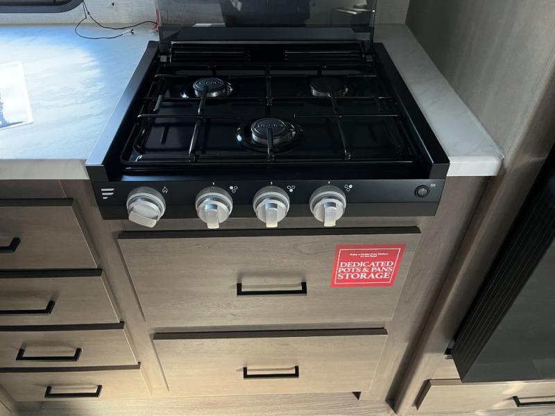 The intuitive kitchen in the Transcend Xplor 305BHT makes meal preparation a joy, whether you’re whipping up breakfast before a day outdoors or cooking dinner for everyone after sunset. Featuring a three-burner cooktop, oven, microwave, spacious refrigerator, and plenty of counter space, this kitchen gives you the tools you need to prepare everything from quick snacks to hearty feasts. With cleverly placed cabinets and drawers, you’ll have room to keep cookware and essentials neatly organized.