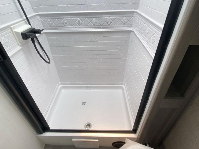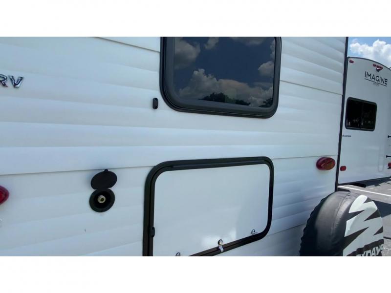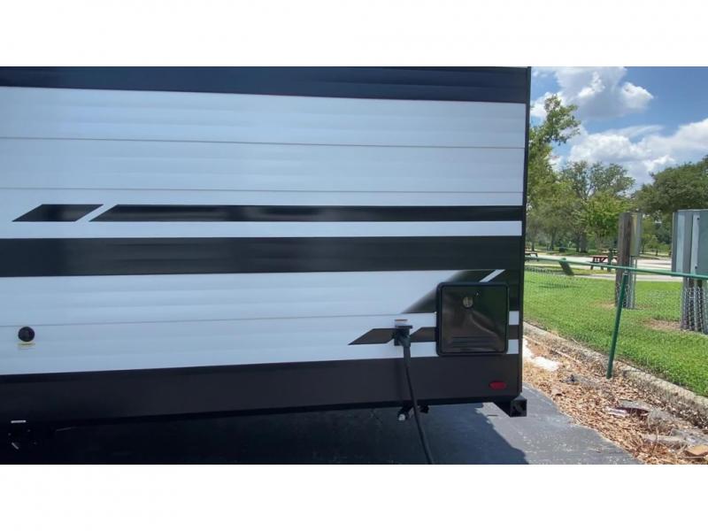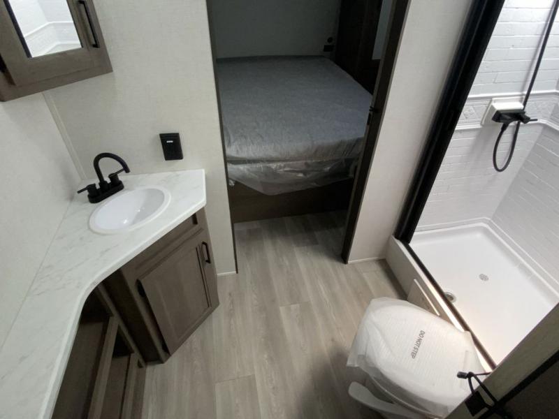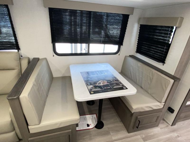 Your crew of nine will love camping in this spacious travel trailer! There are four bunks in the rear bunkhouse, along with storage drawers, and a convenient half bath! A full walk-thru bath will create a front master bedroom you are sure to love, especially with its queen bed, wardrobe storage, and private exterior entry door! The main living area will be a favorite place to hang out with its booth dinette, sleeper sofa and 32" TV. If the weather is nice, you may just find yourselves outdoors since there is an exterior griddle and 1.7 cu. ft. refrigerator!