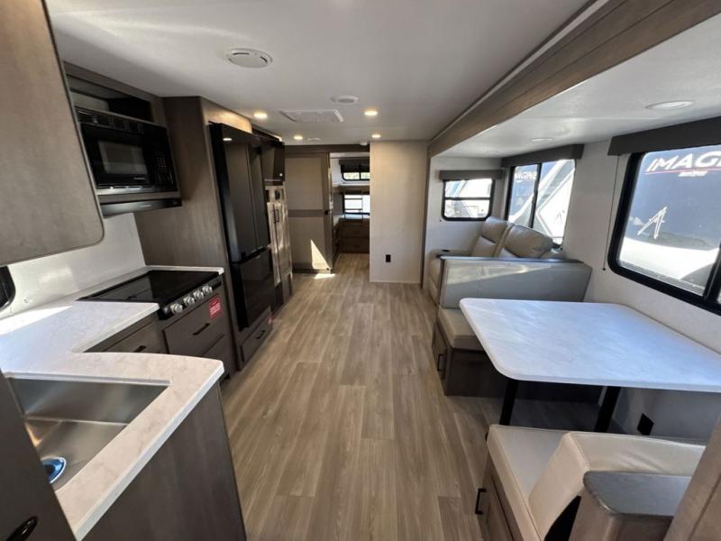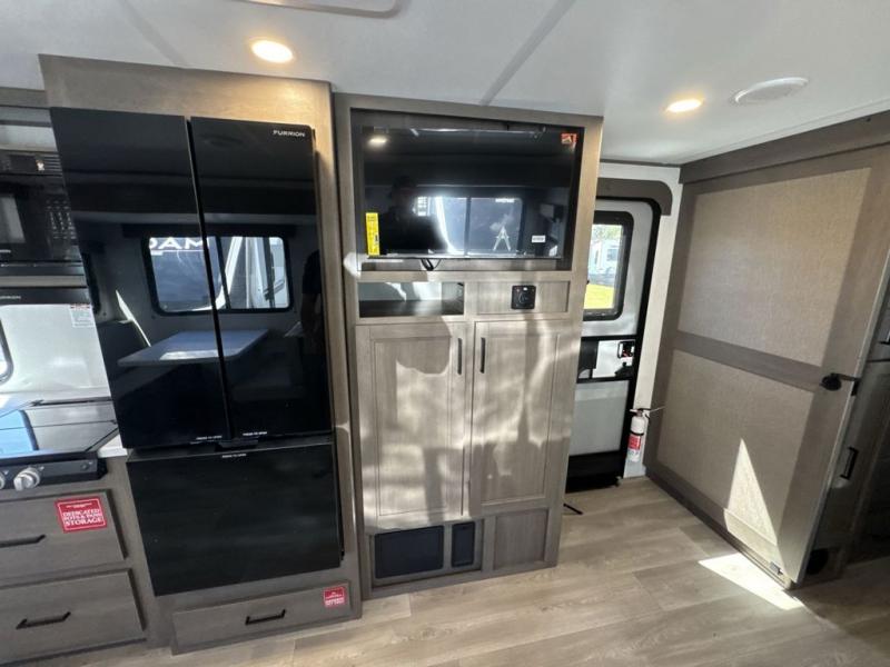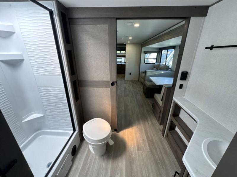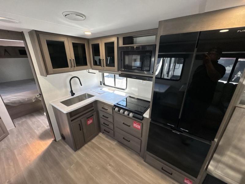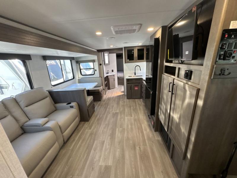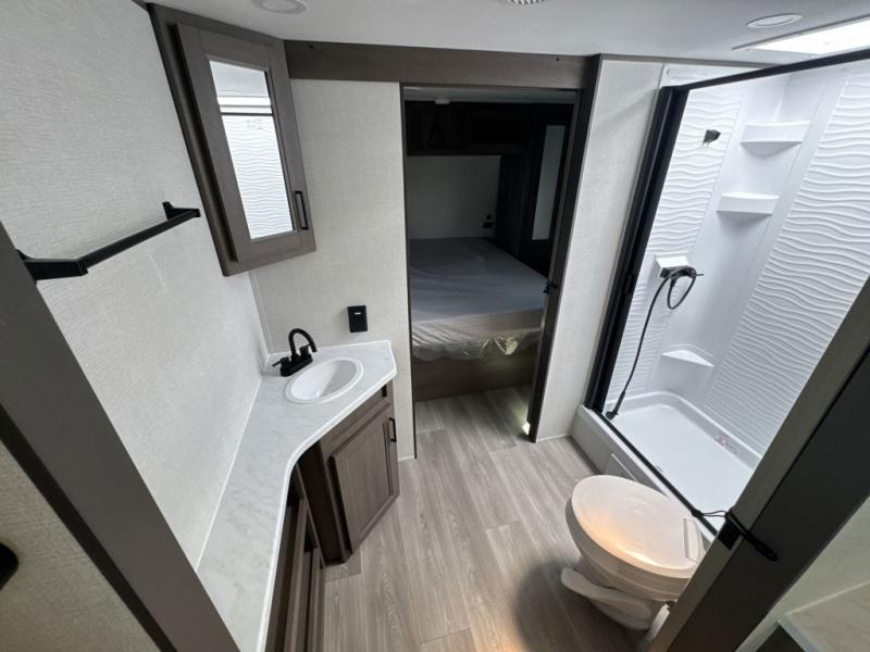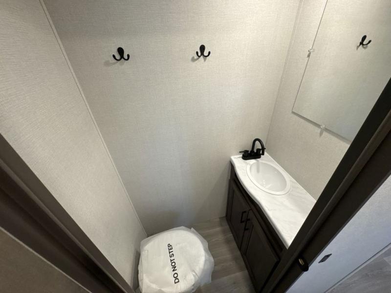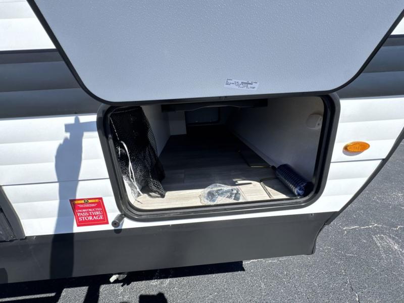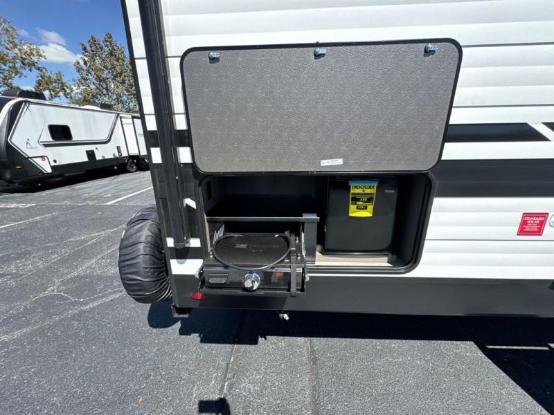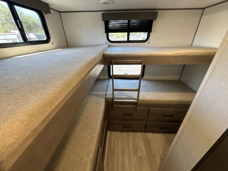 Your crew of nine will love camping in this spacious travel trailer! There are four bunks in the rear bunkhouse, along with storage drawers, and a convenient half bath! A full walk-thru bath will create a front master bedroom you are sure to love, especially with its queen bed, wardrobe storage, and private exterior entry door! The main living area will be a favorite place to hang out with its booth dinette, sleeper sofa and 32" TV. If the weather is nice, you may just find yourselves outdoors since there is an exterior griddle and 1.7 cu. ft. refrigerator!