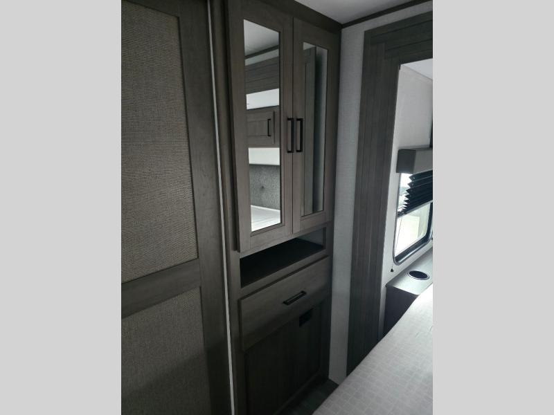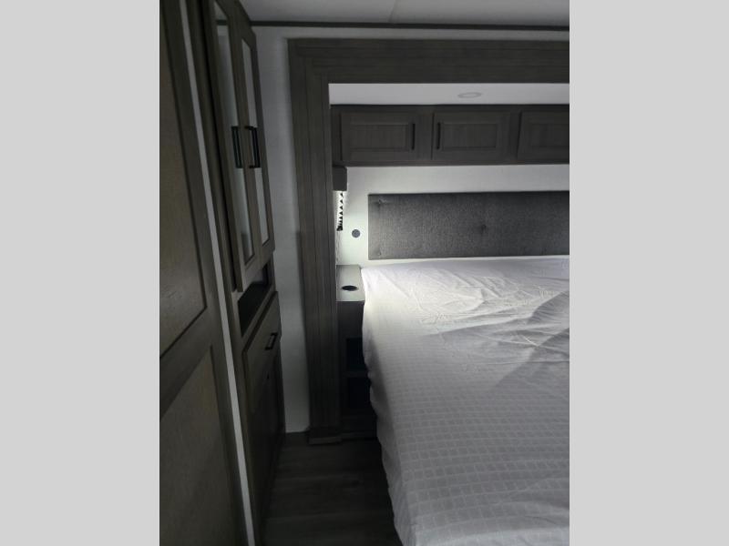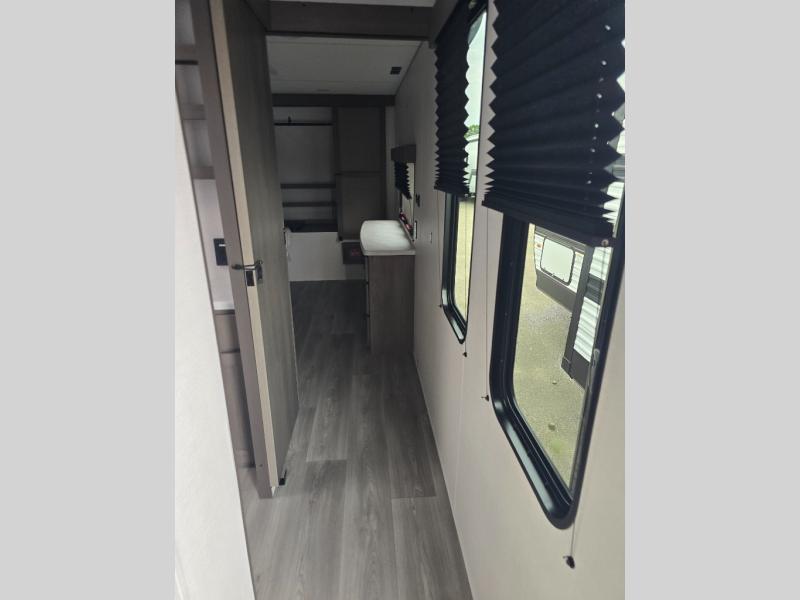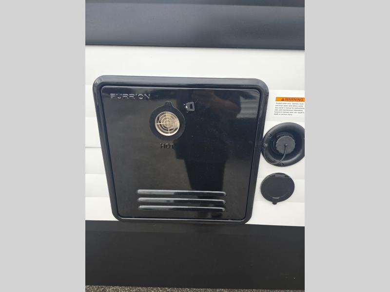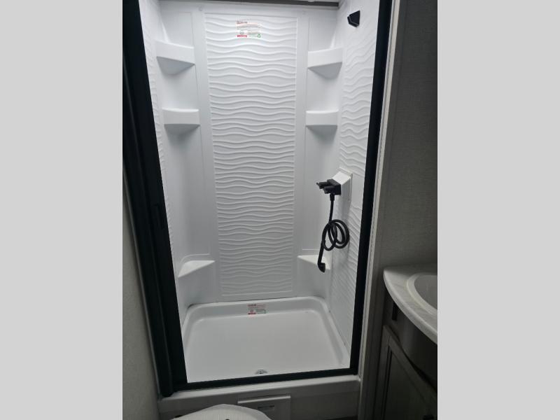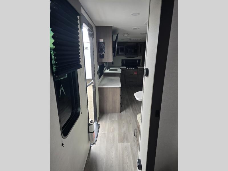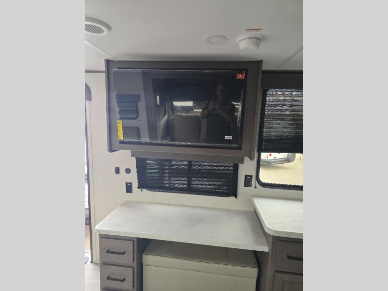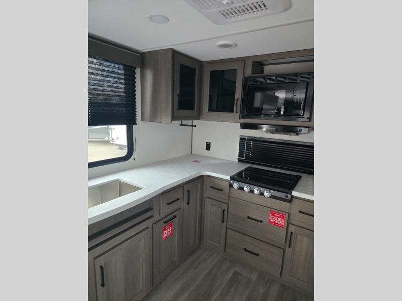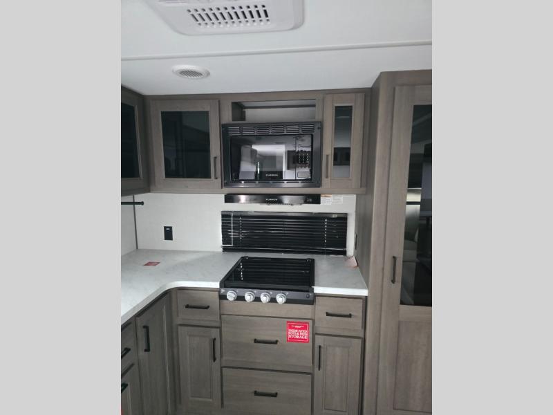 If you're looking for a cozy travel trailer for two, this is the one! You can sleep soundly each night on the king bed slide out, and you'll find plenty of storage in the front wardrobe. There is even washer and dryer prep if you choose to add those appliances. After you've freshened up in the full bath with a walk-in shower, you can head to the rear kitchen to make breakfast. There is ample counter space here, along with a three burner range and an air fryer/convection microwave, plus a pull-out trash can for easy clean up. The breakfast nook provides a fun place to dine together, and if you're needing additional sleeping space you can switch it out for the optional sleeper sofa. A theater seating slide also provides tons of comfort, especially since it's in perfect view of the 32" TV! This model also includes an exterior griddle with a 1.7 cu. ft. refrigerator, protected by the 21' power awning so you can cook in the shade!