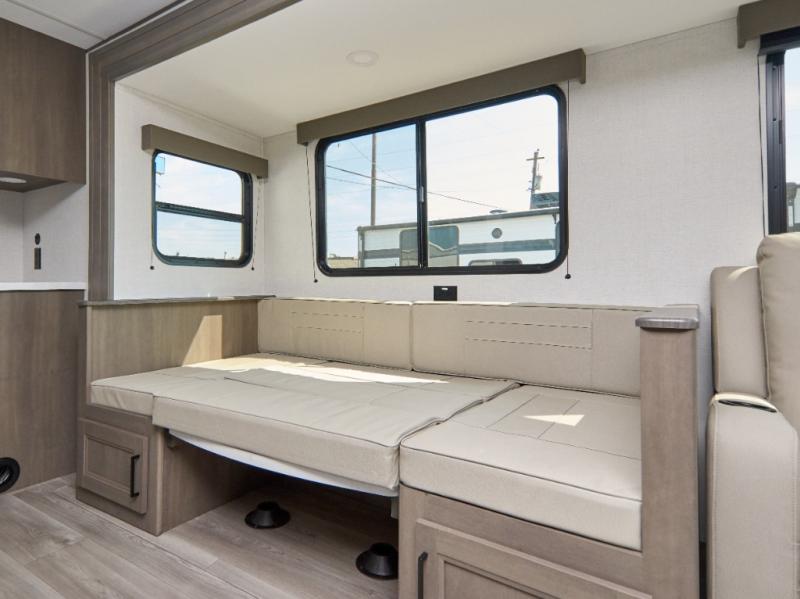 Inside, enjoy a bright and open living area with panoramic windows, seamless countertops, and a 6'6" interior height that makes the space feel expansive. The kitchen is designed for easy meal prep, whether you're cooking indoors or grilling outside under the power awning with LED lighting.