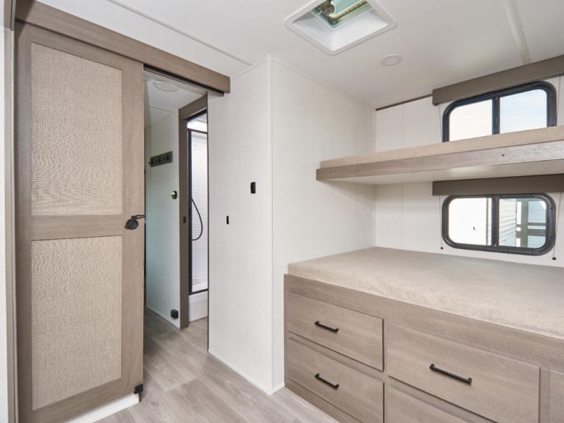 - Rear Private Bunkhouse with three bunks, sleeper sofa, and storage drawers