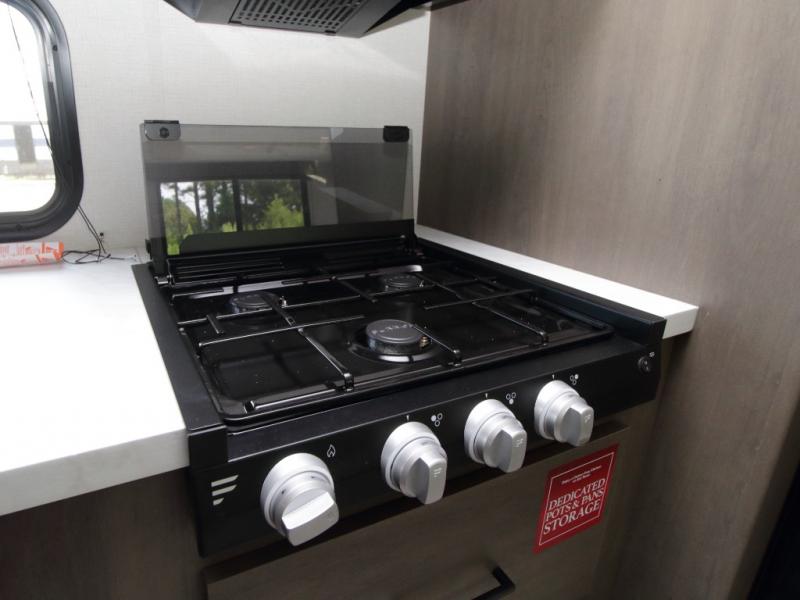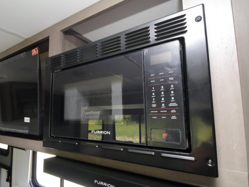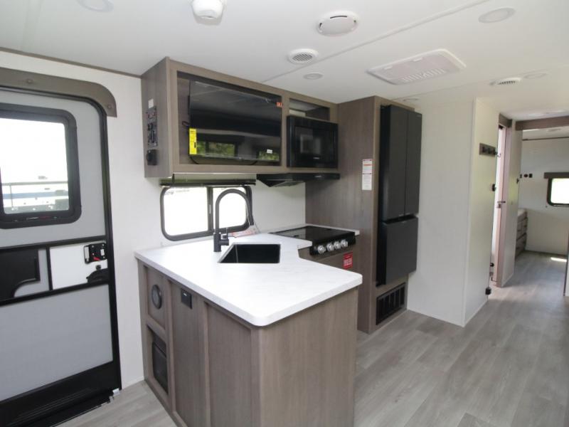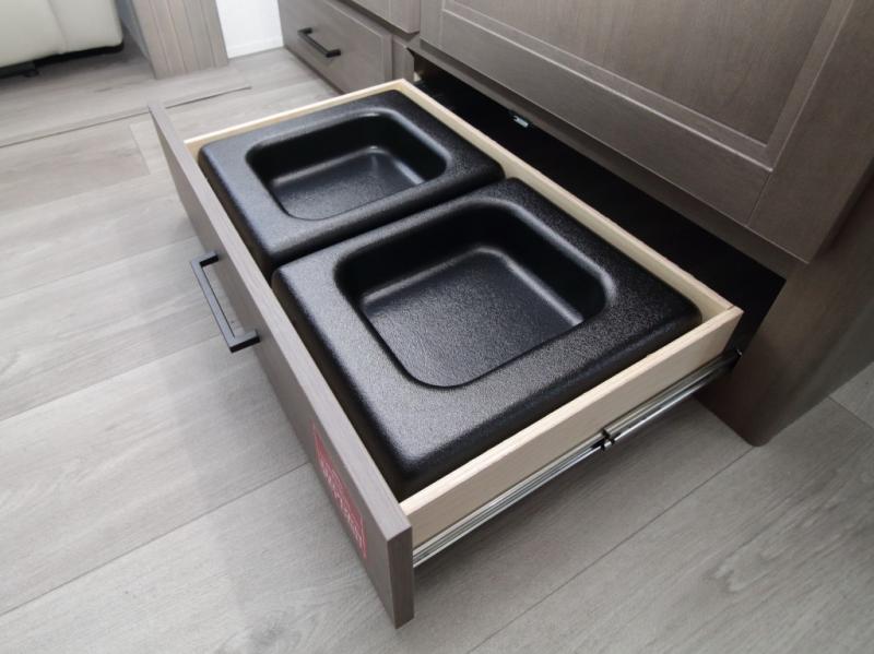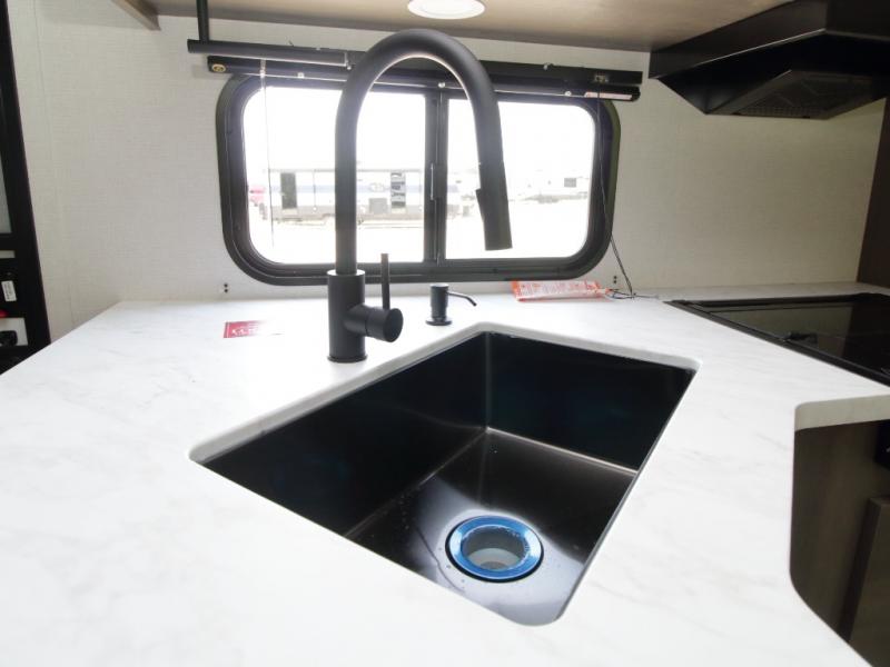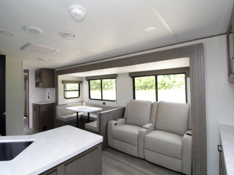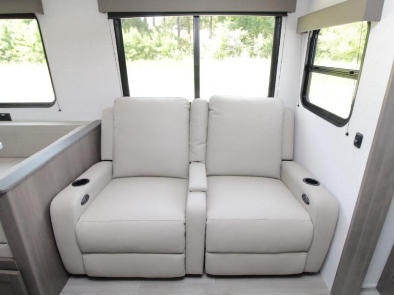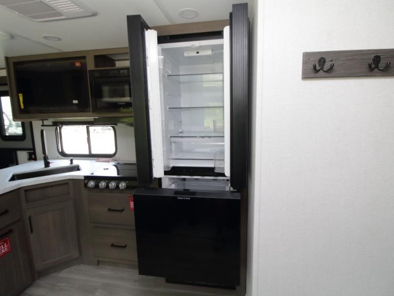 The main living area includes a U-shaped dinette and 60" sleeper sofa, or choose optional theater seating if you prefer added comfort over sleeping space. A 12V French door refrigerator with glass front, convection microwave/air fryer, and three-burner range make mealtime easy, and you’ll love the option to cook outdoors on the griddle and refrigerator station.