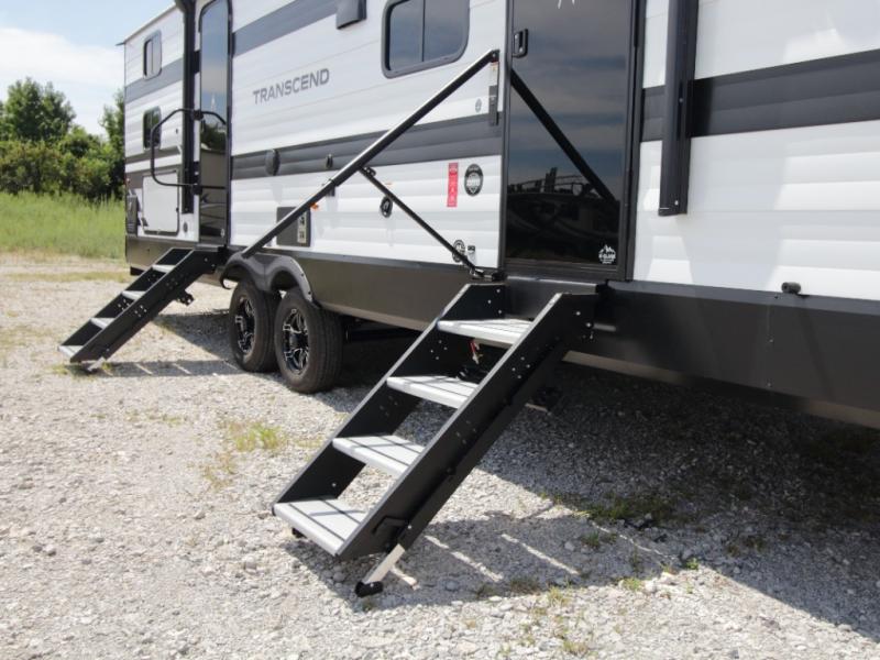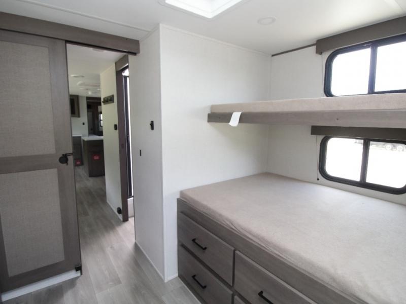 Bring the whole crew along in the Grand Design Transcend 325BHT, a spacious travel trailer designed for large families and group camping. The rear bunkhouse offers sleeping for up to five with three bunks, a sleeper sofa, and storage drawers.