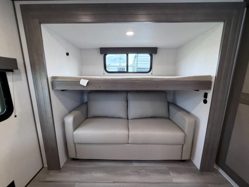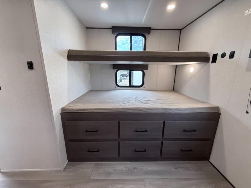 - Rear private bunkhouse with multiple bunks and sleeper sofa