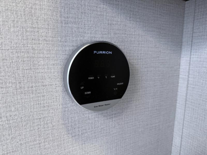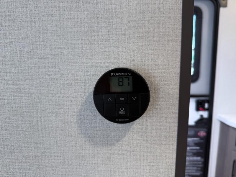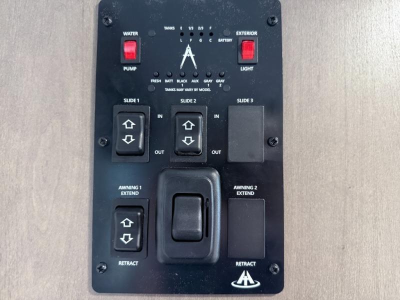 - Exterior Features: Quad Seal technology, heated/enclosed underbelly, suspended tanks, black automotive glass entry door, Safe-T-Rail assist handle, backup camera prep, universal docking station, power awning with LED strip lights.