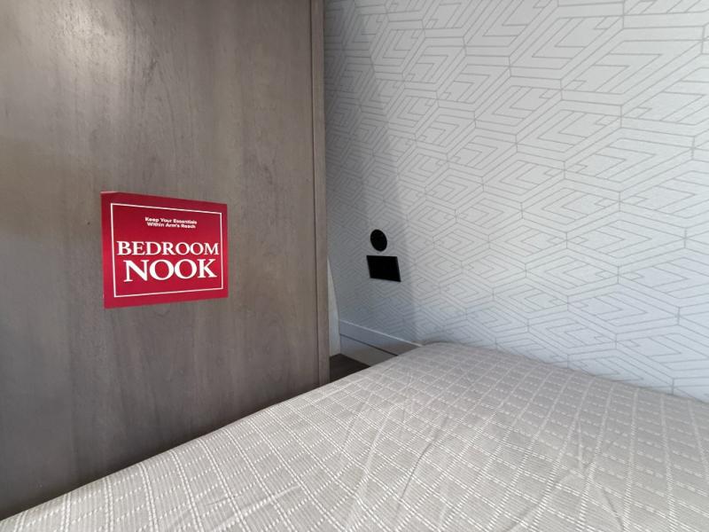 - Bedroom: Front queen bed, storage compartments, convenient laundry chute.