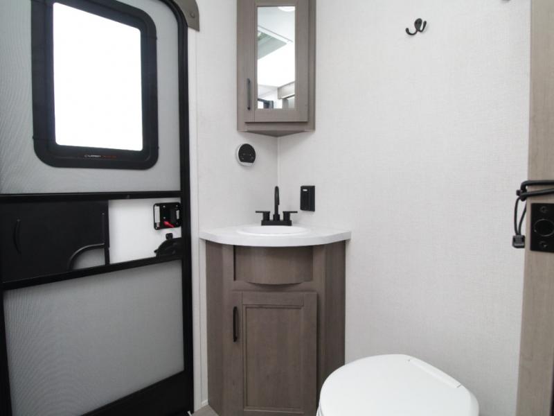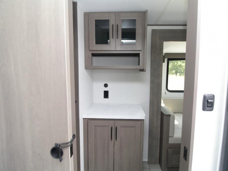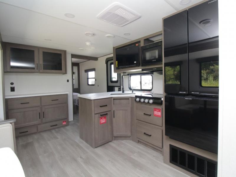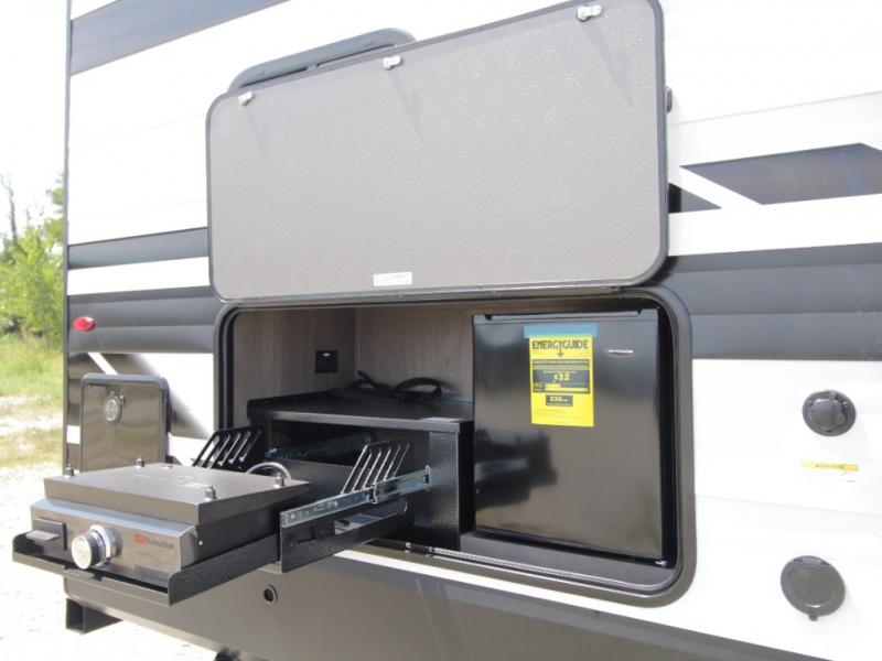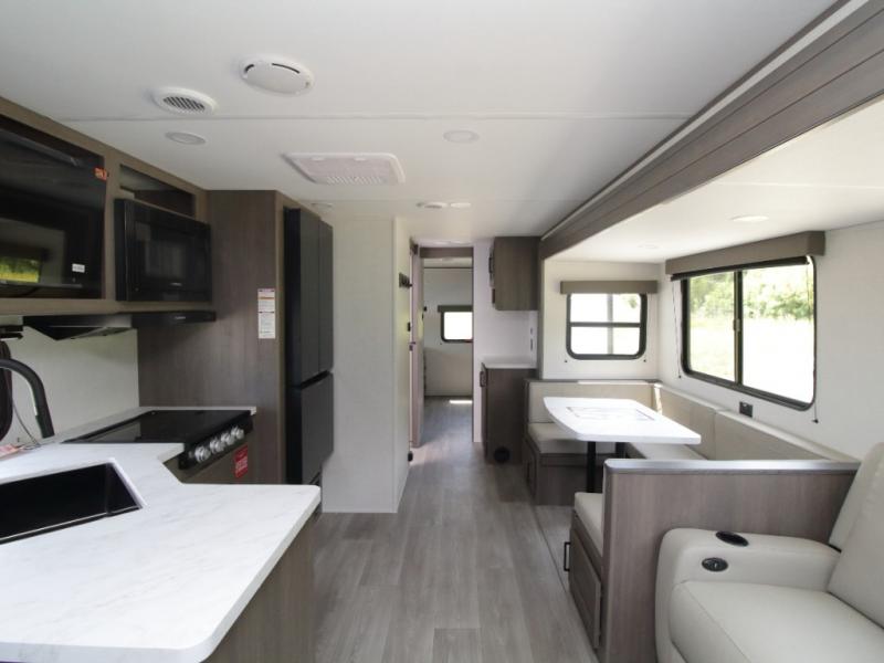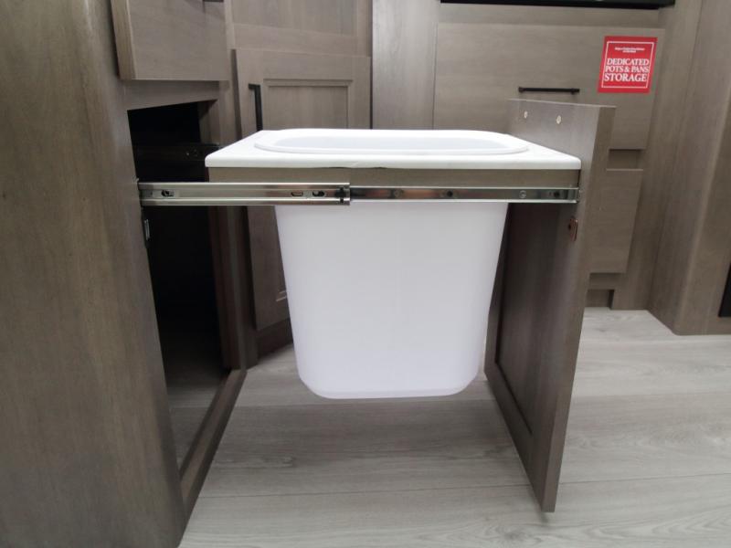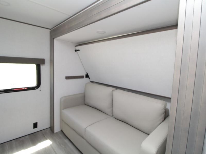 The main living area includes a U-shaped dinette and 60" sleeper sofa, or choose optional theater seating if you prefer added comfort over sleeping space. A 12V French door refrigerator with glass front, convection microwave/air fryer, and three-burner range make mealtime easy, and you’ll love the option to cook outdoors on the griddle and refrigerator station.