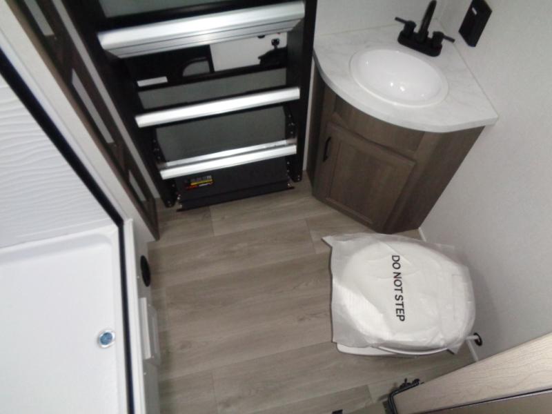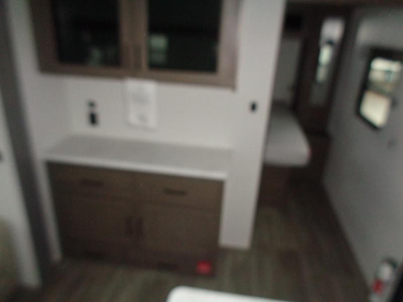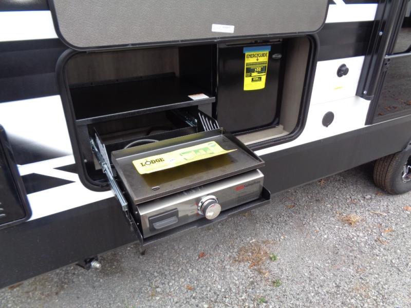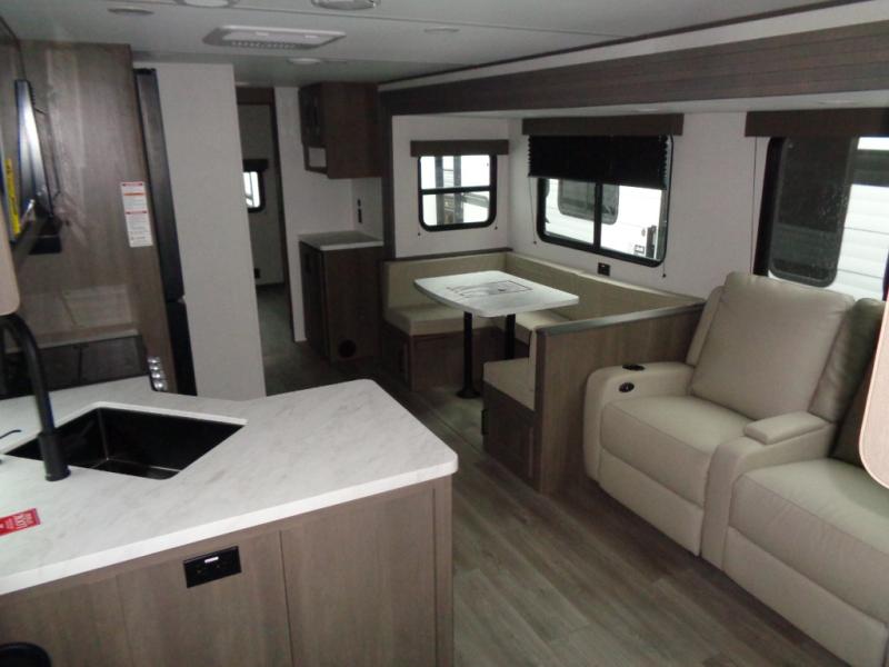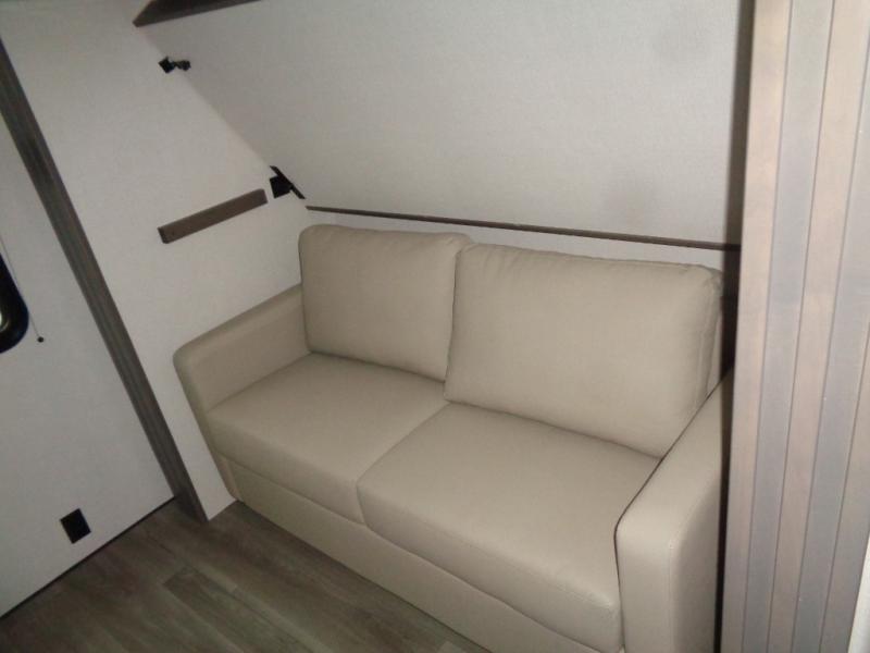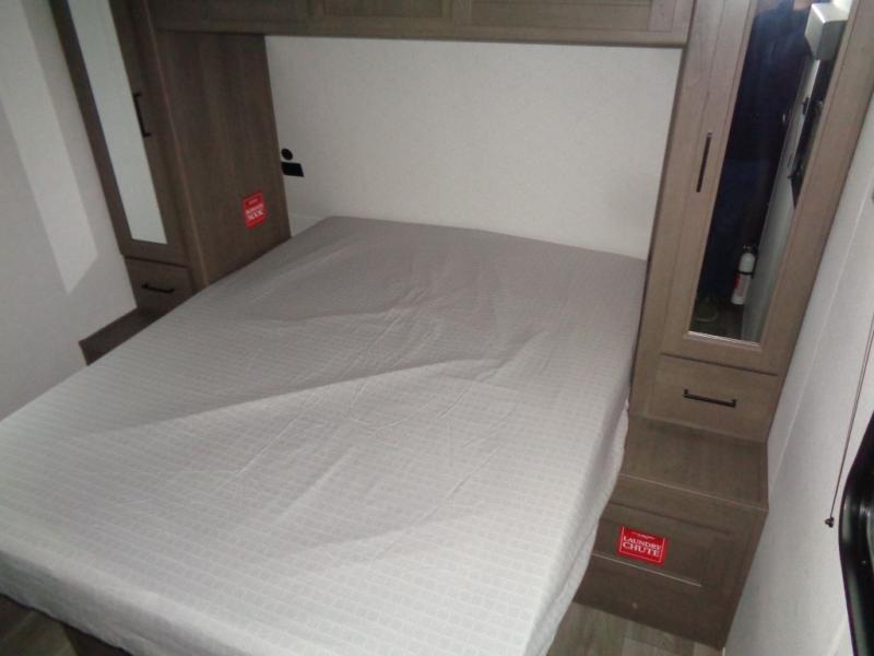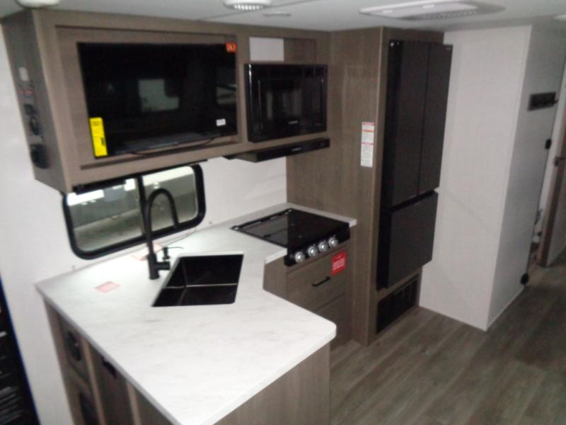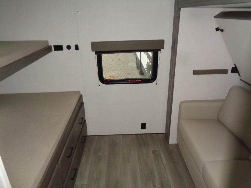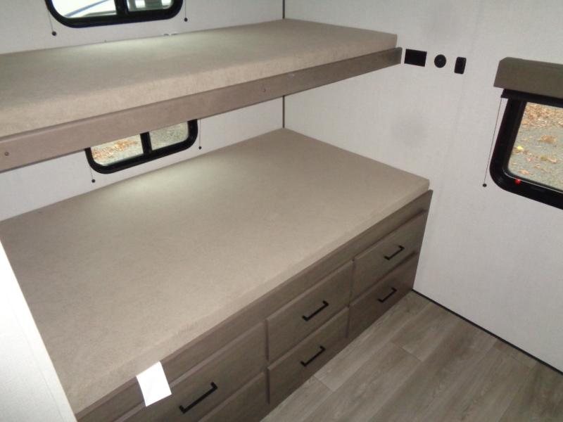 If you're looking for a travel trailer that can house your whole gang, this unit is the one! The rear private bunkhouse can sleep up to five since there is a sleeper sofa and three bunks, plus there are storage drawers for your guests' things. A front private bedroom will be perfect for the owners with a queen bed, storage space, and a convenient laundry chute! Whether you cook outside on the exterior griddle or inside on the three burner range, you'll be able to make your best meals. There is also a 12V French door refrigerator with a glass front and bottom freezer and a convection microwave/combo air fryer for easy meals! A U-shaped dinette and 60" sleeper sofa within the living room slide provides even more seating and sleeping space, or you can choose the optional theater seat in place of the sofa if you're not needing the extra sleeping space!